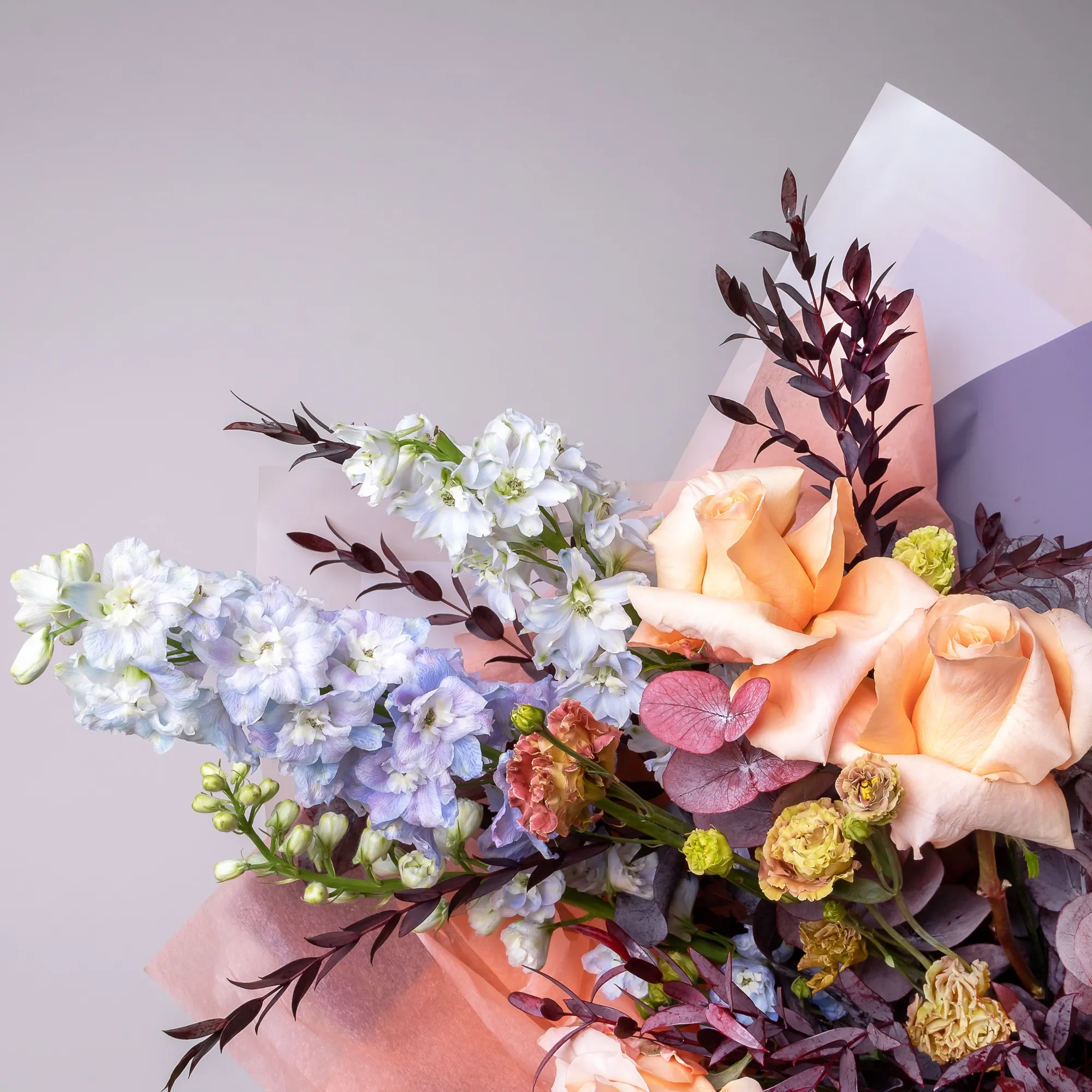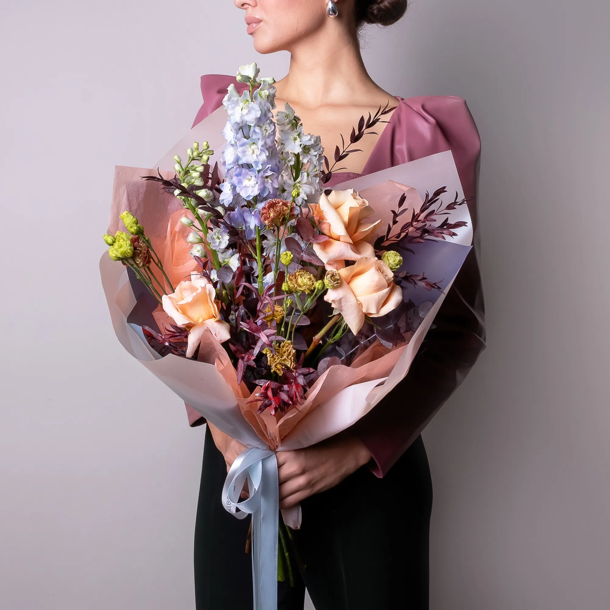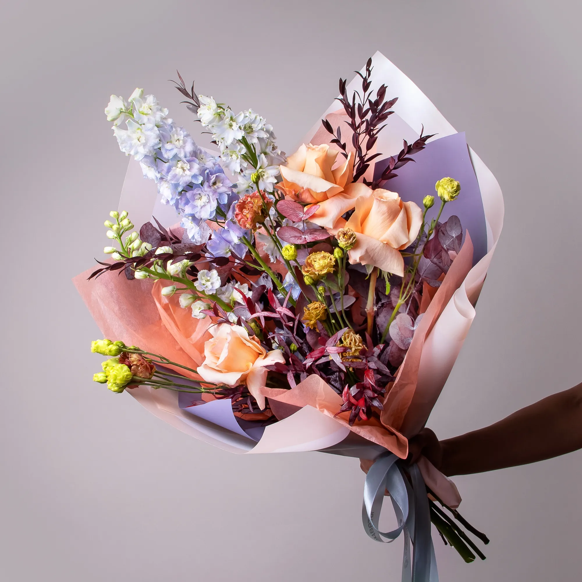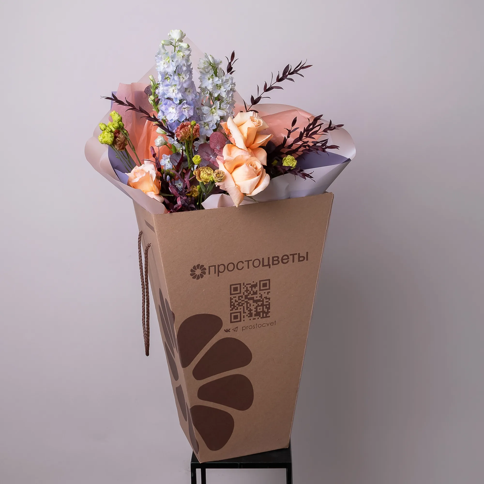 Букет дополнен декоративной упаковкой фиолетового, голубого и персикового цветов, а также длинной брендированной лентой.