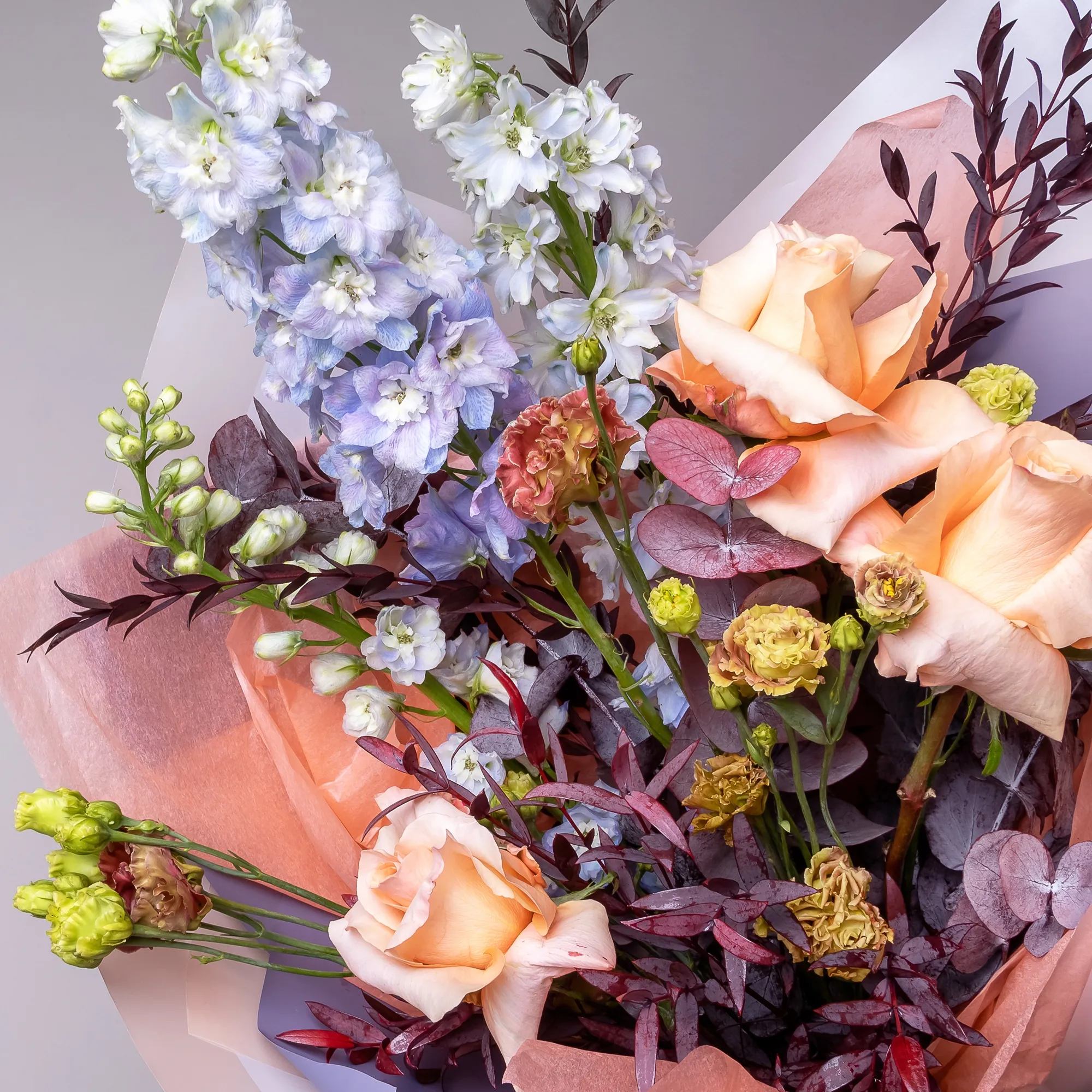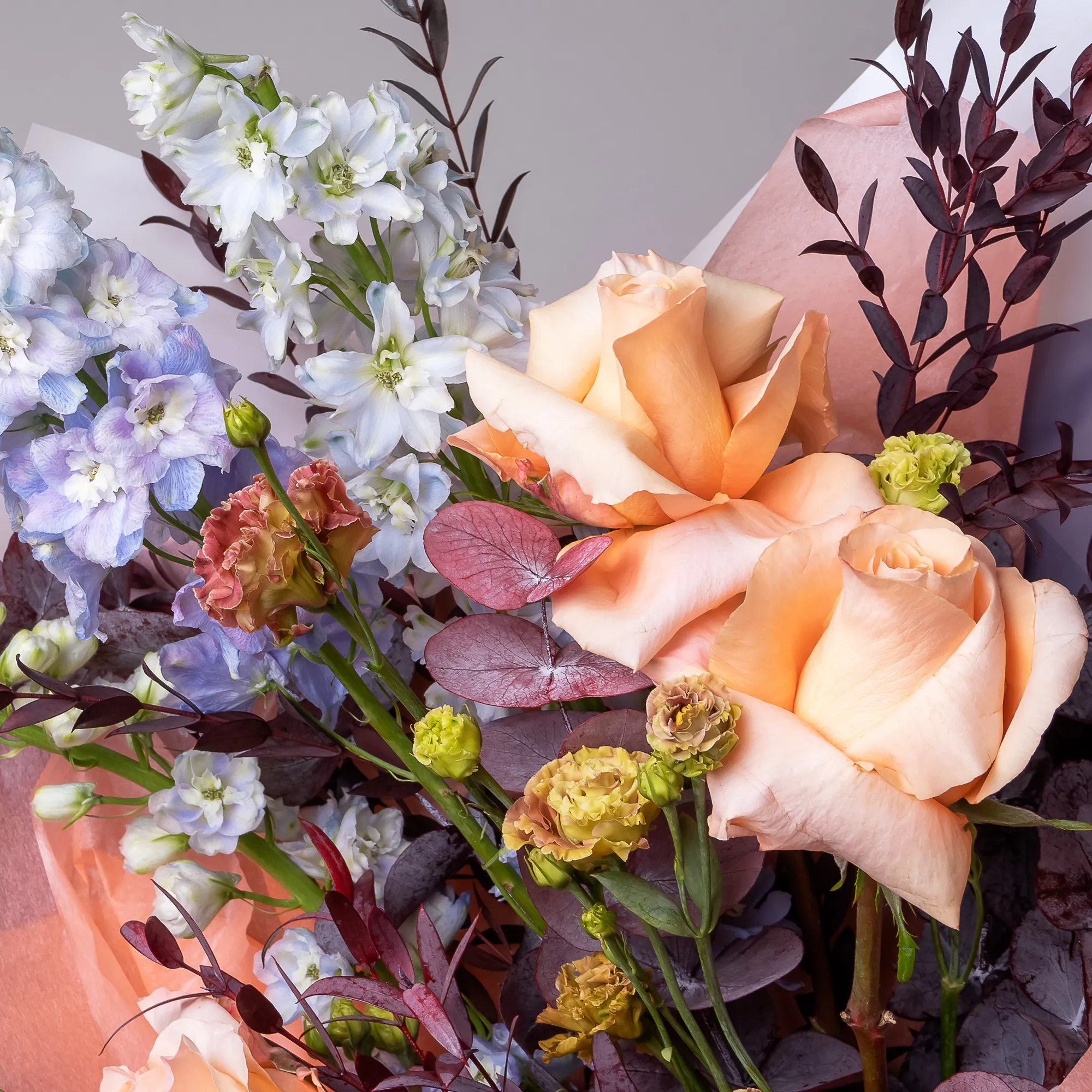 Цветовая гамма букета богата необычными сочетаниями и визуальными контрастами. В составе голубой дельфиниум, шоколадный лизиантус, бежево-оранжевая роза сорта "Шиммер", а также крашеные листья эвкалипта, добавляющие изюминку общей композиции.