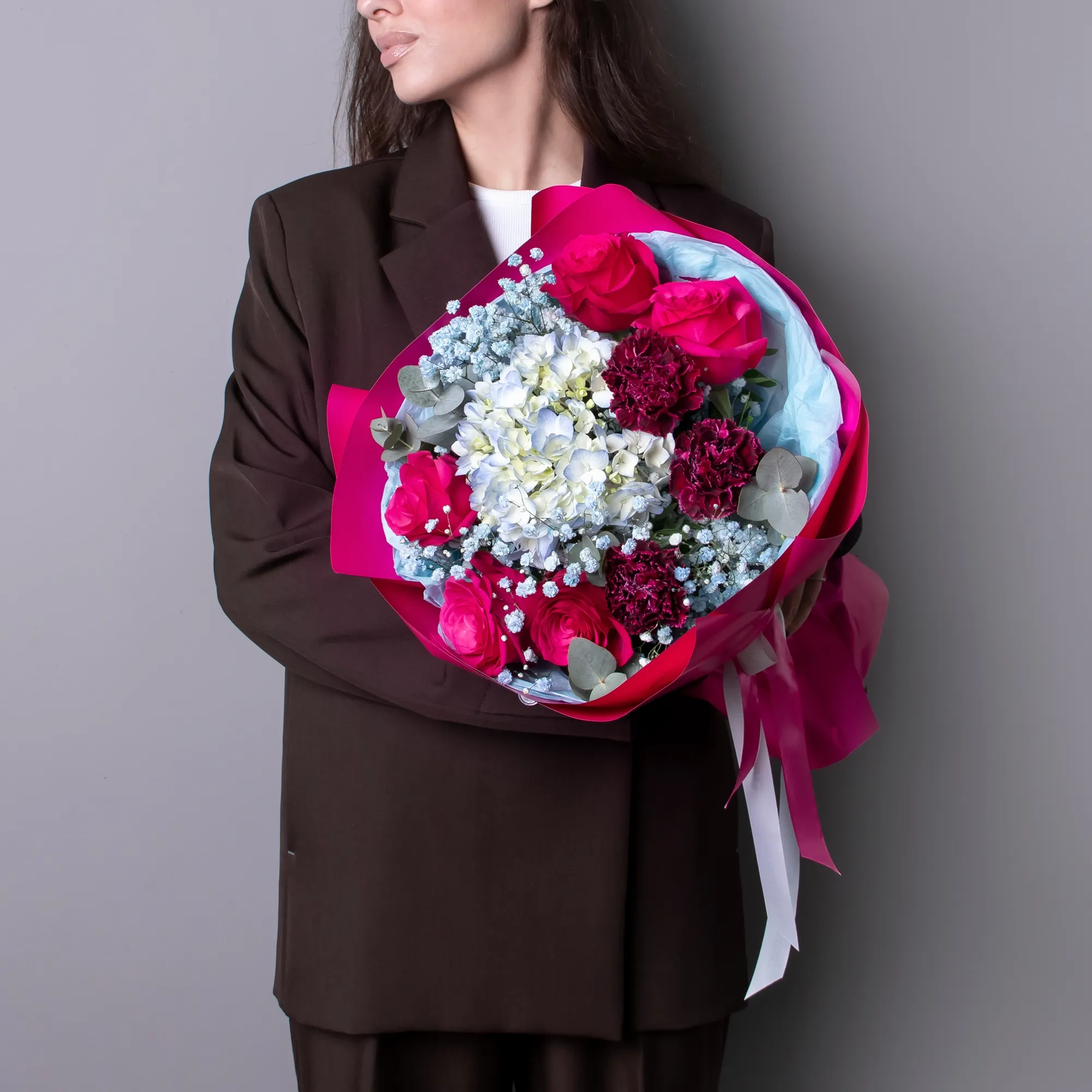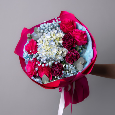 Гвоздика-3, Гортензия-1, Роза-5, Гипсофила-3, Листья фисташки-3, Листья эвкалипта-5