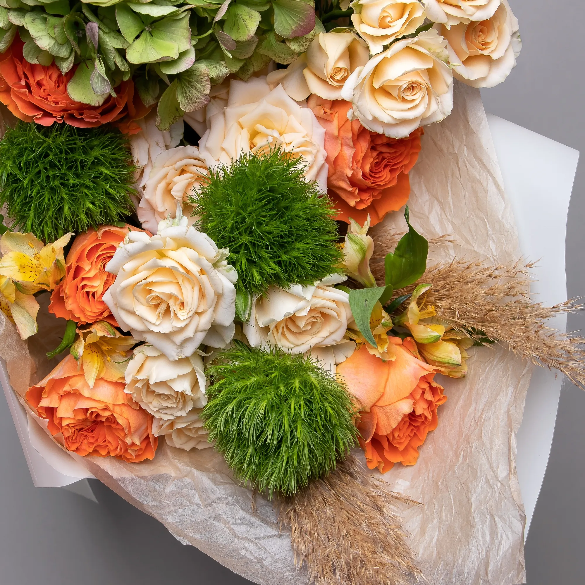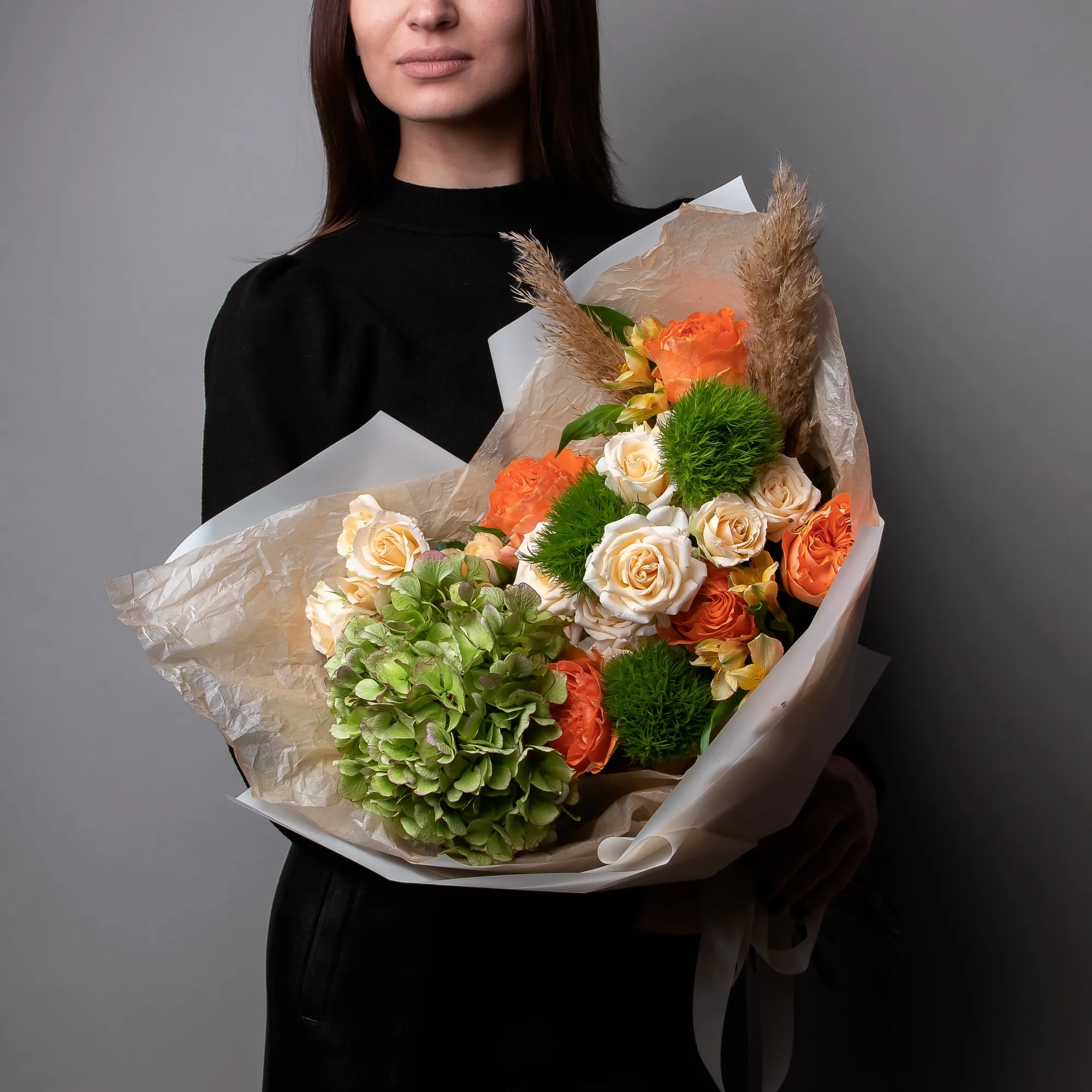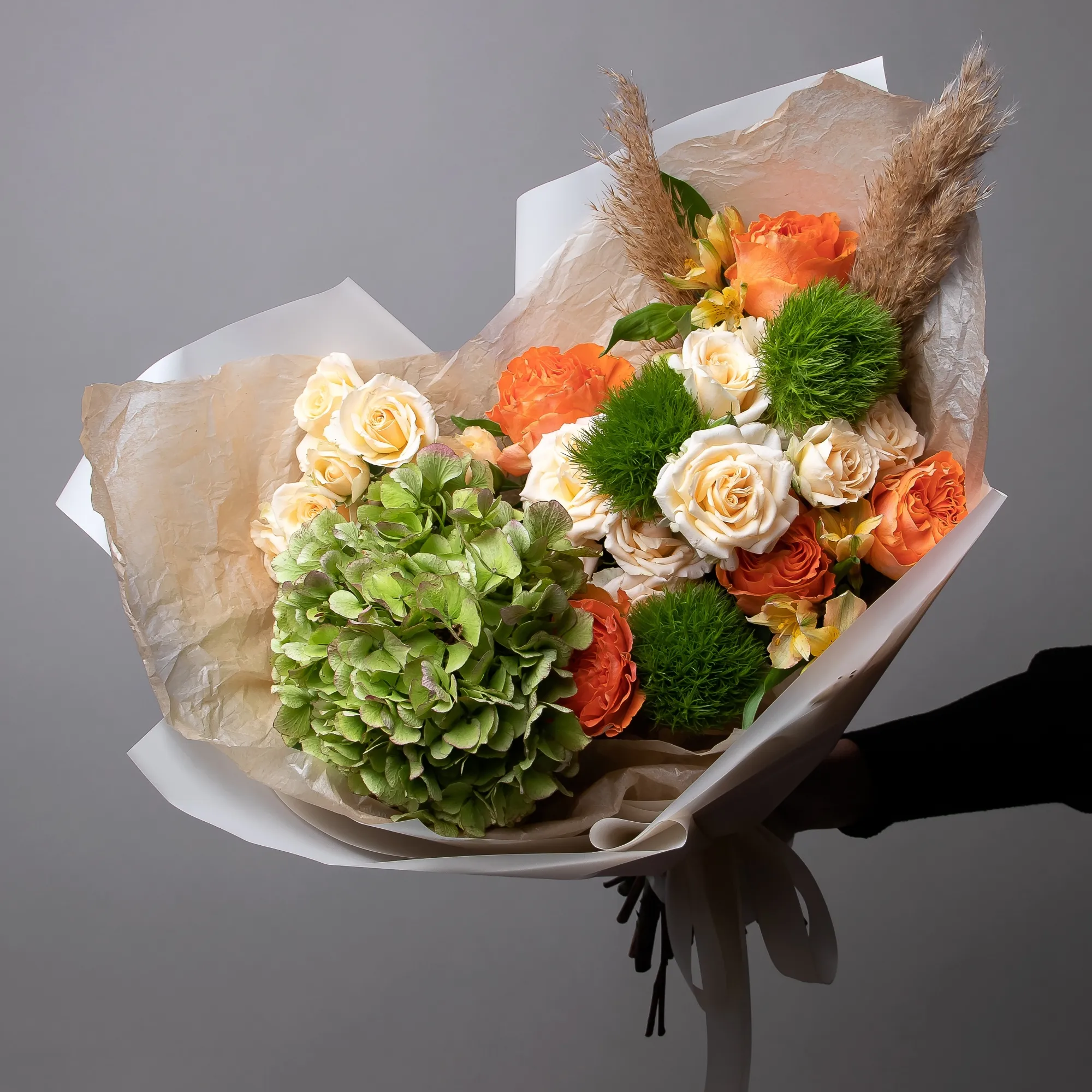 Гвоздика-3, Гортензия-1, Роза-5, Альстромерия-2, Роза кустовая-3, Листья фисташки-5, Сухоцвет-2