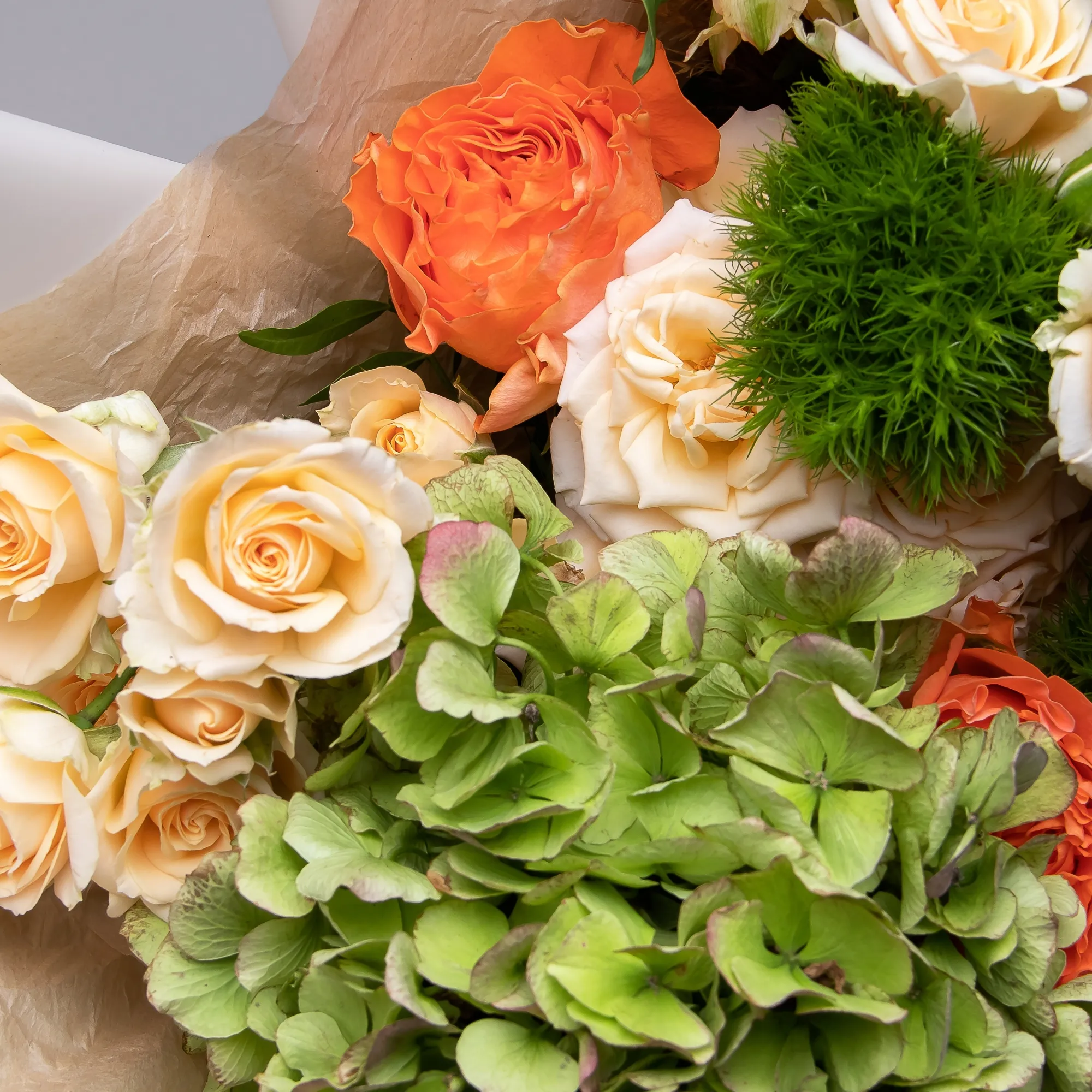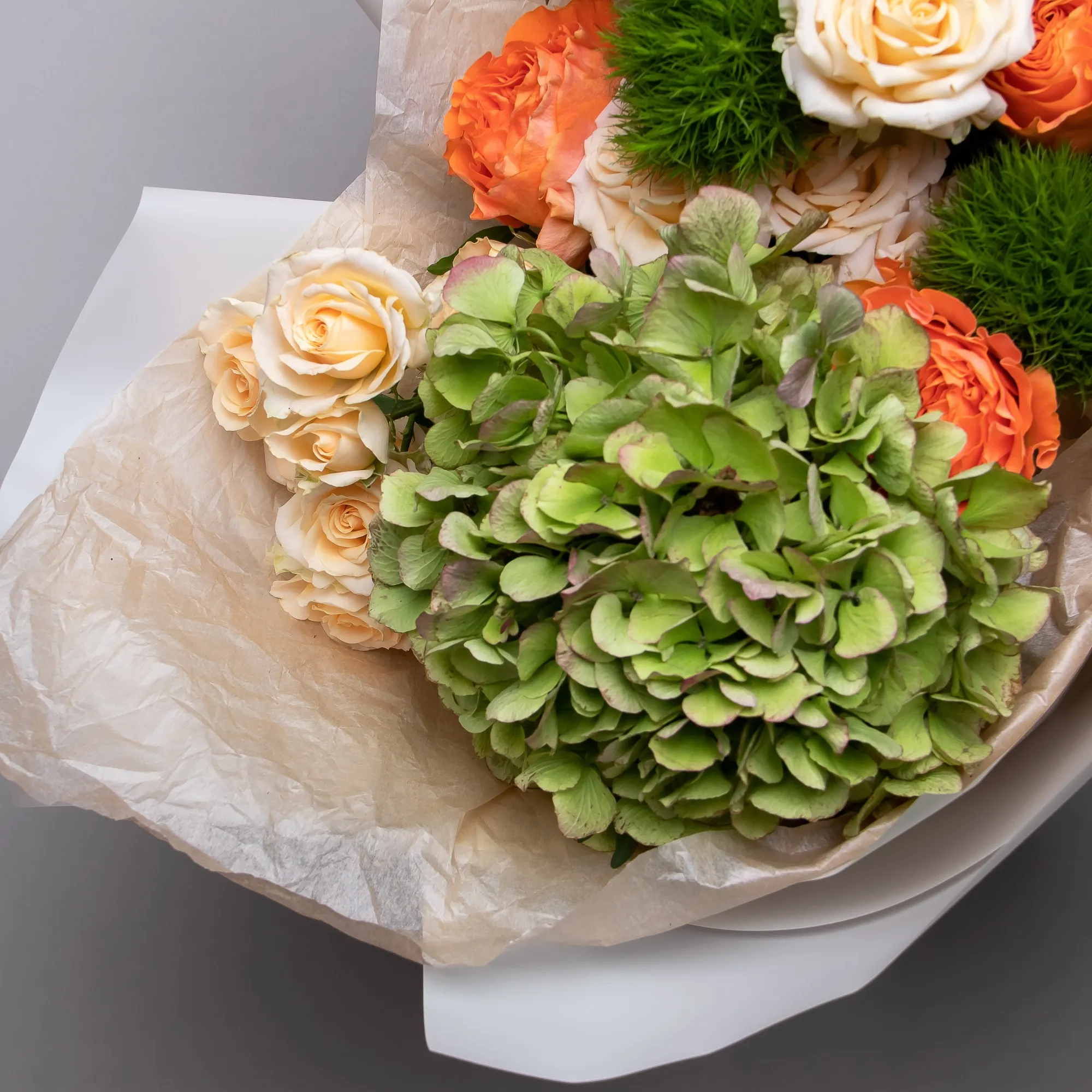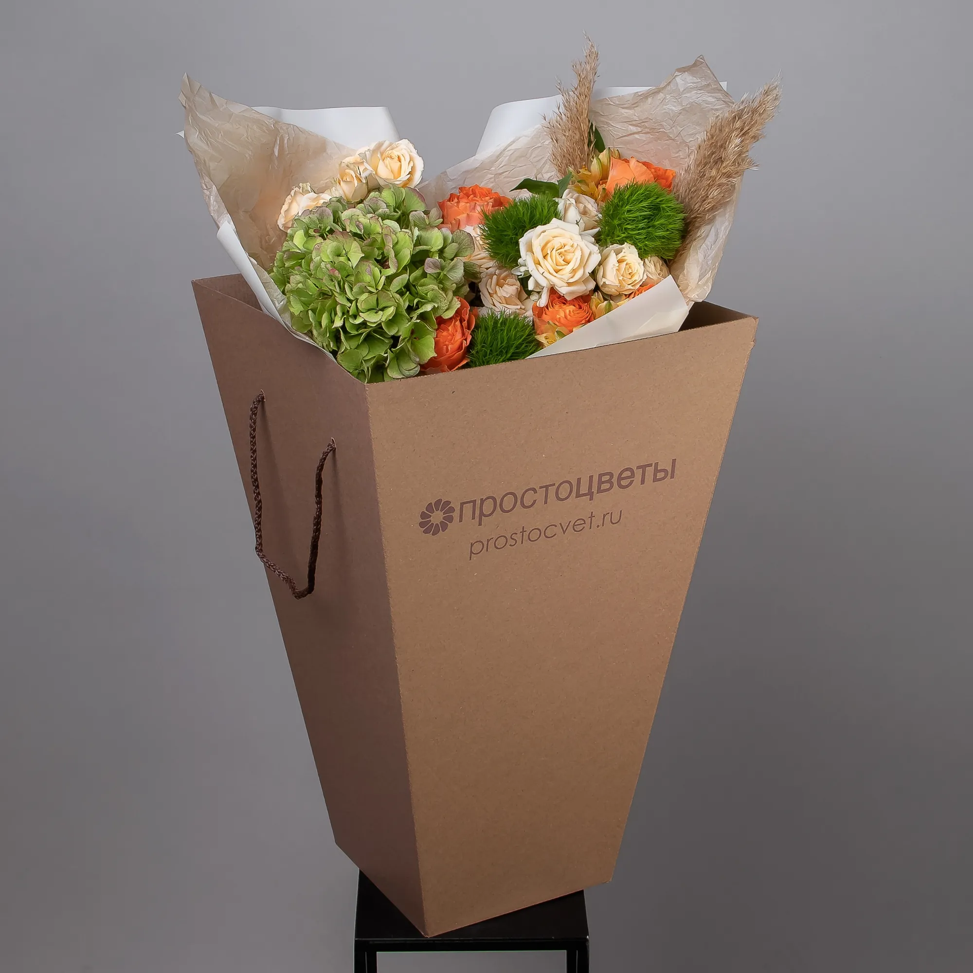 Гвоздика-3, Гортензия-1, Роза-5, Альстромерия-2, Роза кустовая-3, Листья фисташки-5, Сухоцвет-2