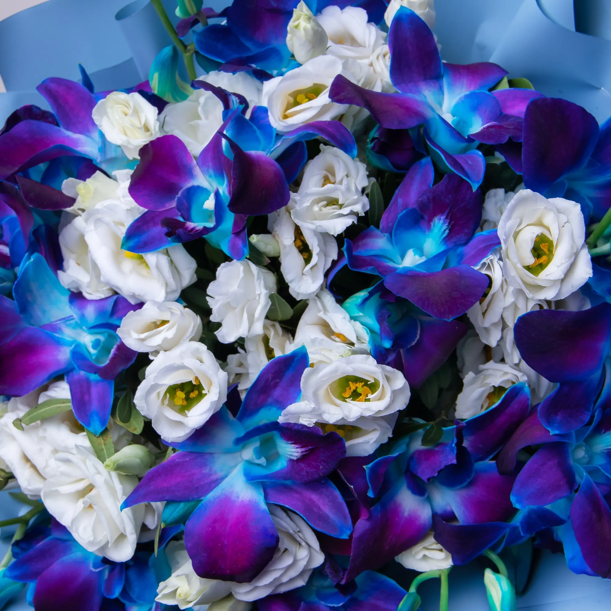 Букет из белых лизиантусов и синих орхидей "Гагарин"
