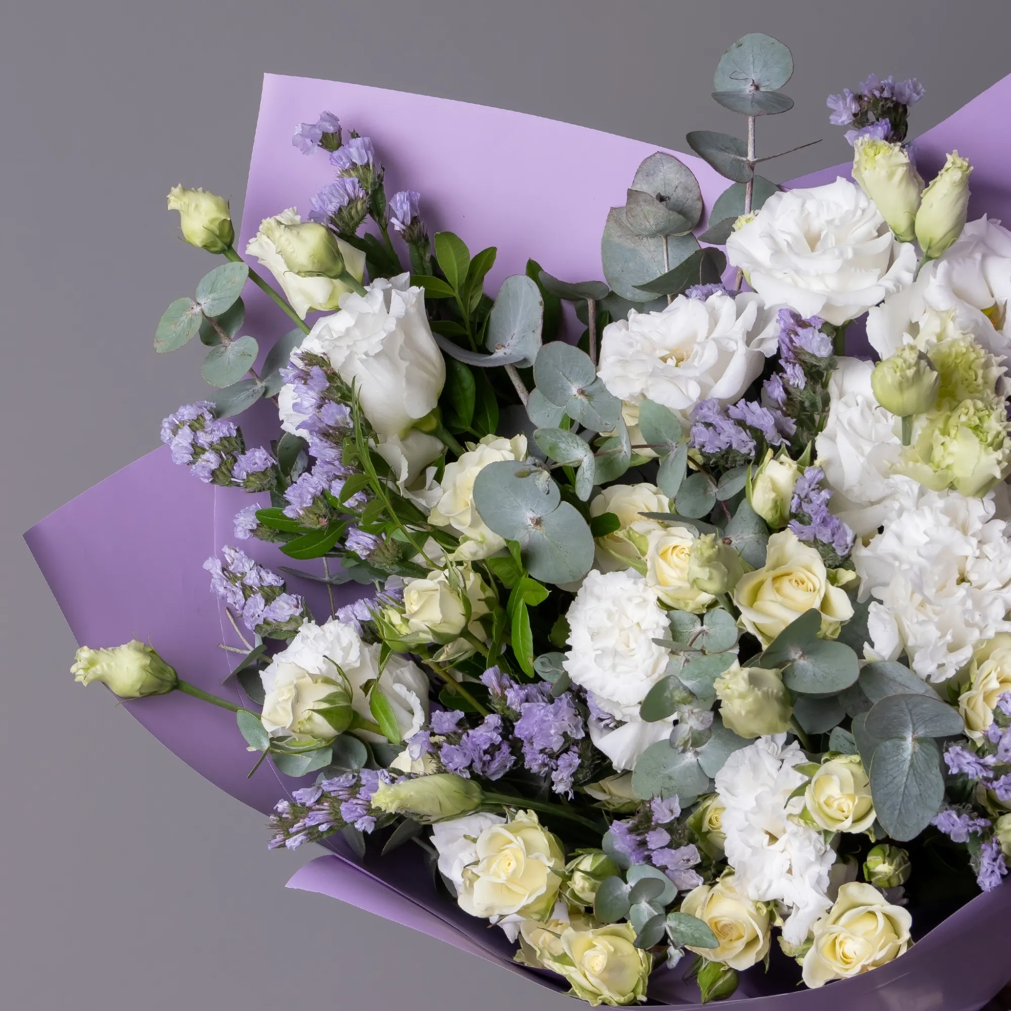 В составе букета "Герда" белоснежные лизиантусы, белая кустовая роза "Сноу Флейк" и голубая статица. Дополнен листьями эвкалипта. Идеально подойдет в качестве сюрприза для первого свидания. Закажите букет с доставкой или заберите самовывозом. И помните, что цветы - это просто.