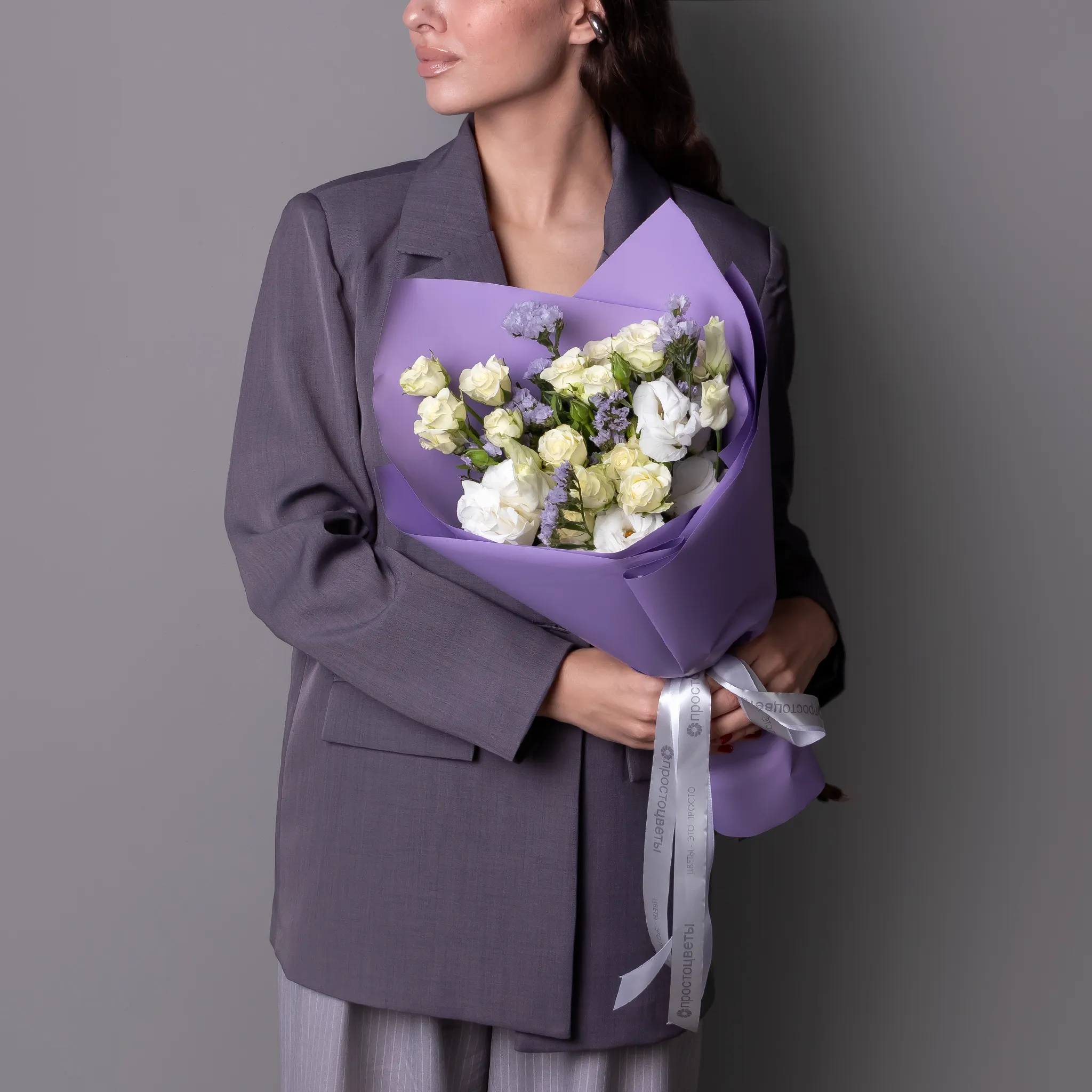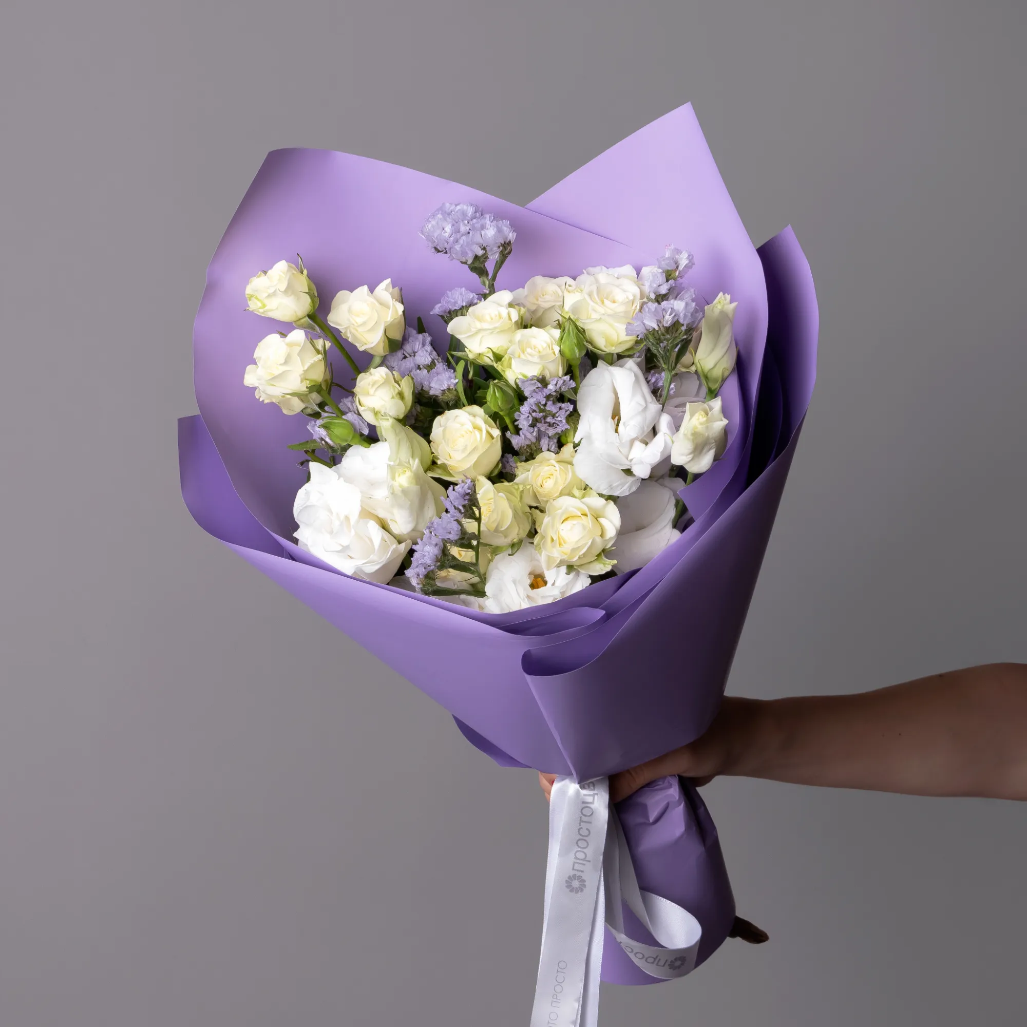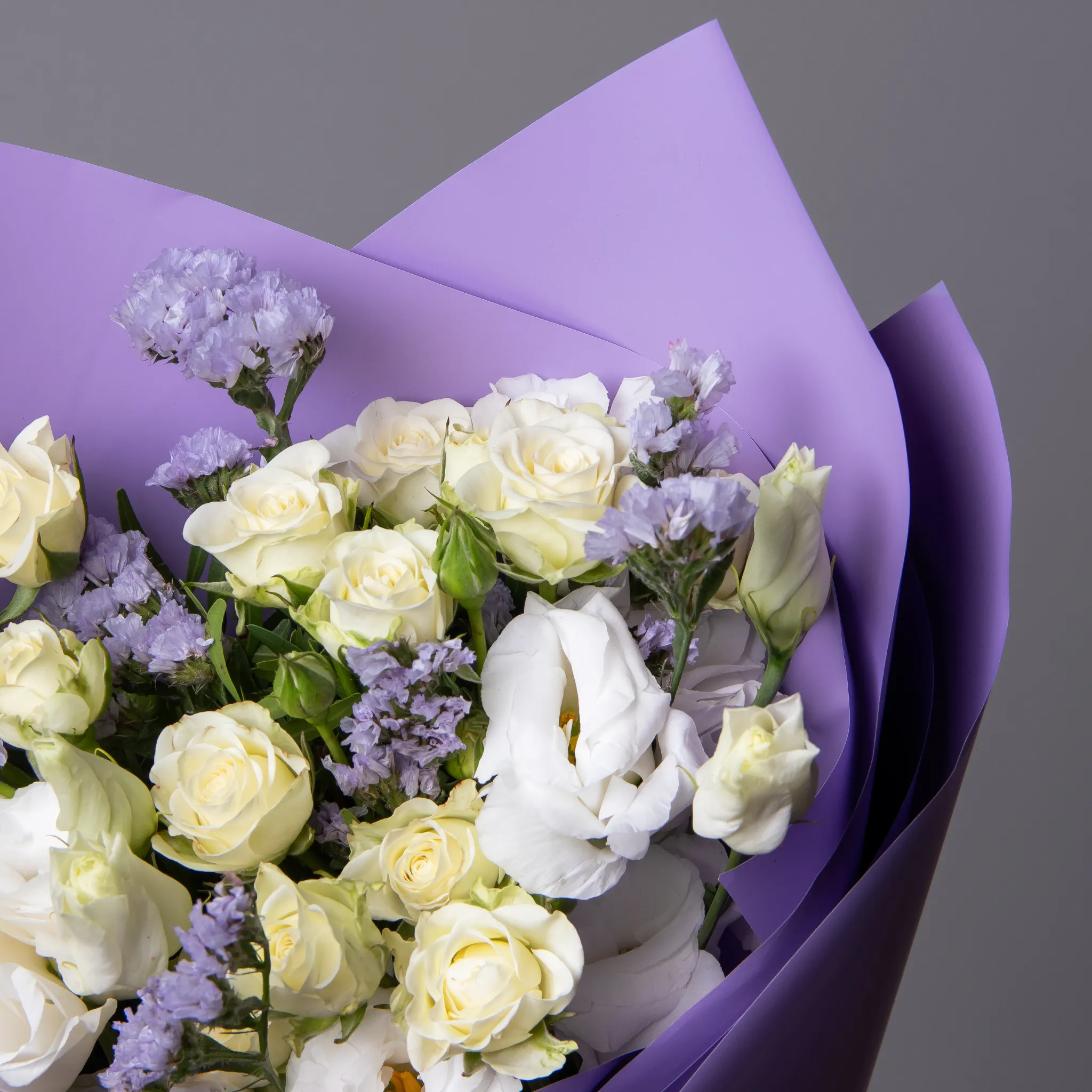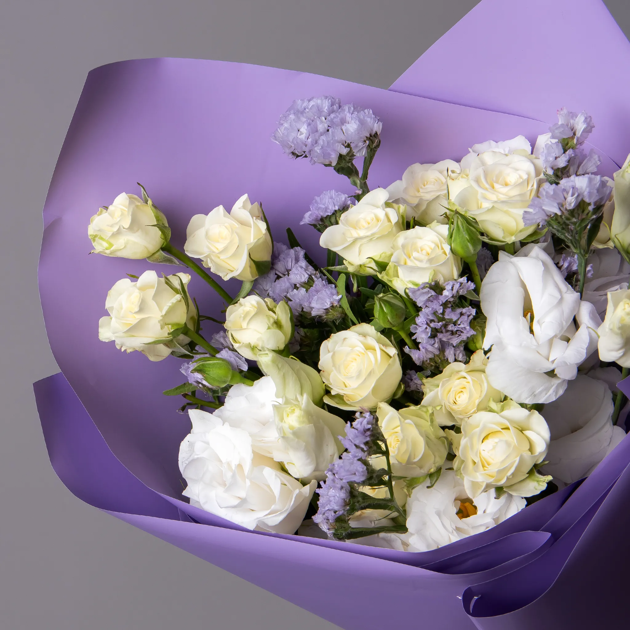 В составе букета "Герда" белоснежные лизиантусы, белая кустовая роза "Сноу Флейк" ,сиреневая статица, дополнен листьями фисташки.