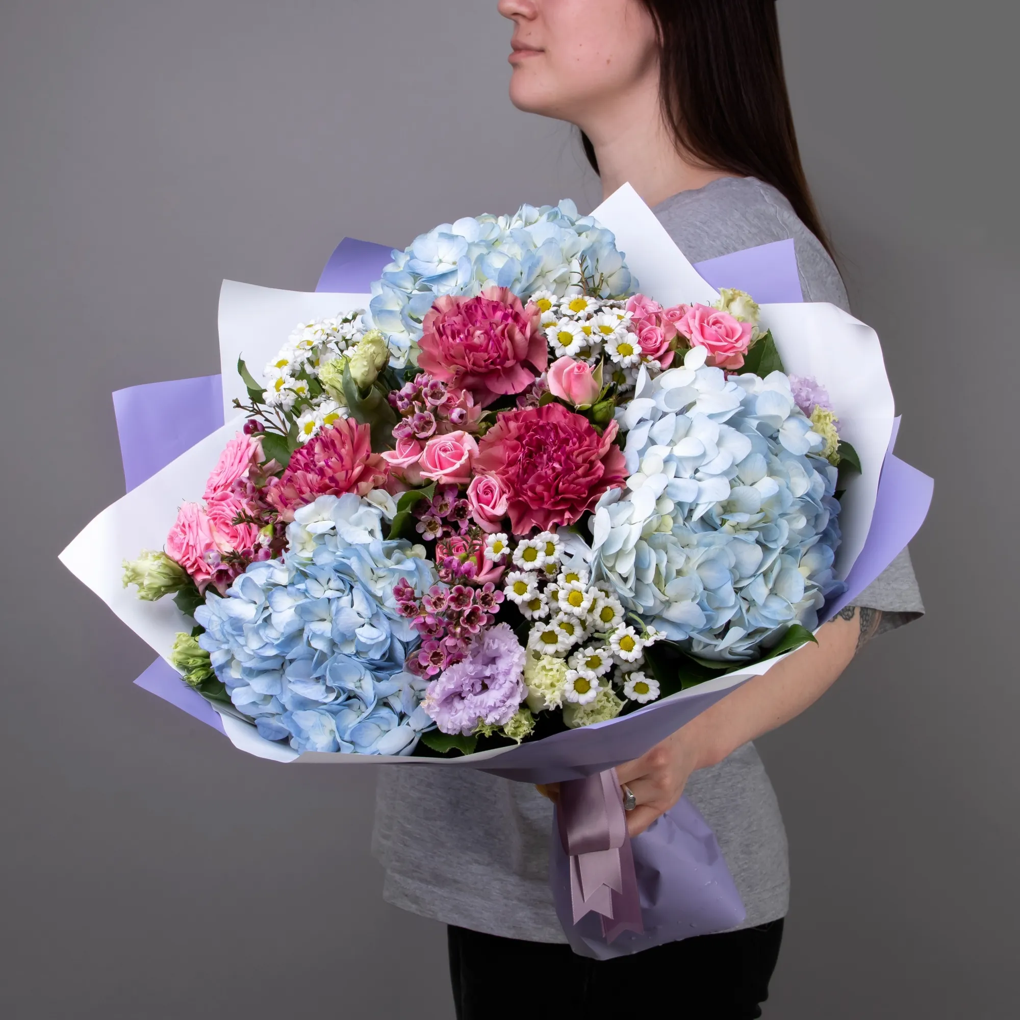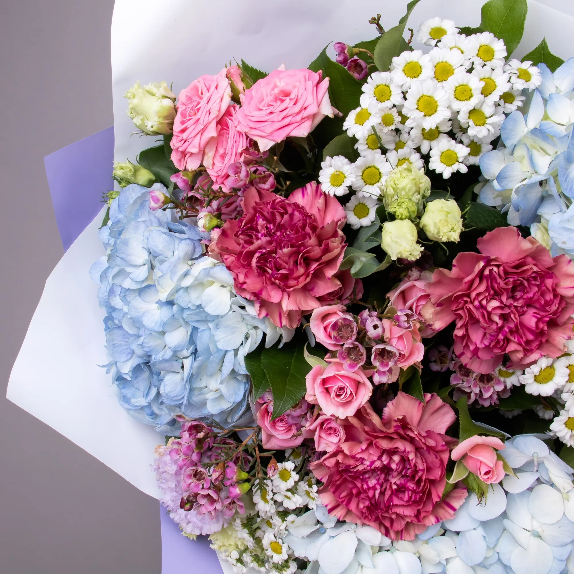 Торжественный парад цветов из сочетания облаков нежно-голубой гортензии, белоснежной хризантемы и кустовых роз, подчеркнутый цветами лавандового лизиантуса и хамелациума розовых тонов.
