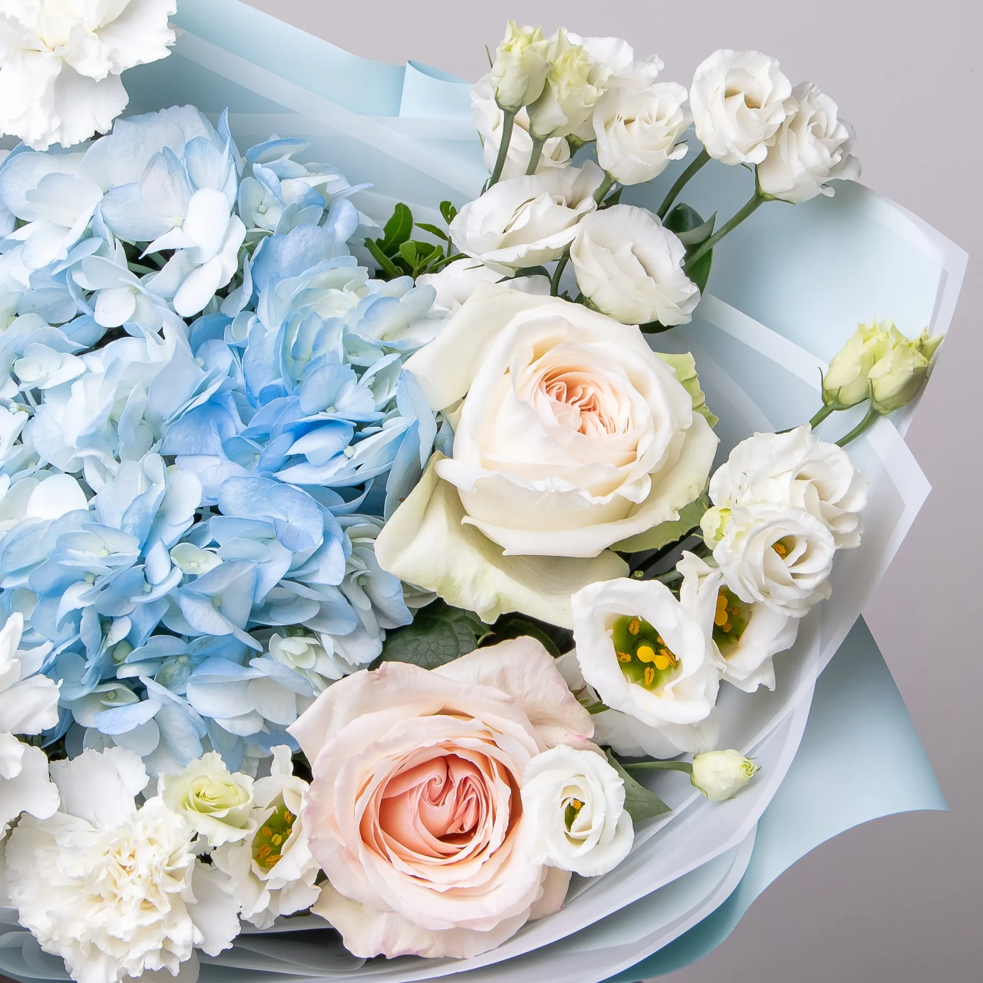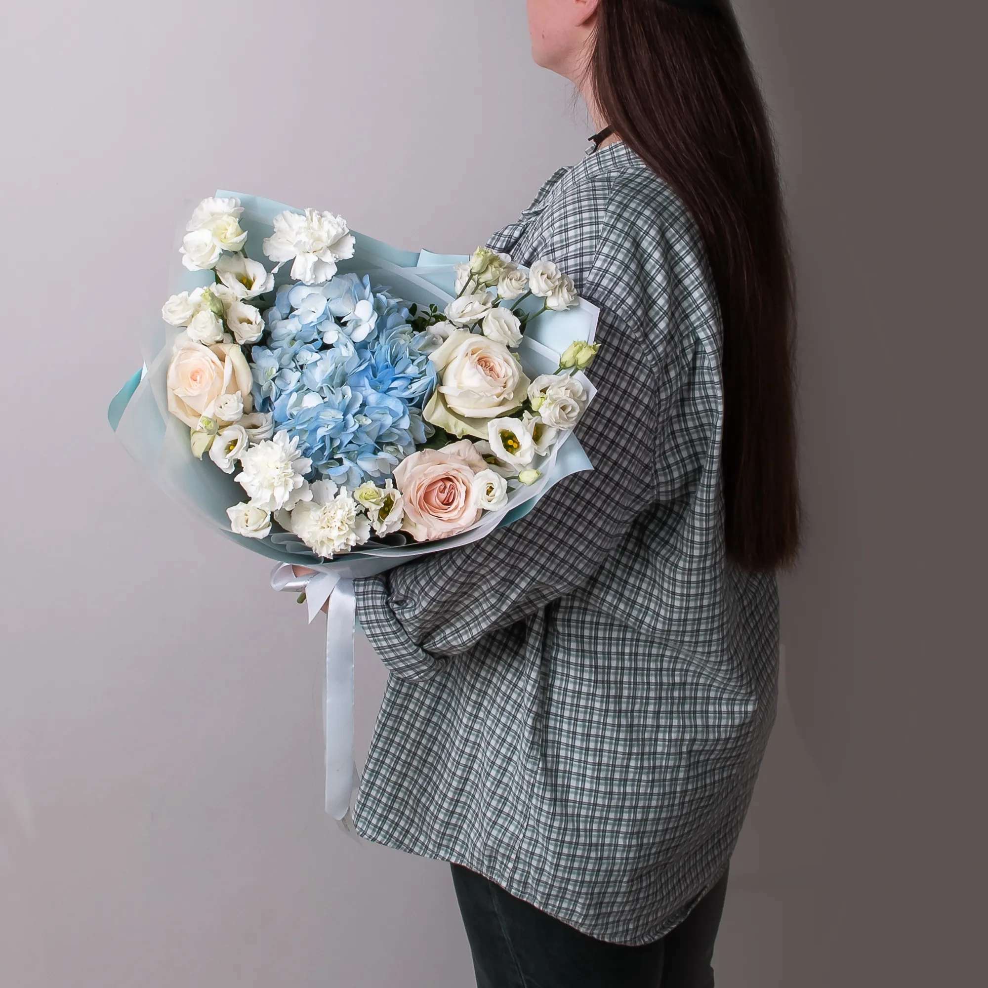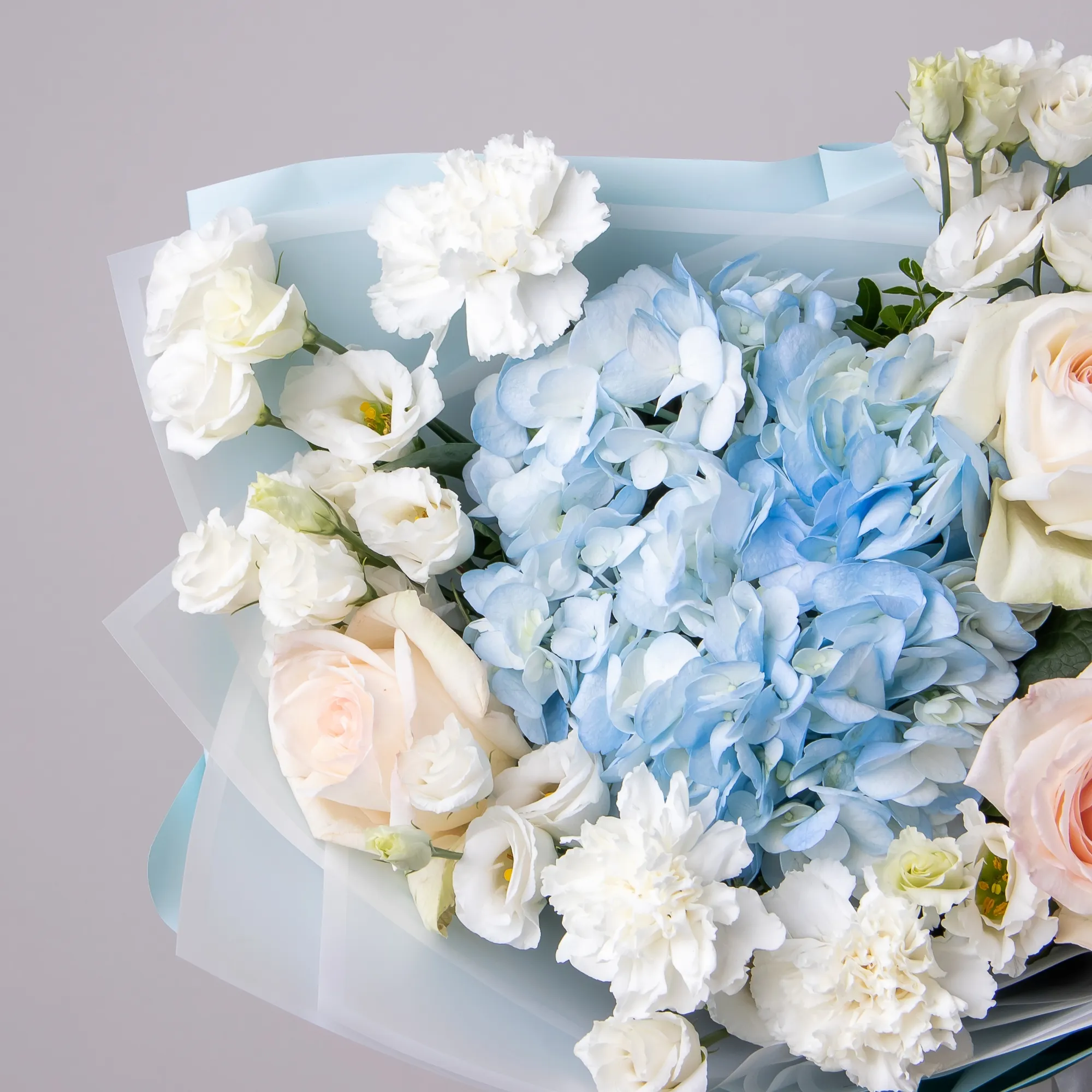 Гвоздика-3, Гортензия-1, Эустома-3, Роза пионовидная-3, Листья фисташки-8
