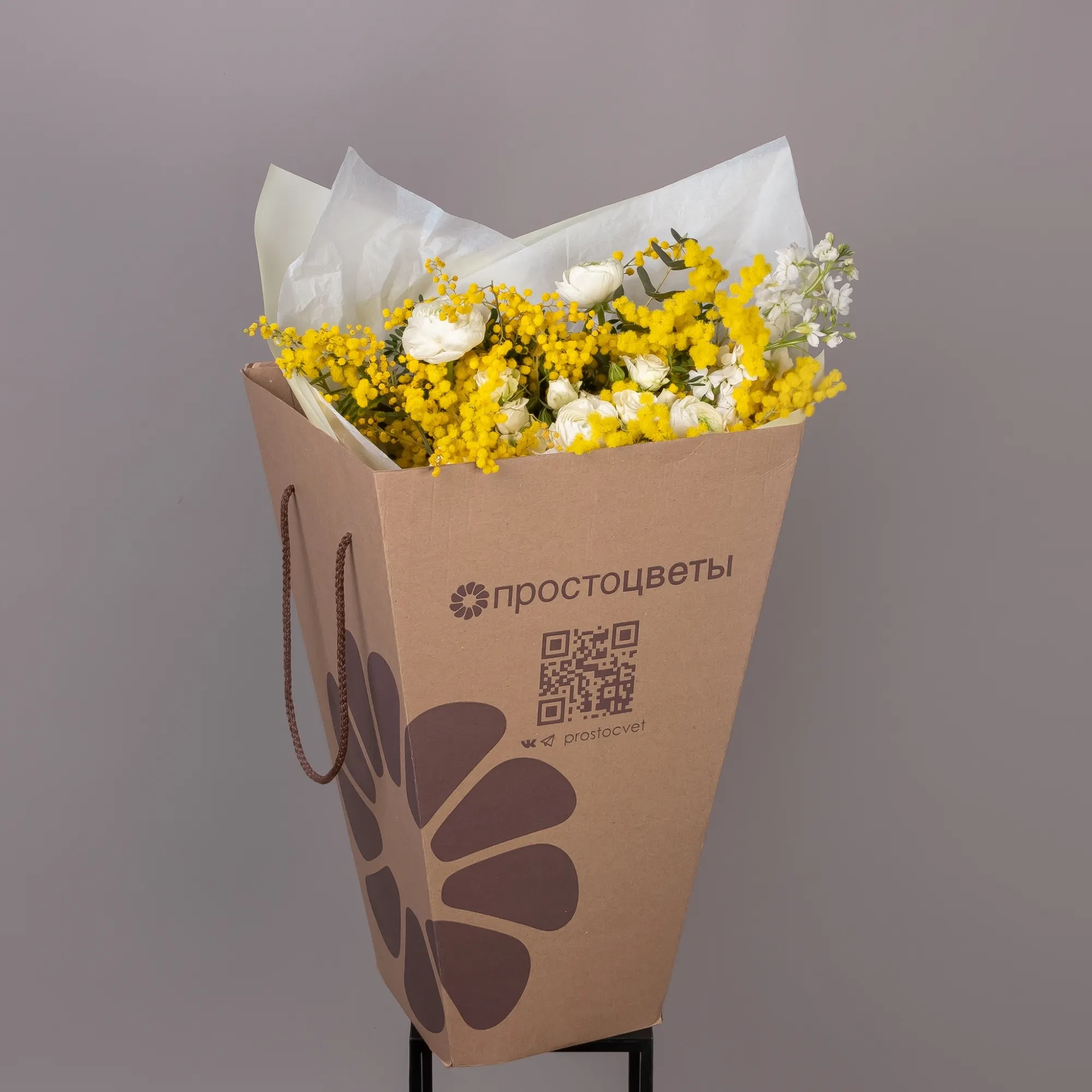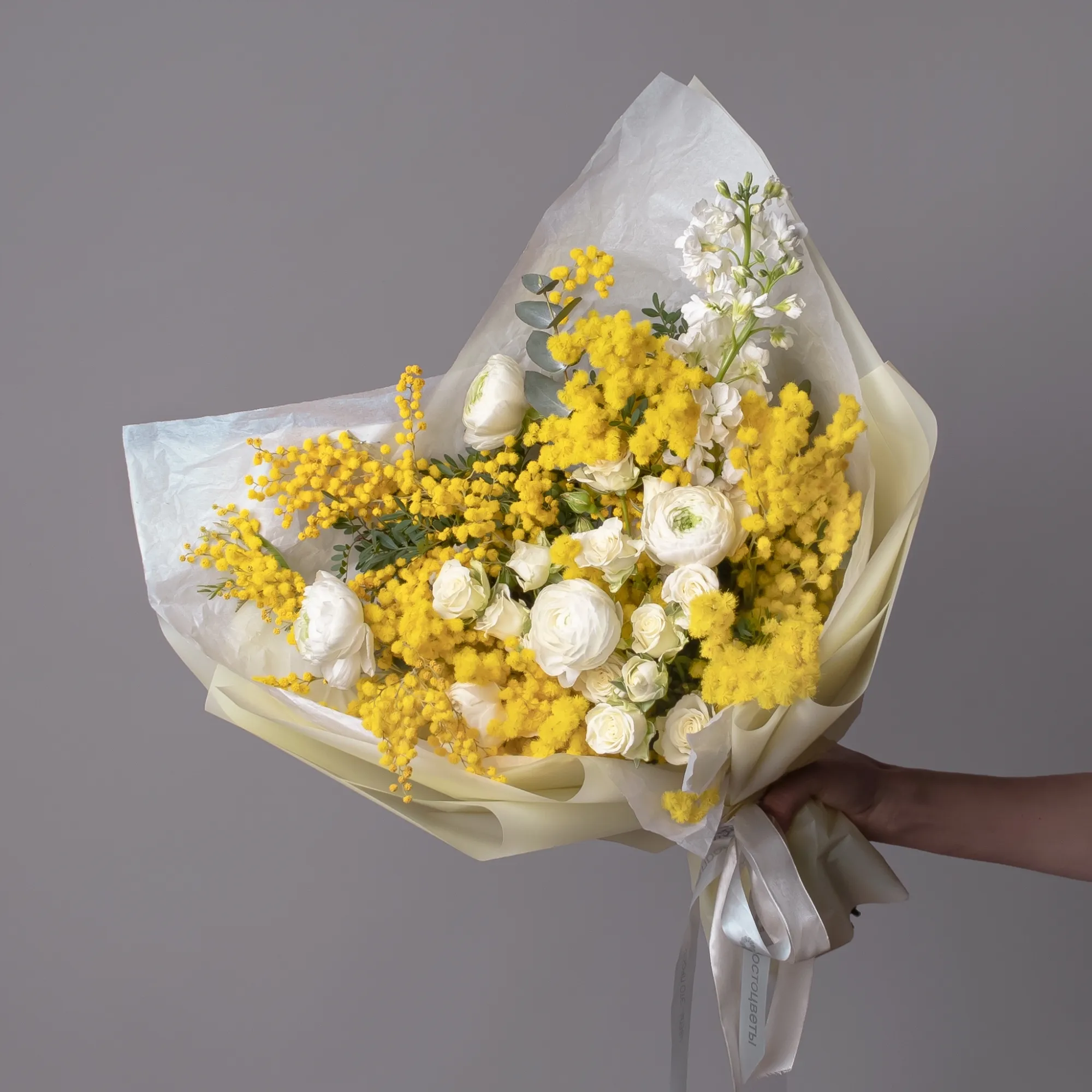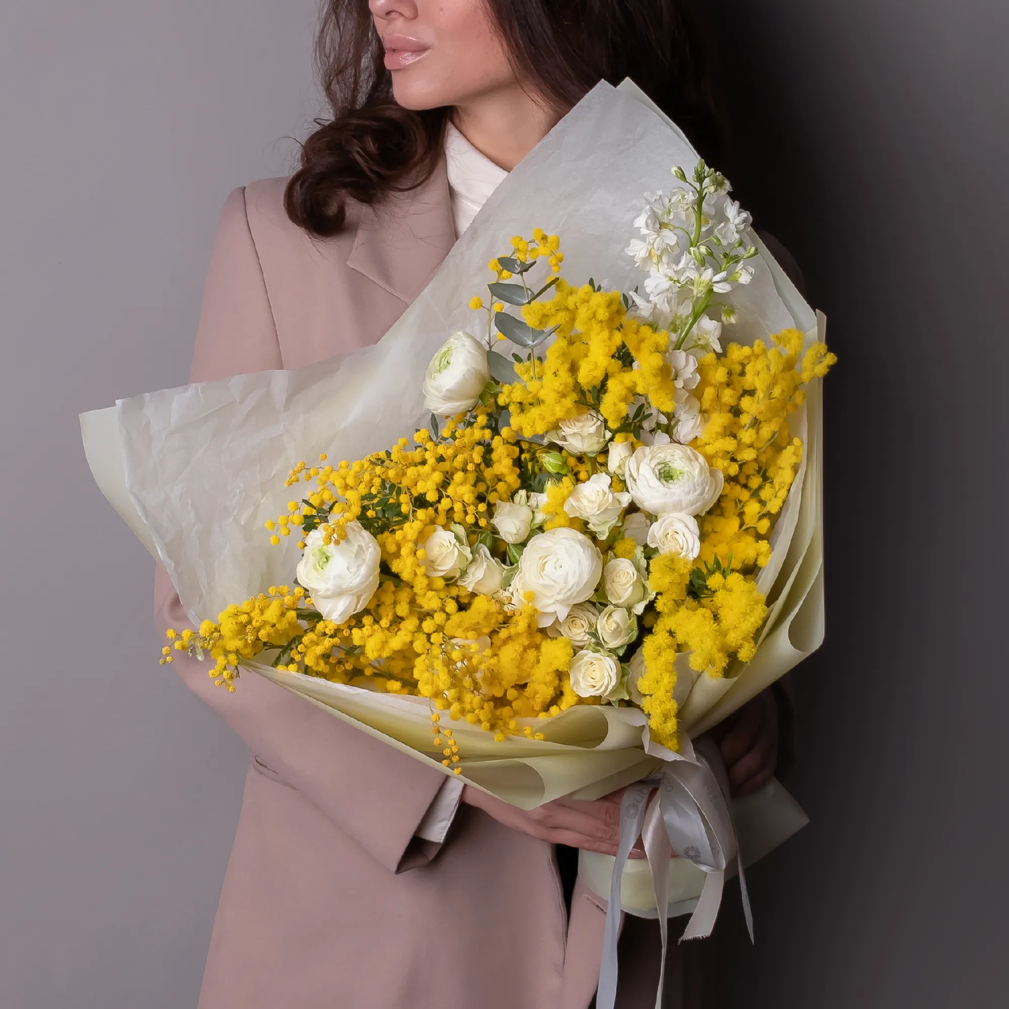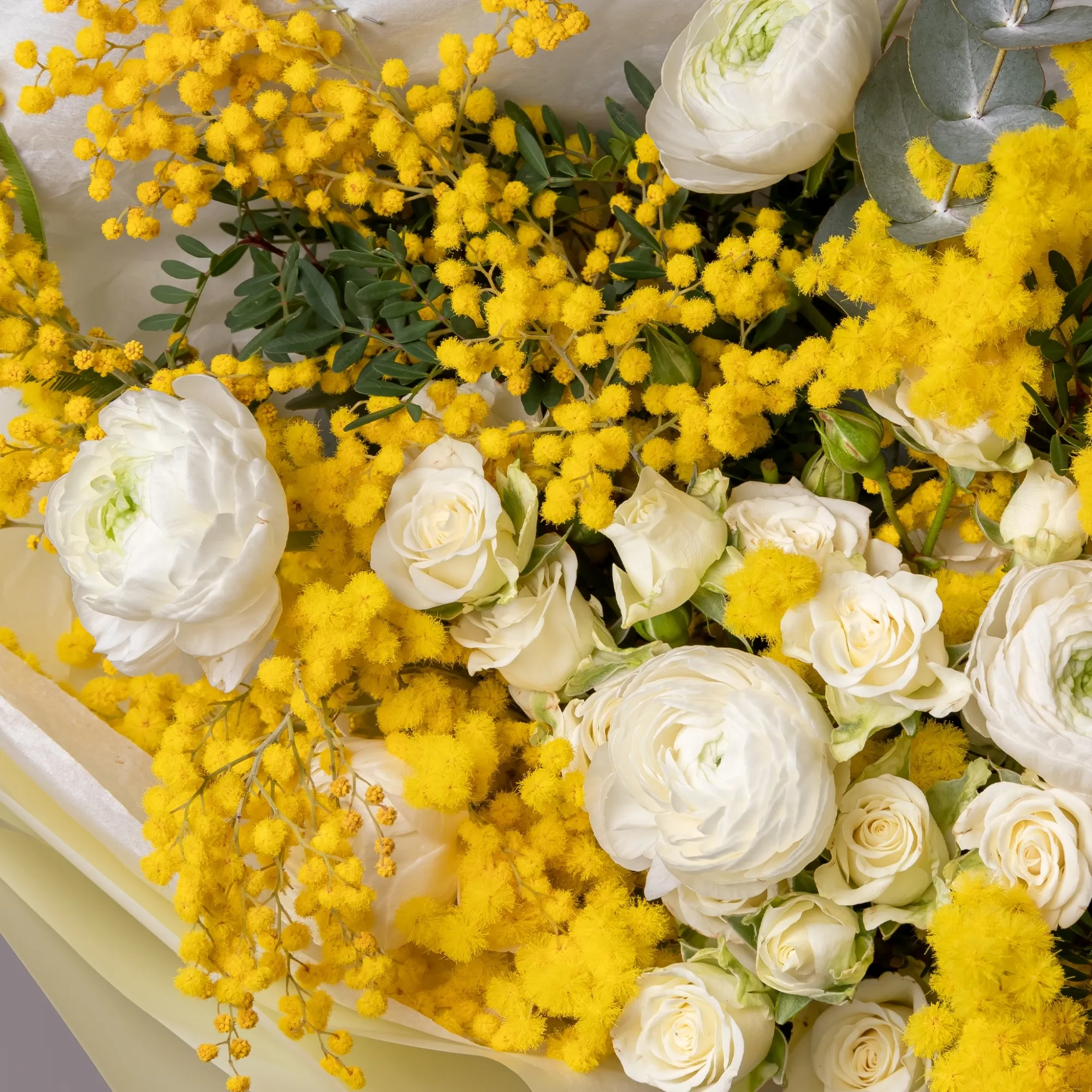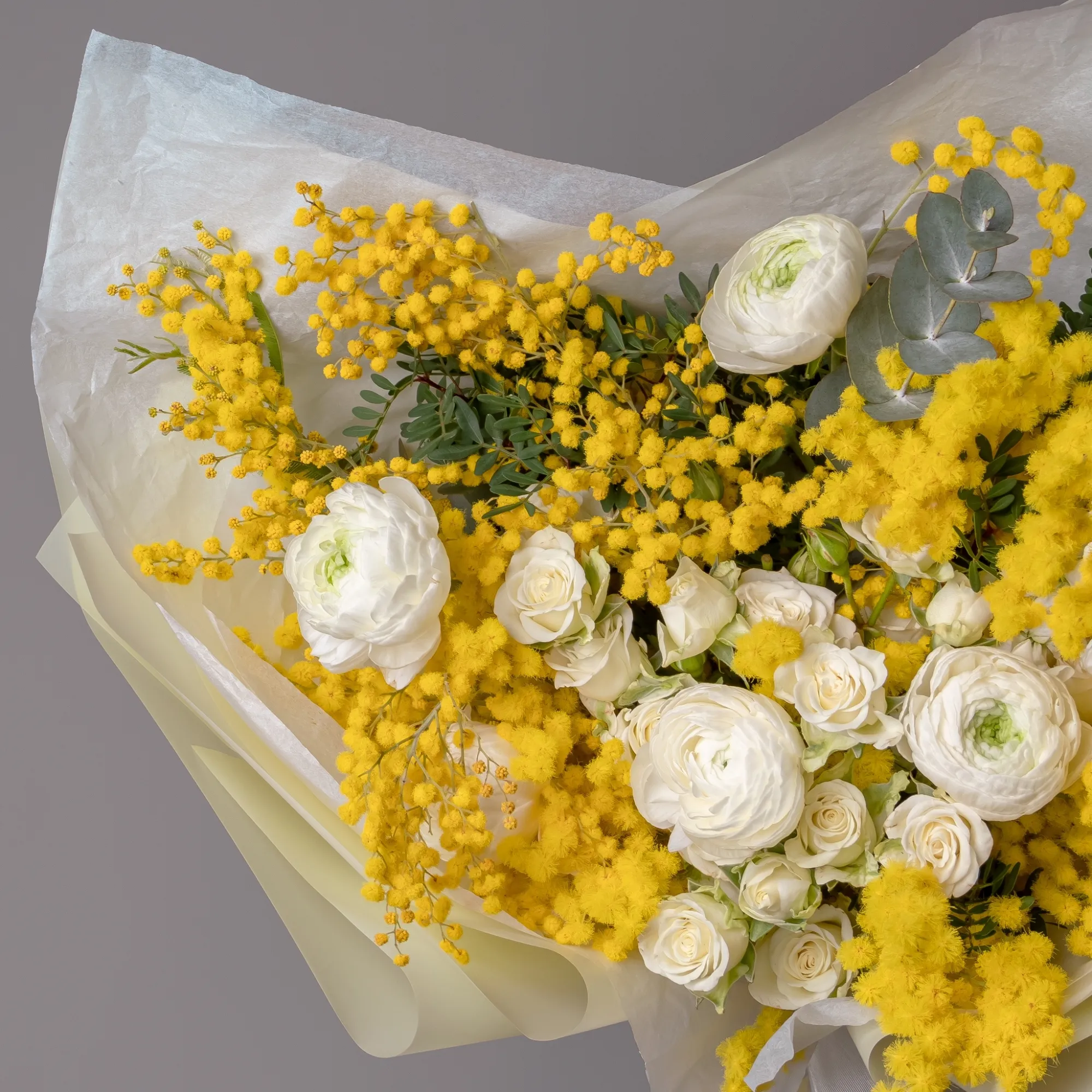 Мимоза-1, Маттиола-1, Роза кустовая-3, Ранункулюс-3, Листья эвкалипта-1