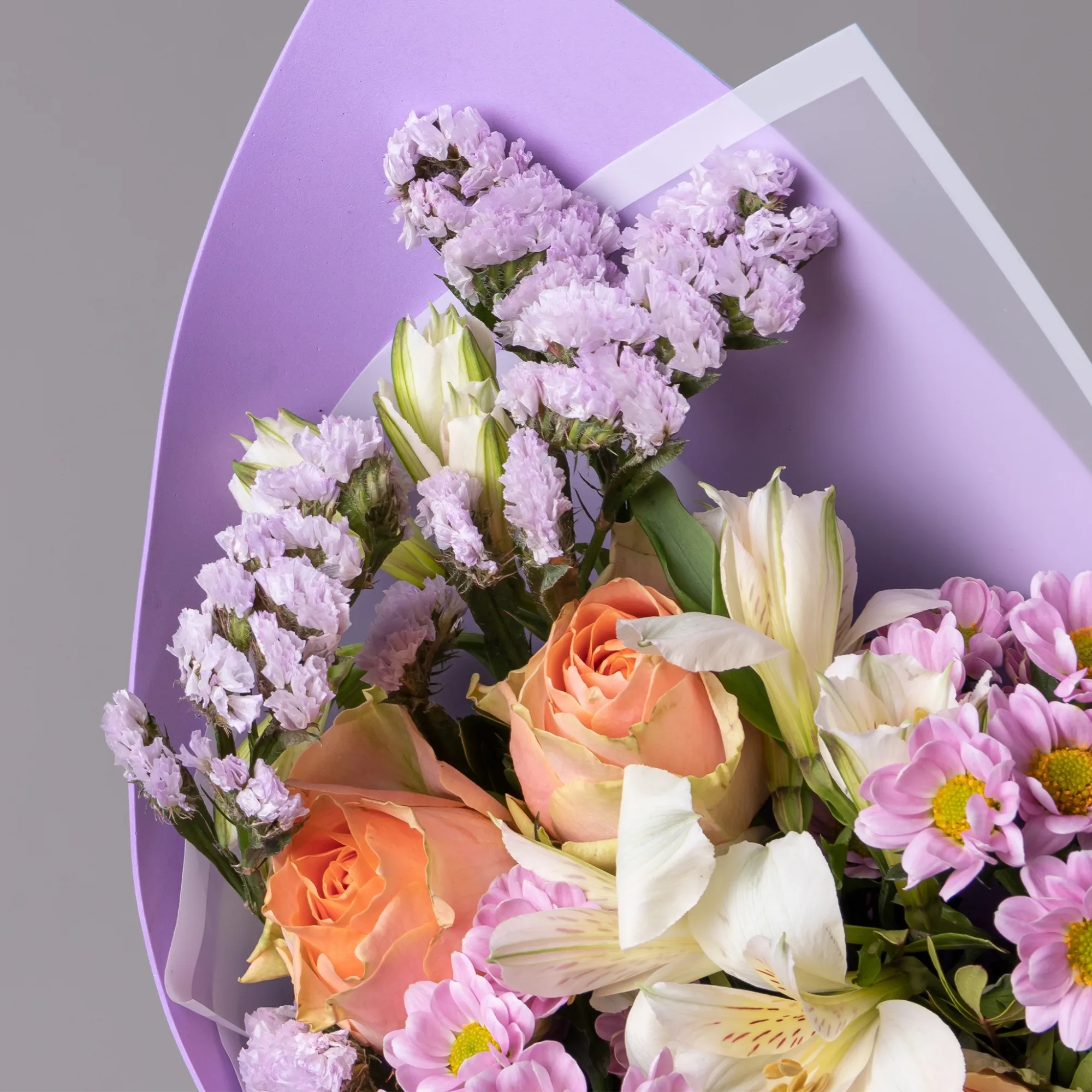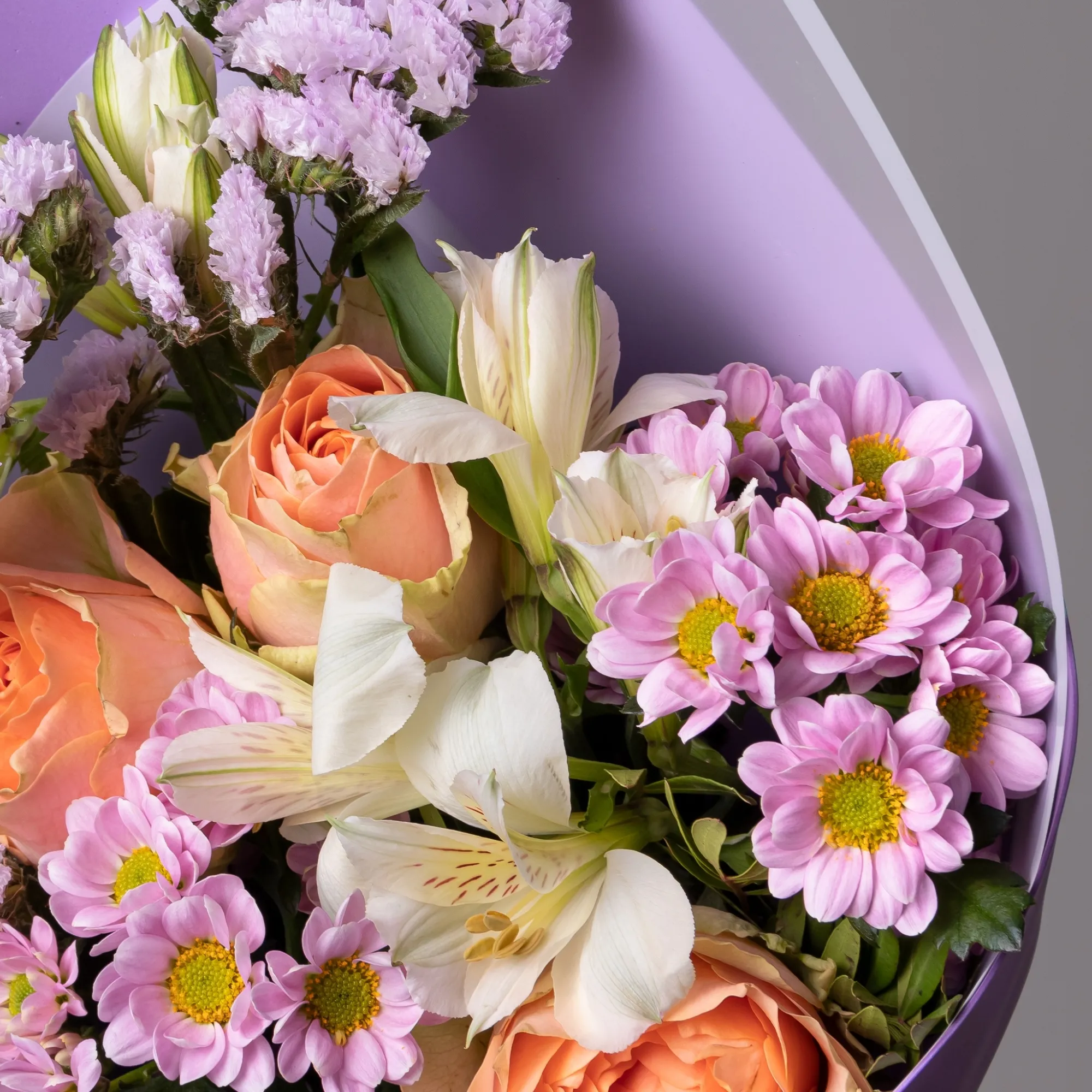 В составе букета "Гравити" в размере XS: роза сорта "Гравити ", белая альстромерия, нежно-розовая хризантема и сиреневая статица