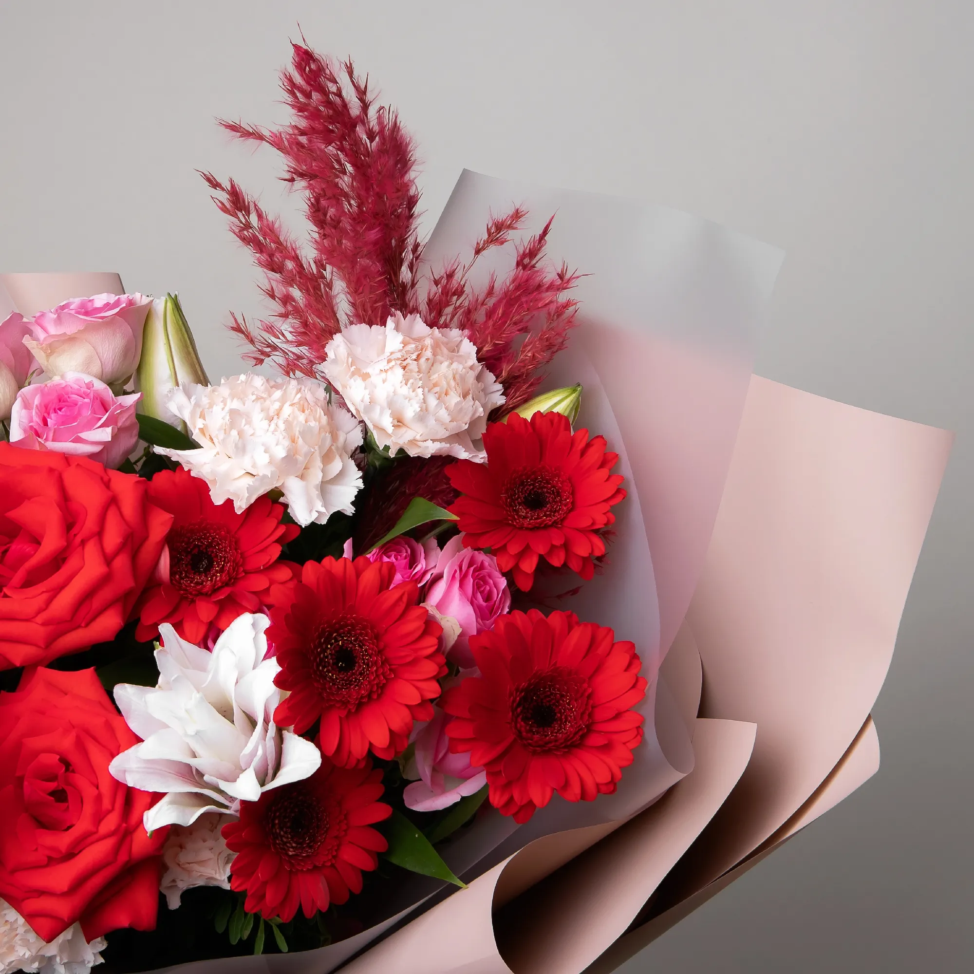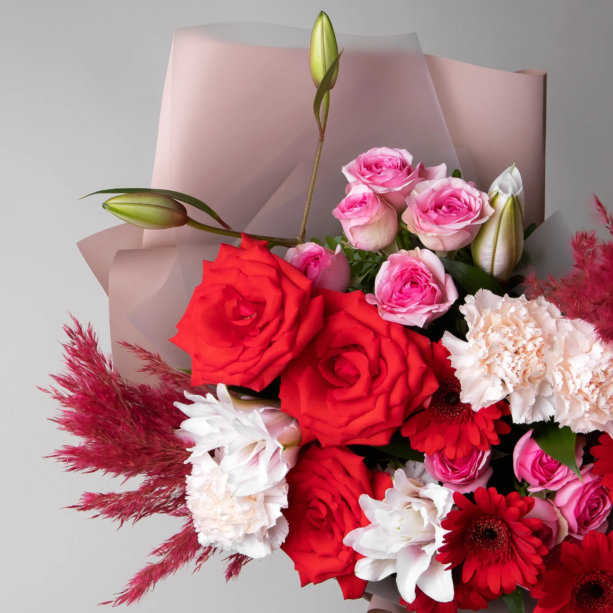Гвоздика-5, Роза-3, Лилия-3, Гермини-5, Роза кустовая-2, Листья фисташки-8