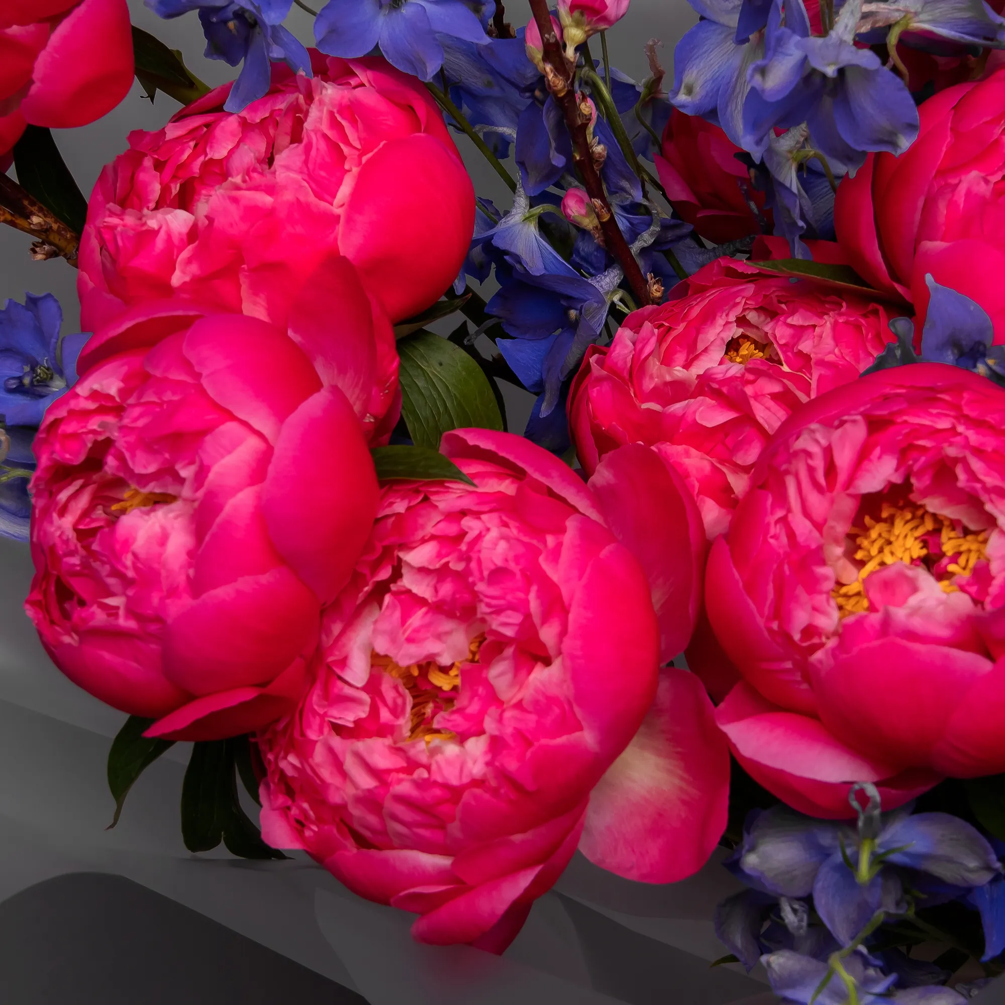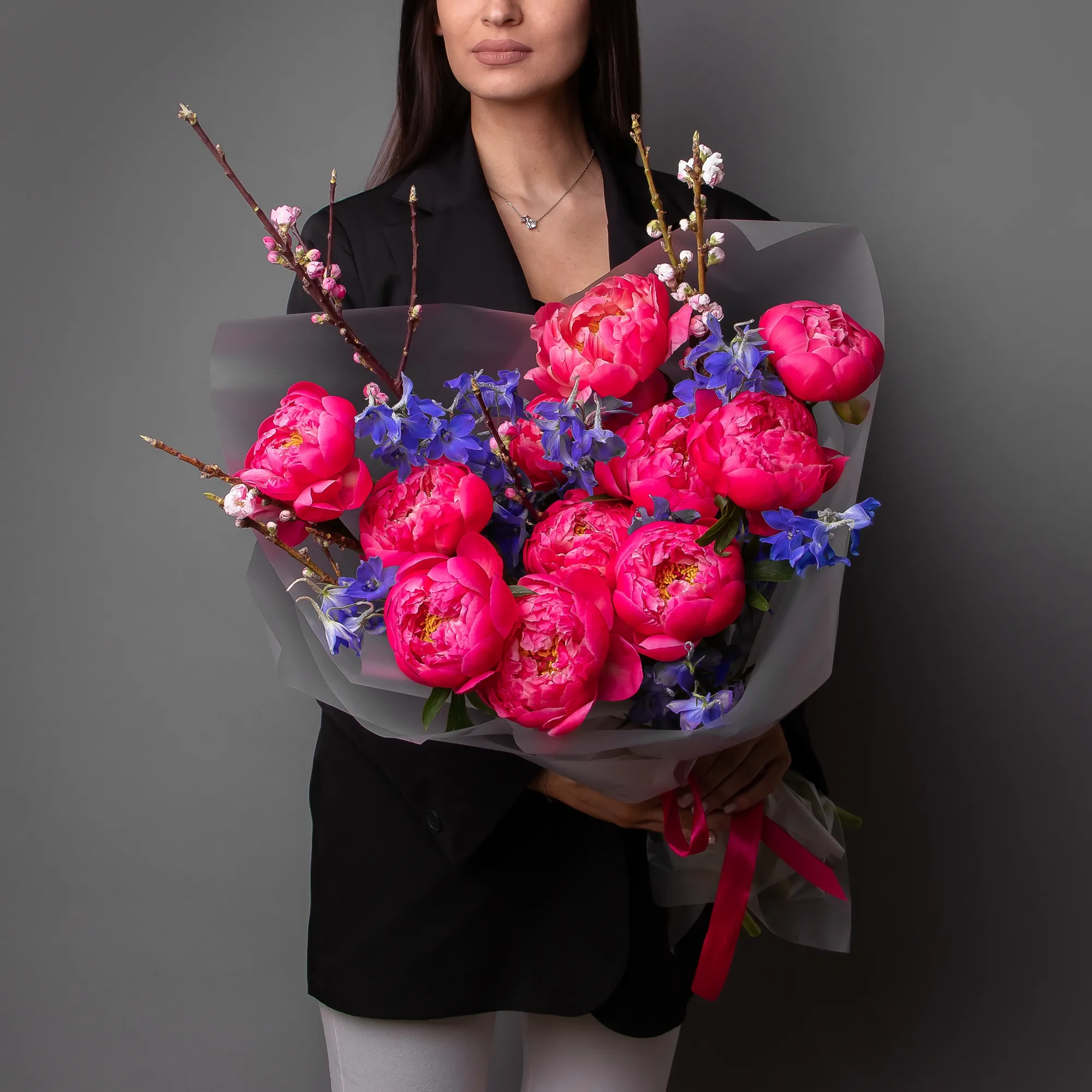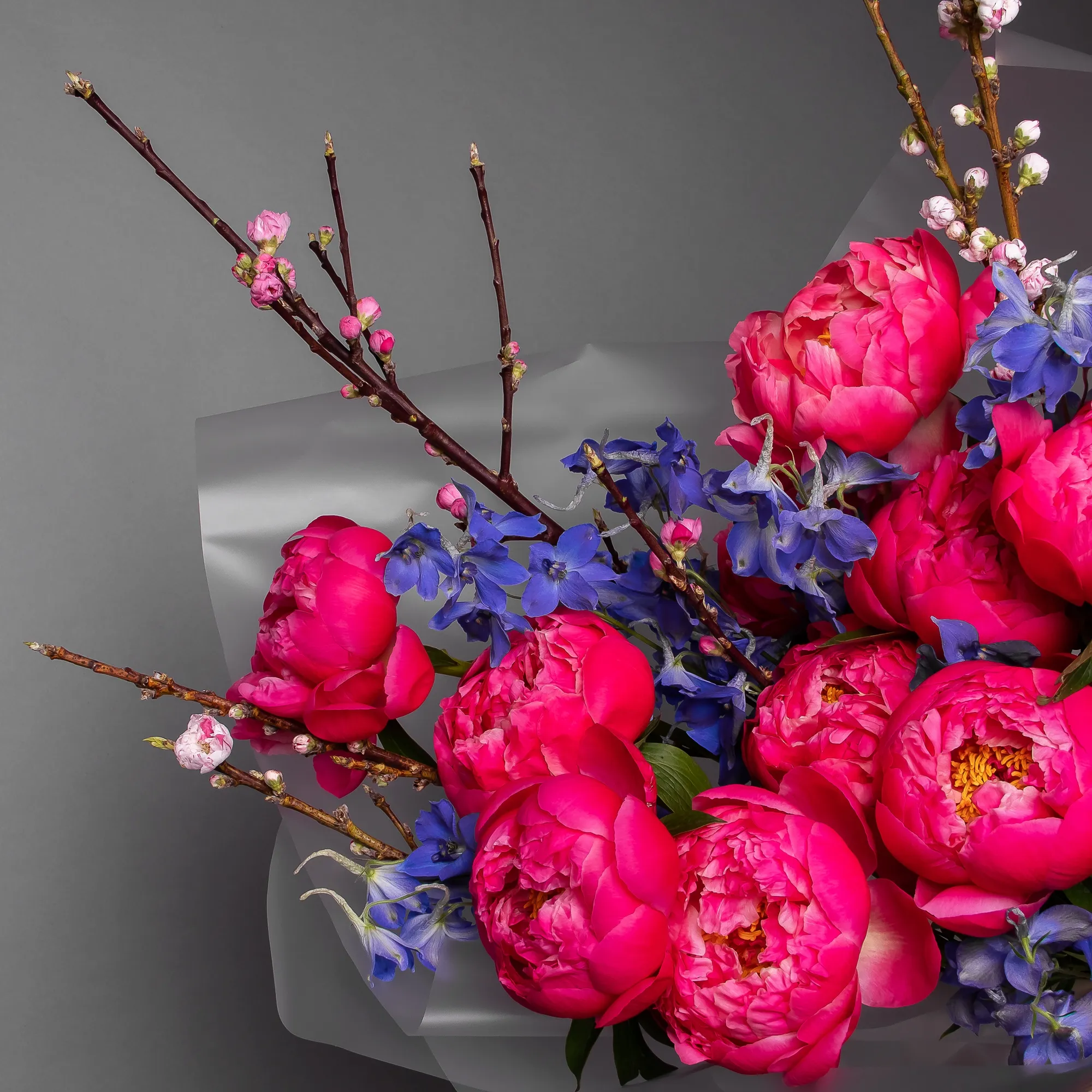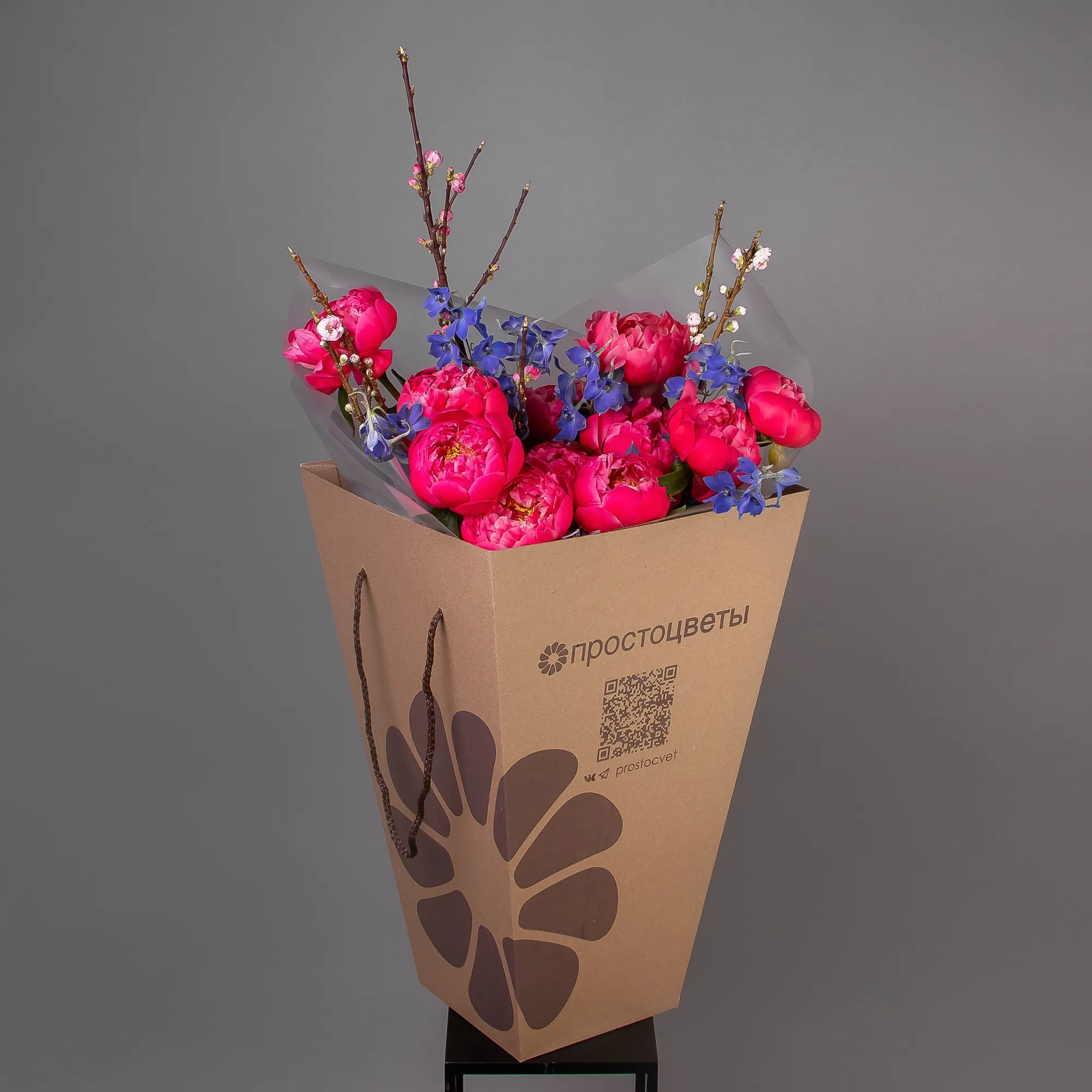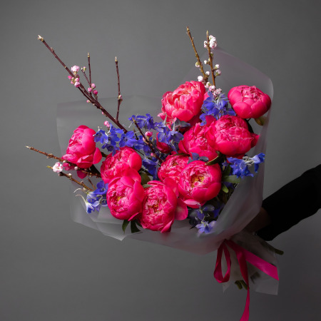 В составе букета "Кассиопея" роскошный пион "Корал Шарм", меняющий цвет в процессе раскрытия, голубой дельфиниум и ветки прунуса. Букет "Кассиопея" - это изысканная композиция, которая подойдет для следующих случаев: романтическое свидание - яркие оттенки и нетривиальная форма букета создадут особую атмосферу встречи; юбилей или годовщина - элегантная композиция подчеркнет торжественность момента; деловая встреча - букет продемонстрирует статусность и хороший вкус дарителя.