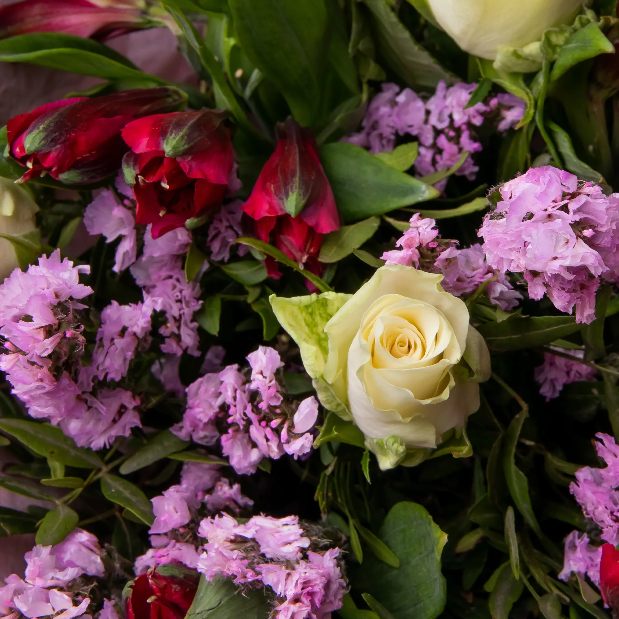 - разбавляем радужной альстромерией и выразительной статицей