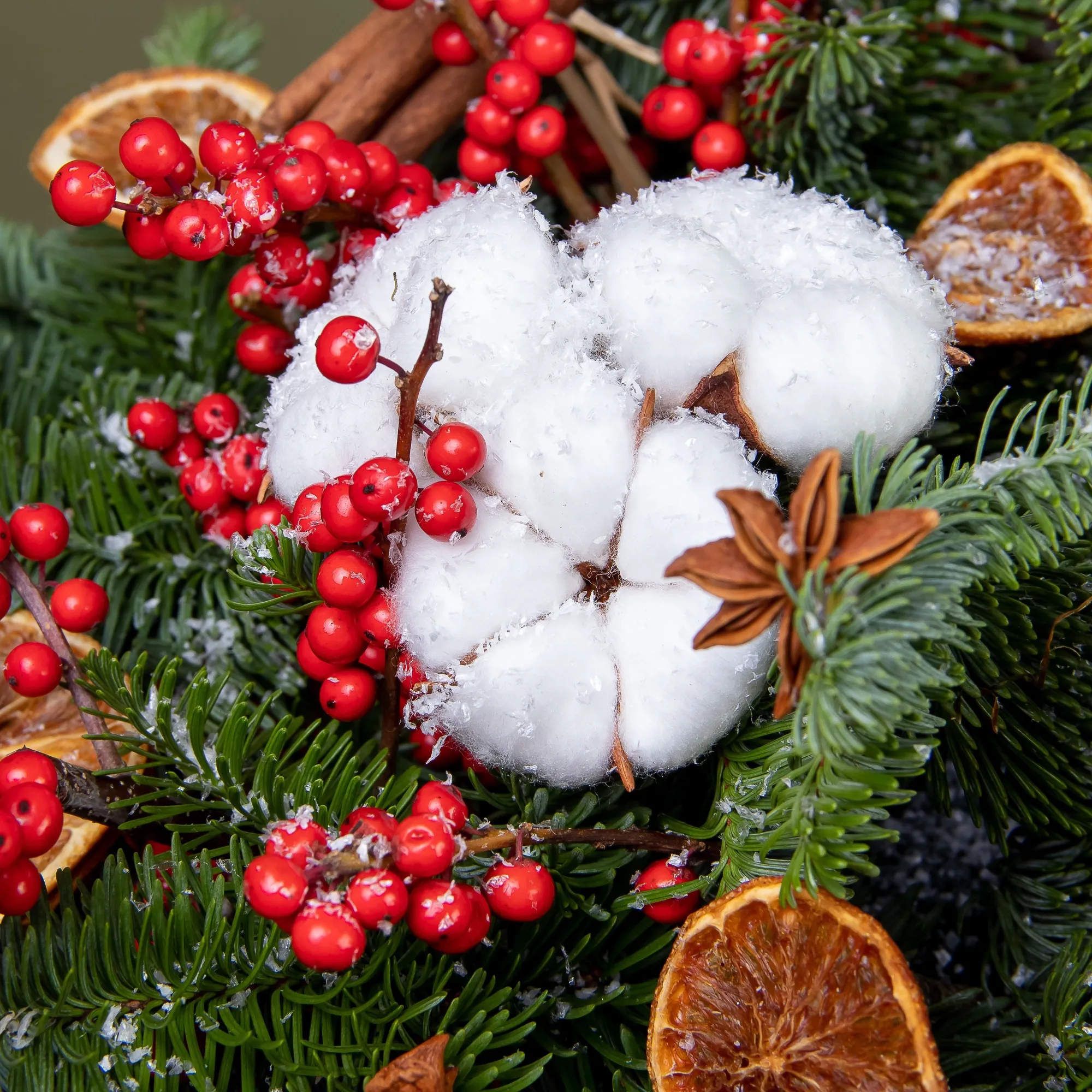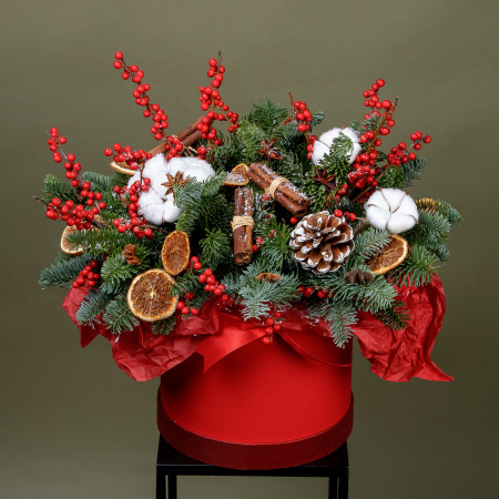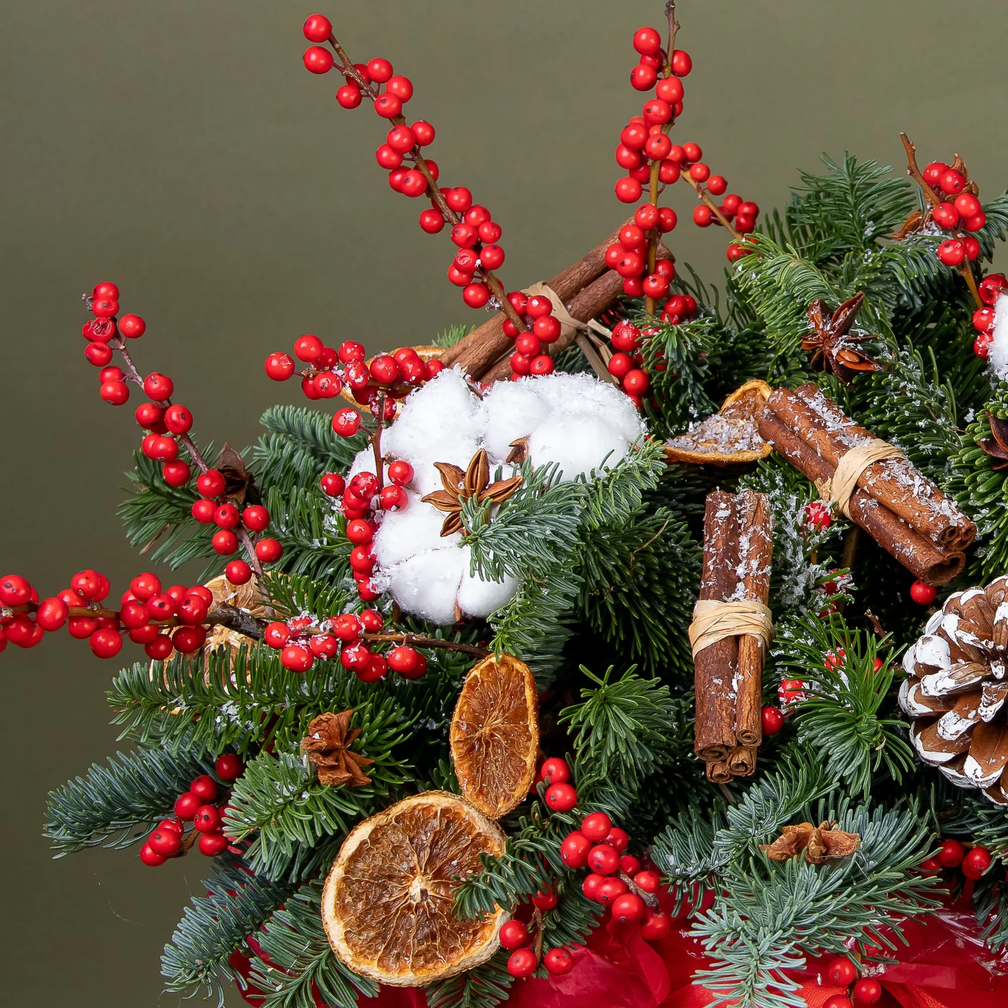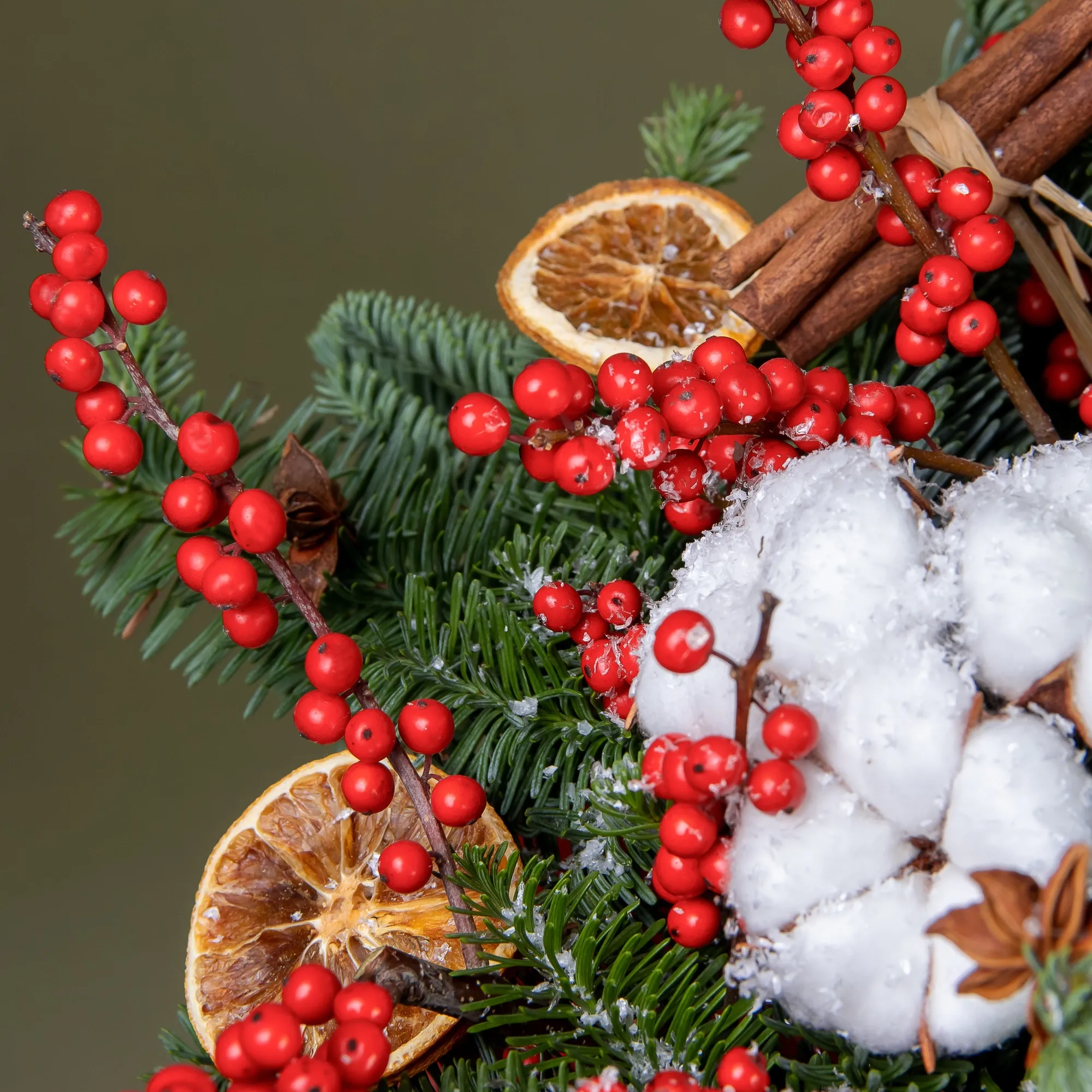 Новогодняя праздничная композиция из самых стойких цветочных ингредиентов. В составе зеленый нобилис (пихта), красный илекс, кремовый хлопок, анис, палочки корицы, а также декор - апельсиновые дольки и шишки.