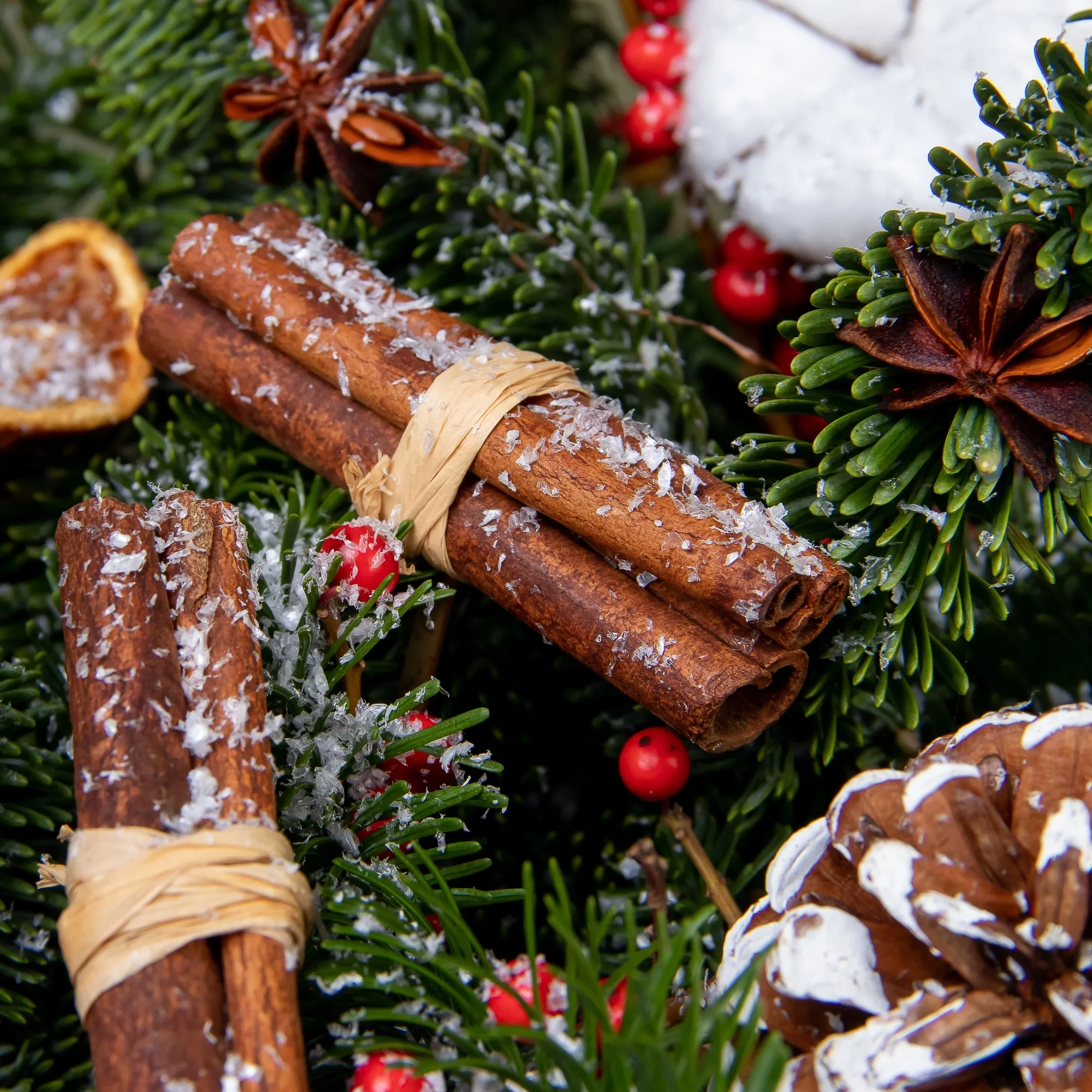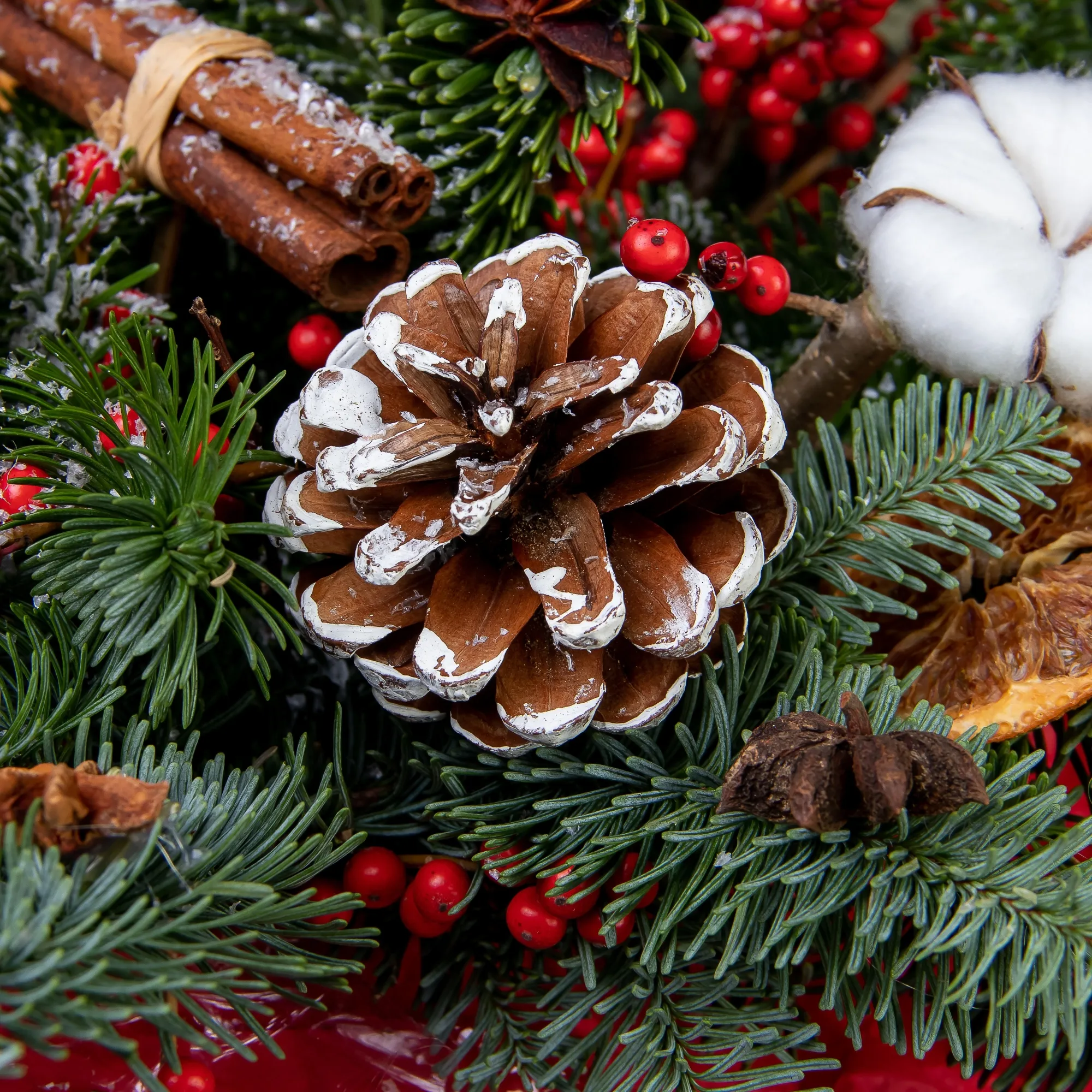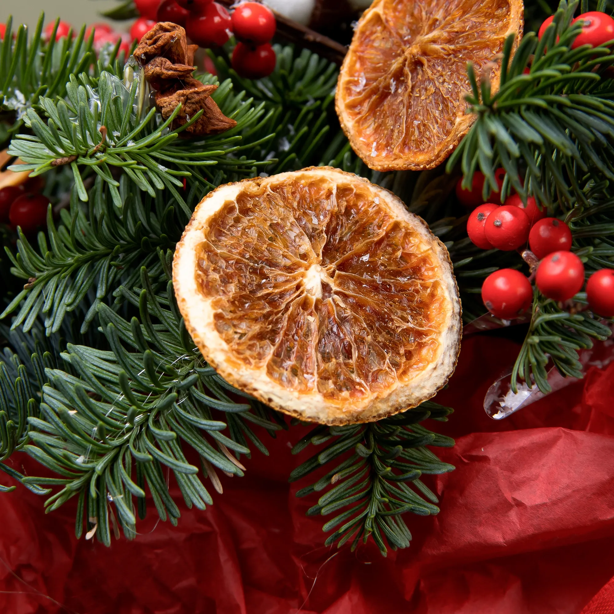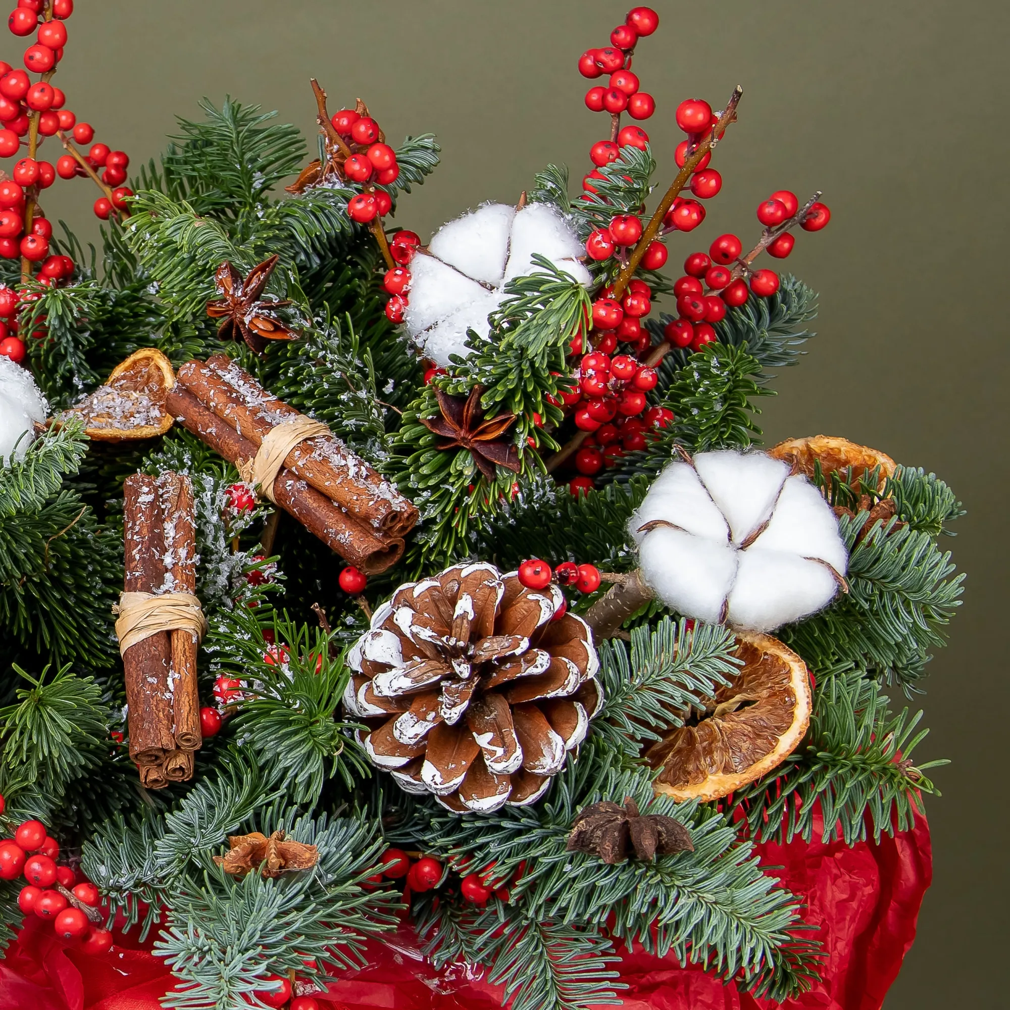 Новогодняя праздничная композиция из самых стойких цветочных ингредиентов. В составе зеленый нобилис (пихта), красный илекс, кремовый хлопок, анис, палочки корицы, а также декор - апельсиновые дольки и шишки.