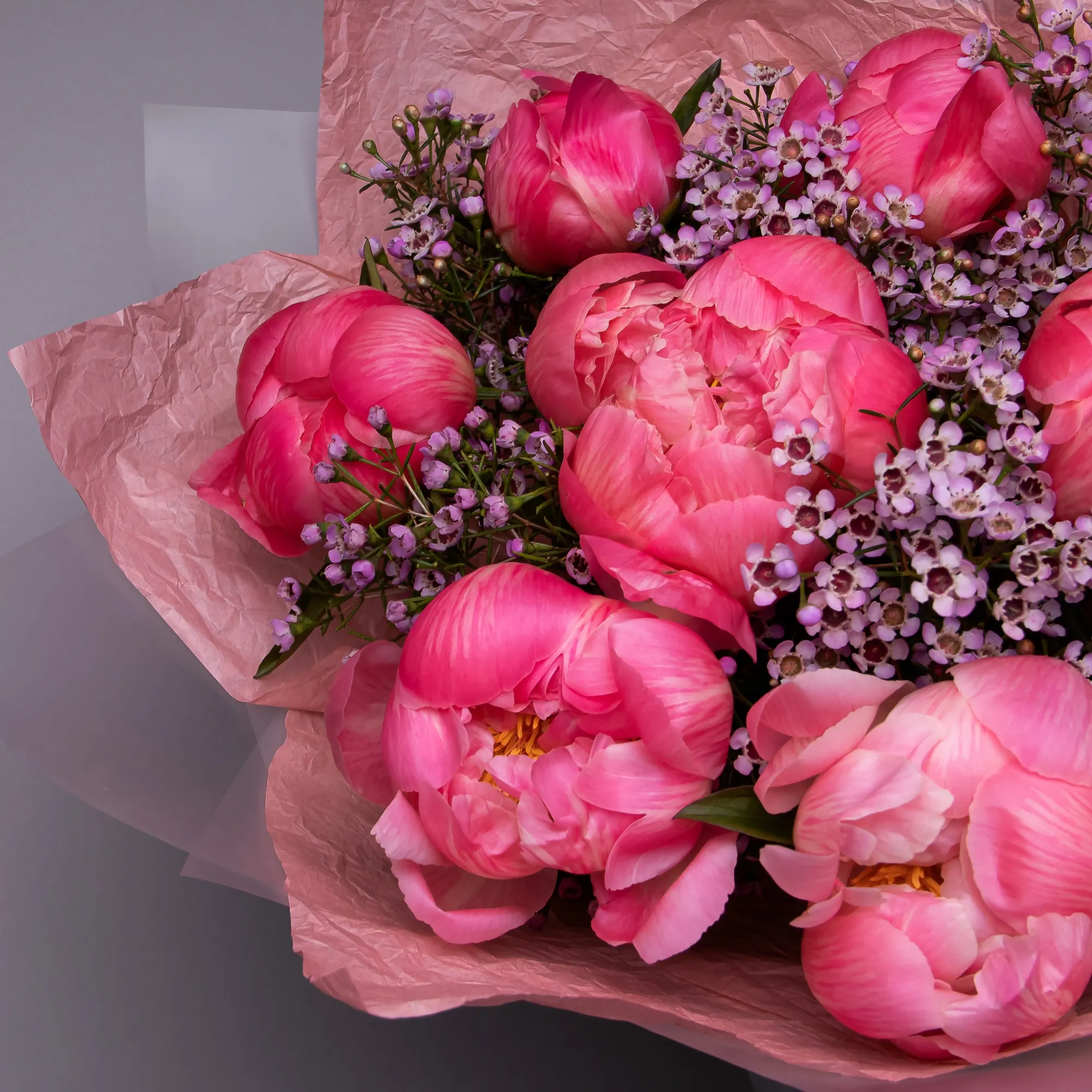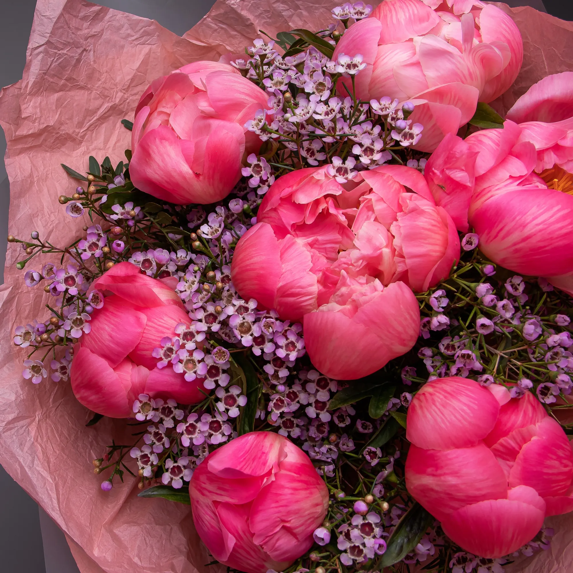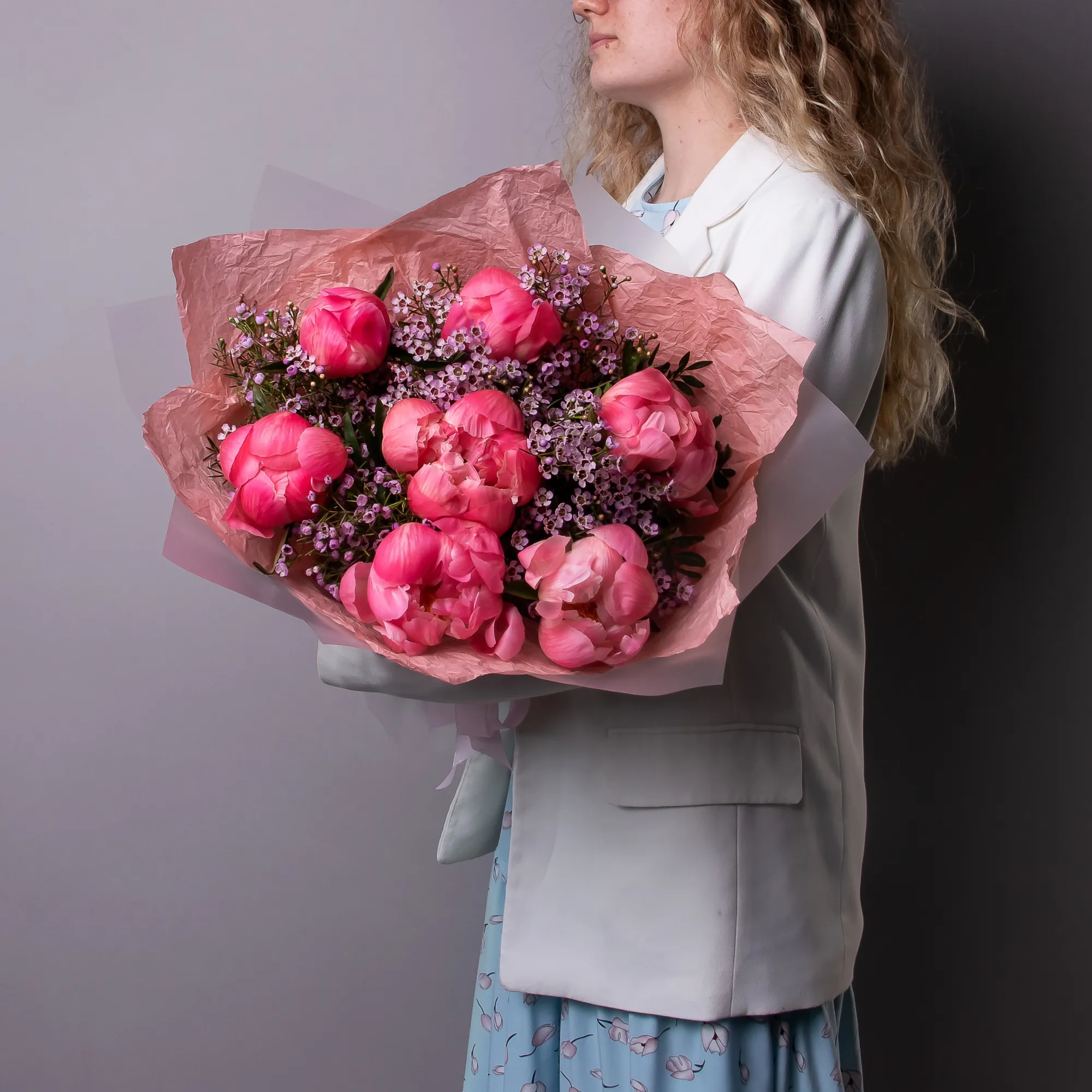 Яркий букет из пионов сорта "Корал Шарм", меняющих цвет в процессе раскрытия, и ароматной лаванды. Гарантированно вскружит голову любой девушке!