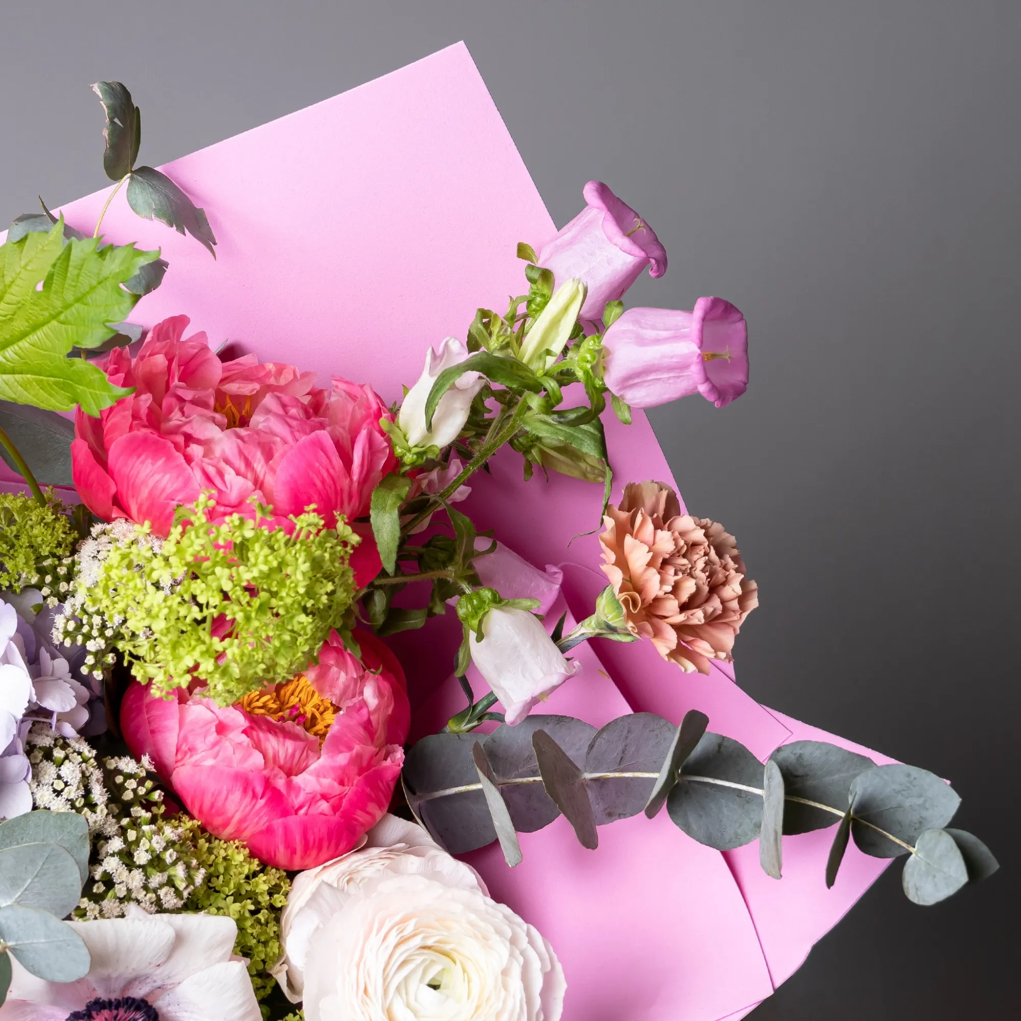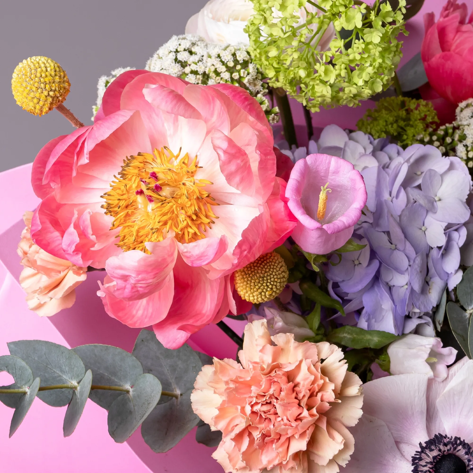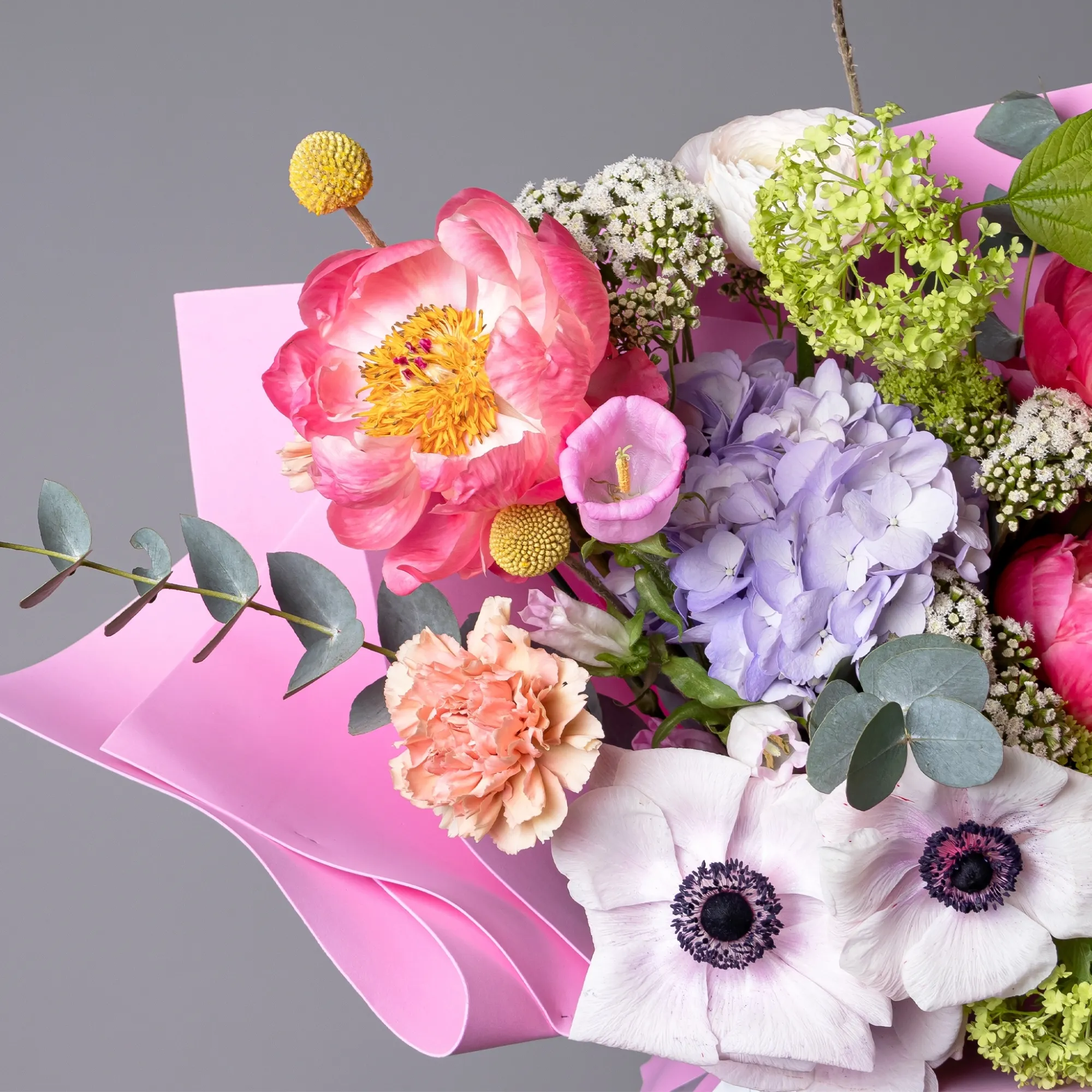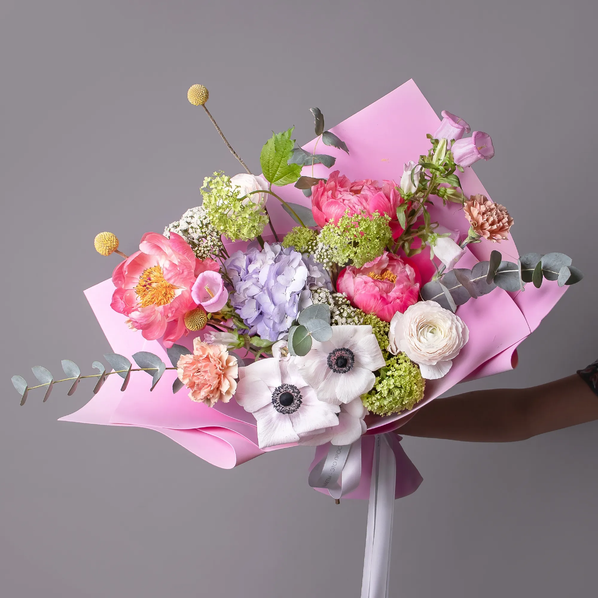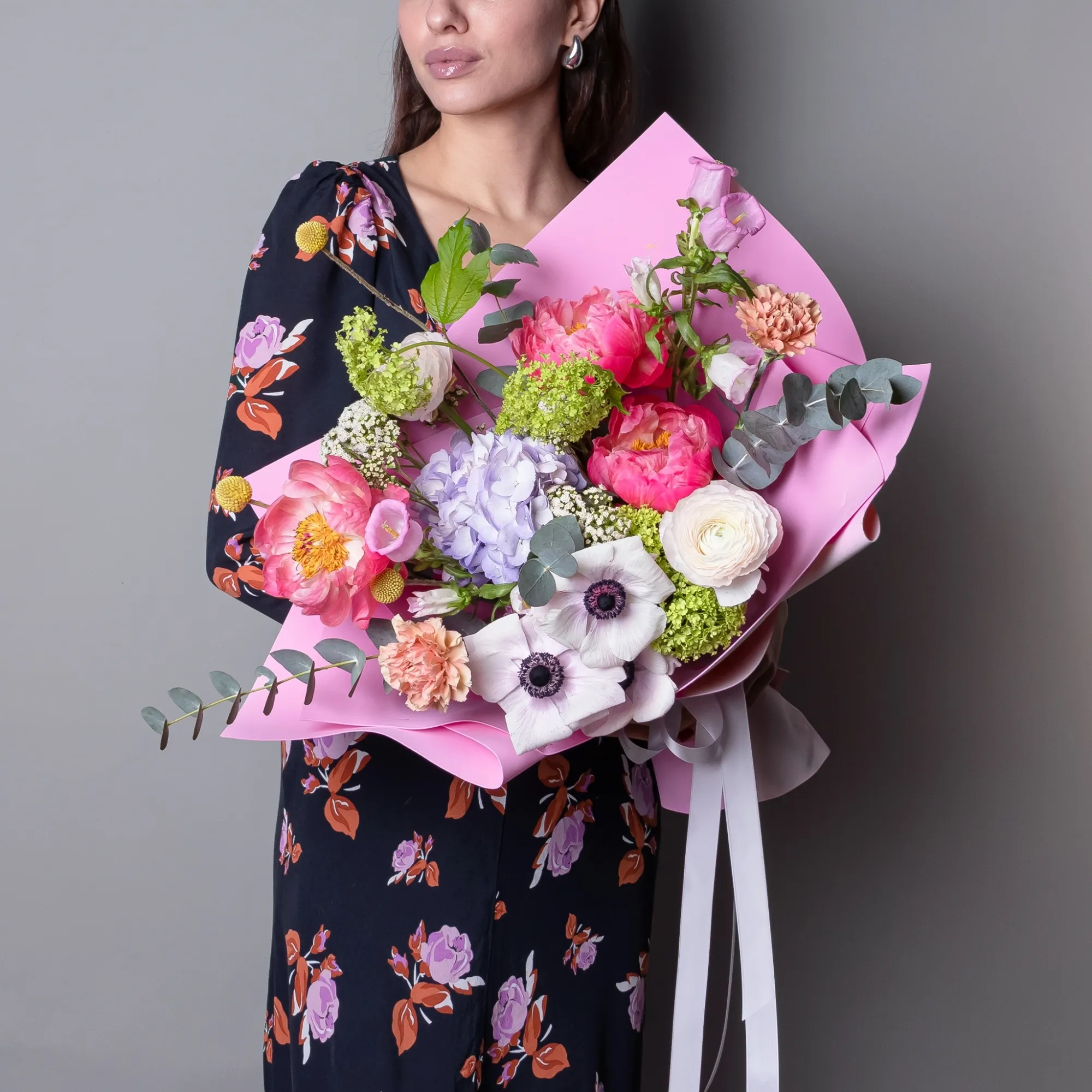 Пион-3, Гвоздика-3, Гортензия-1, Ранункулюс-3, Анемон-3, Листья эвкалипта-6
