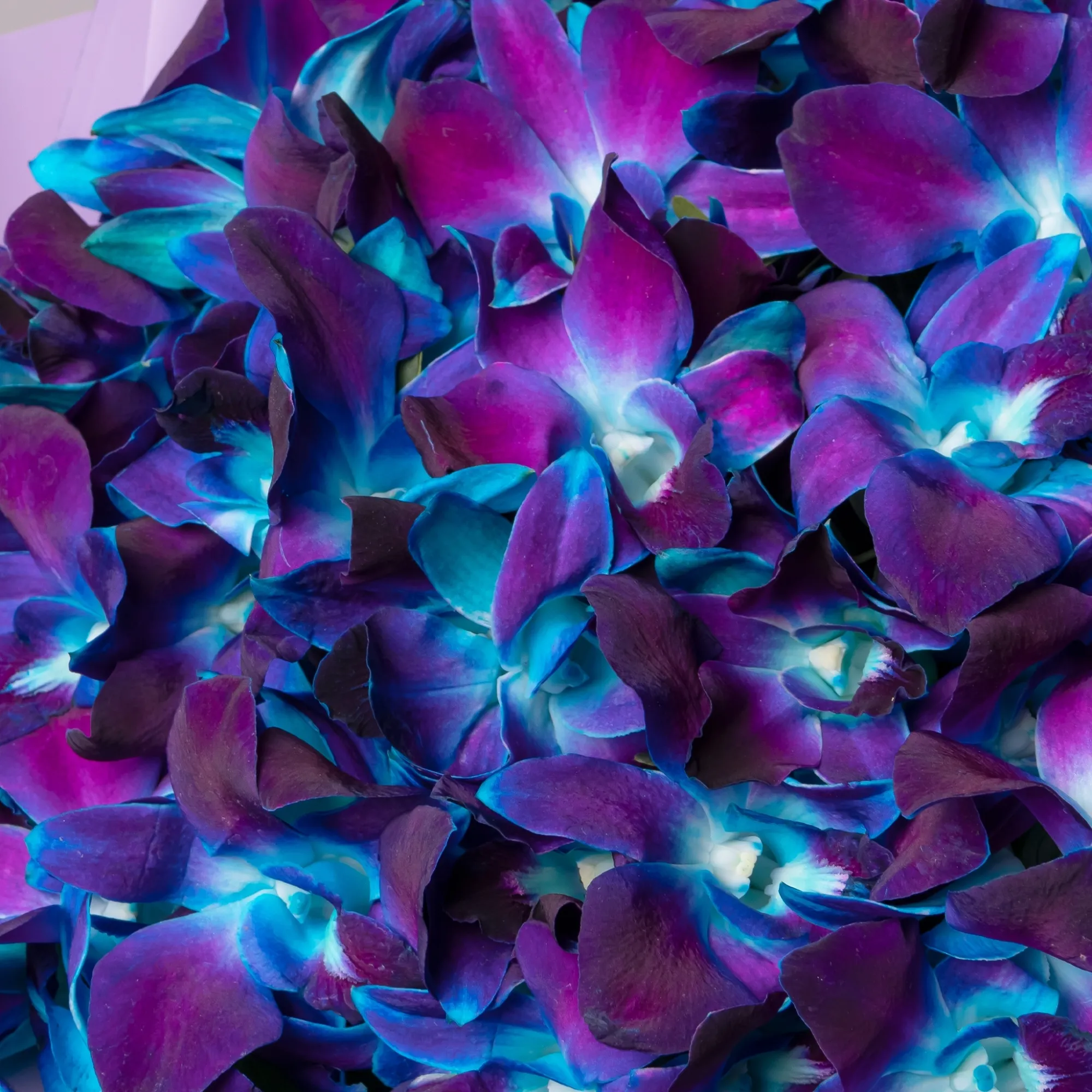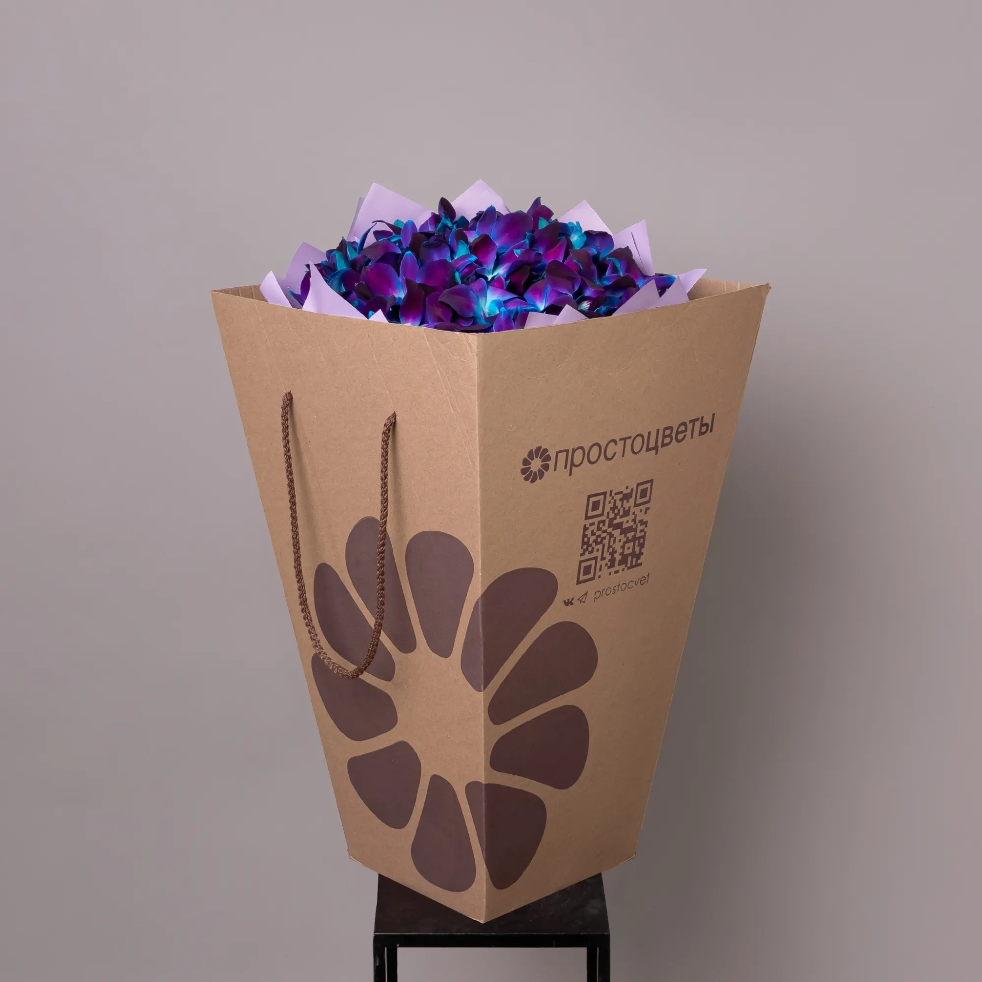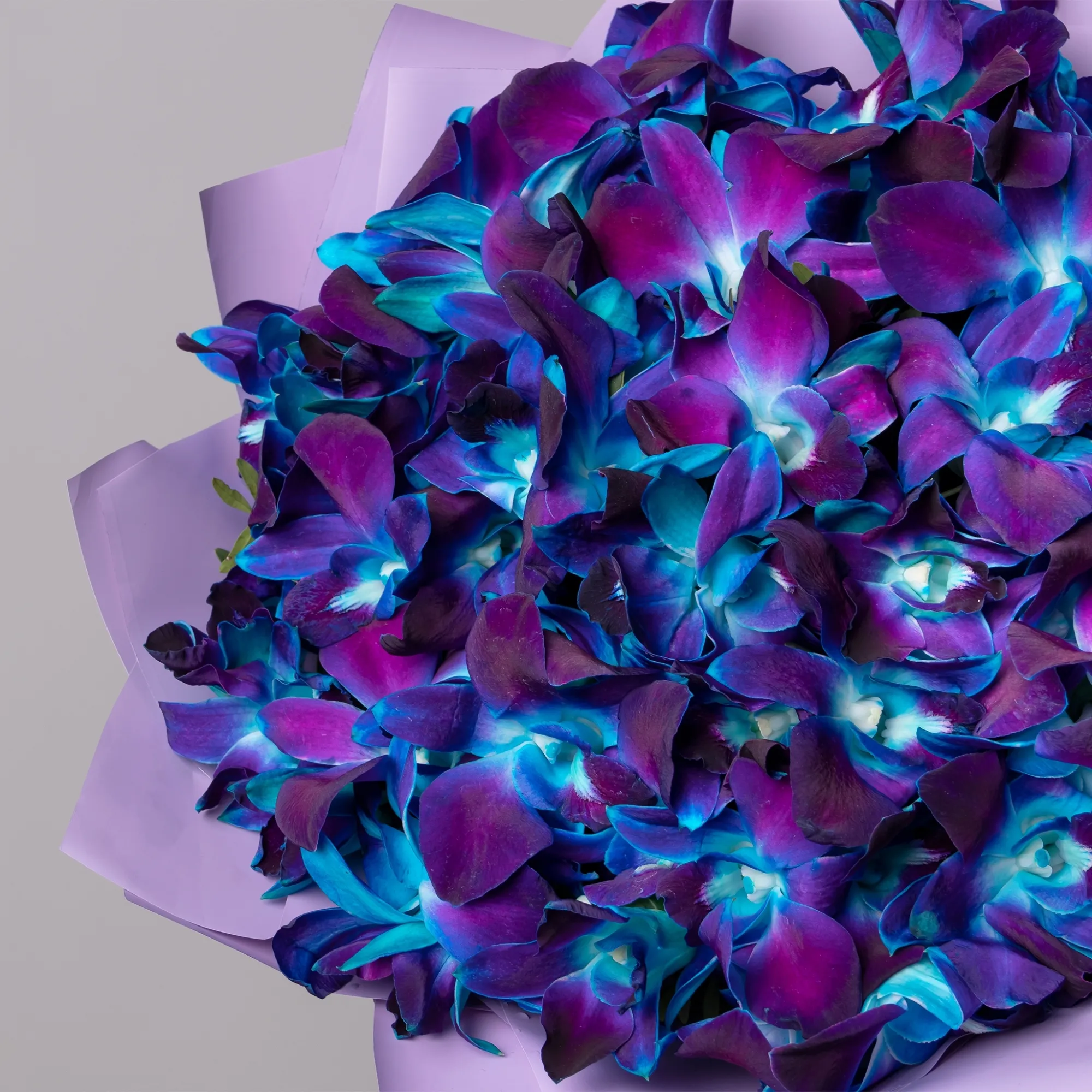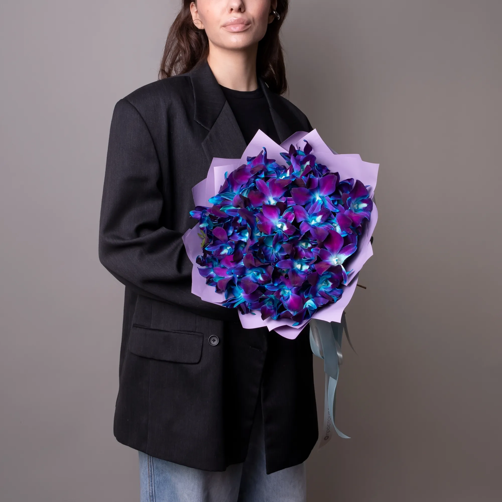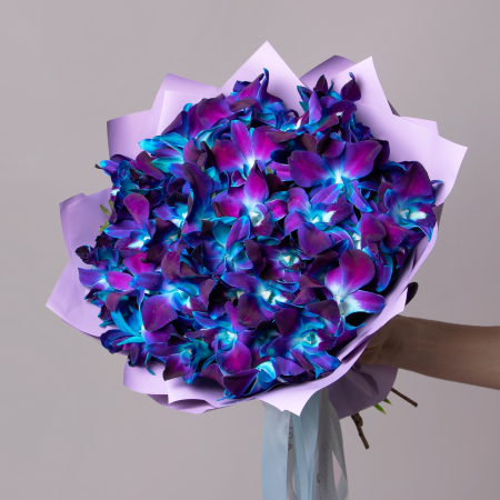 Необыкновенный и загадочный, один из самых необычных букетов в нашем каталоге. В составе яркий многогранный цветок - цимбидиум. Цвет его соцветий меняется с каждым сантиметром: от белоснежного в середине, затем голубого, до насыщенно-синего и лилового по краям.