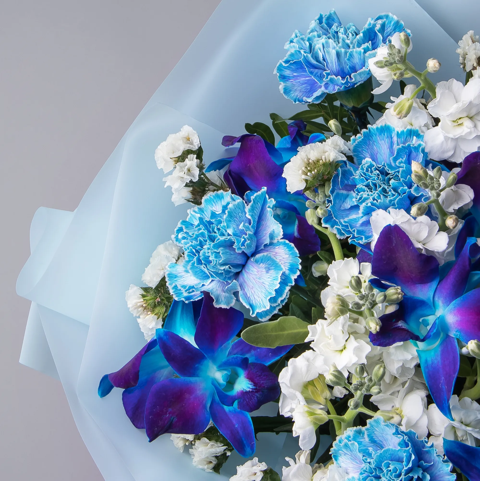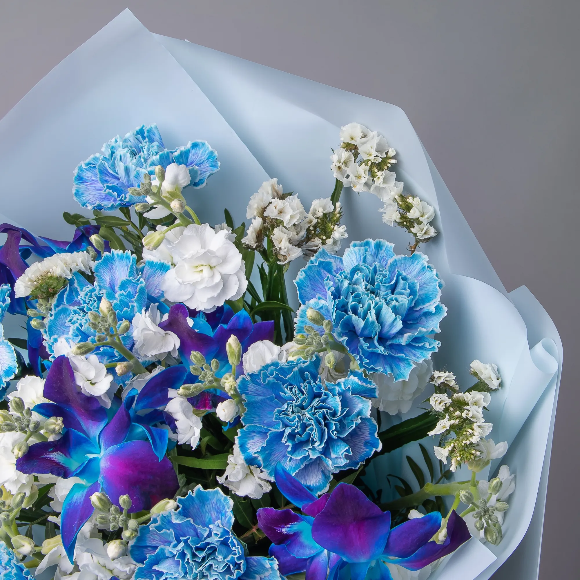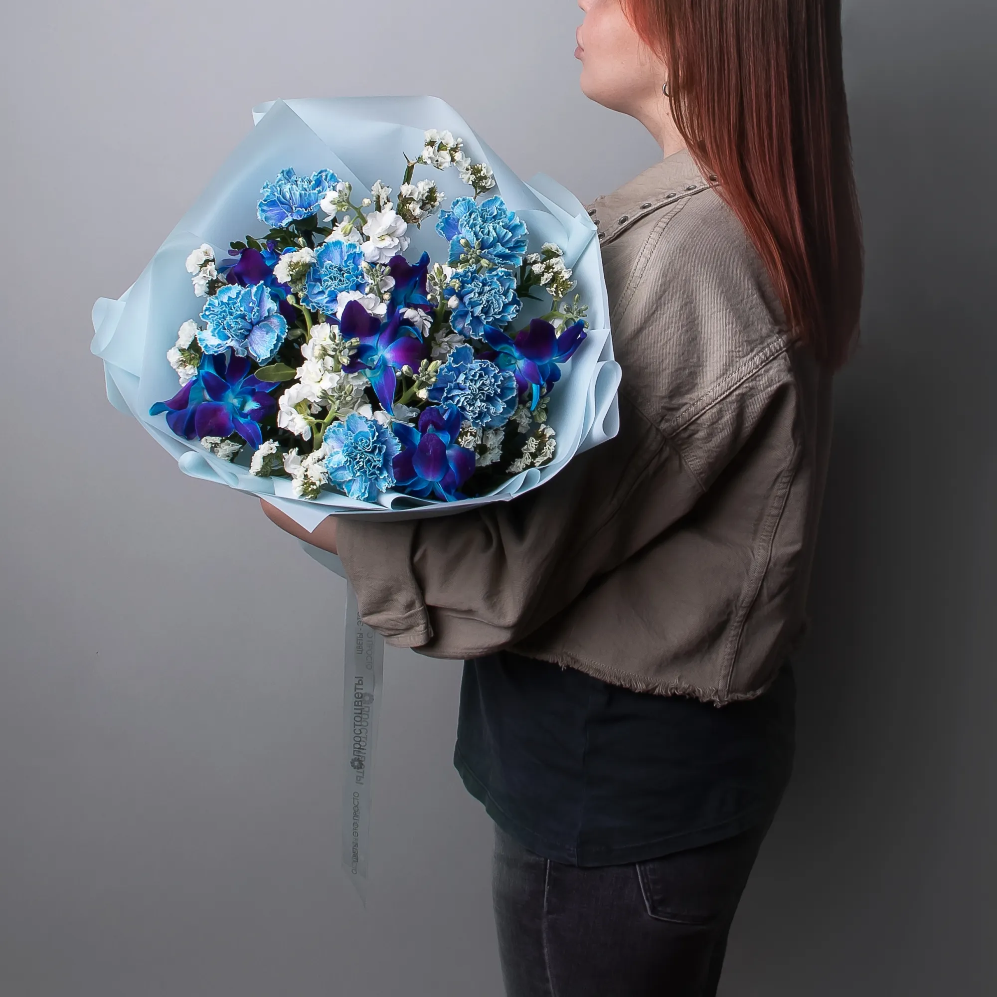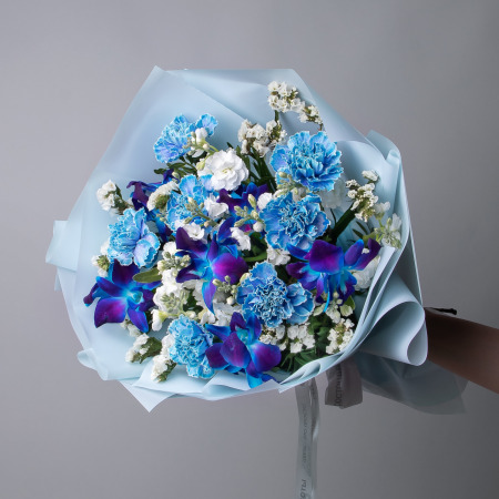 Флористический букет из орхидей космического сине-голубого цвета и ярко-красной розы. Букет, повторяющий цвет волос главной героини потрясающего фильма о любви. И, конечно же, нам тоже хотелось бы уметь стирать память, но только для того, чтобы вы могли снова и снова влюбляться в этот необыкновенный букет.