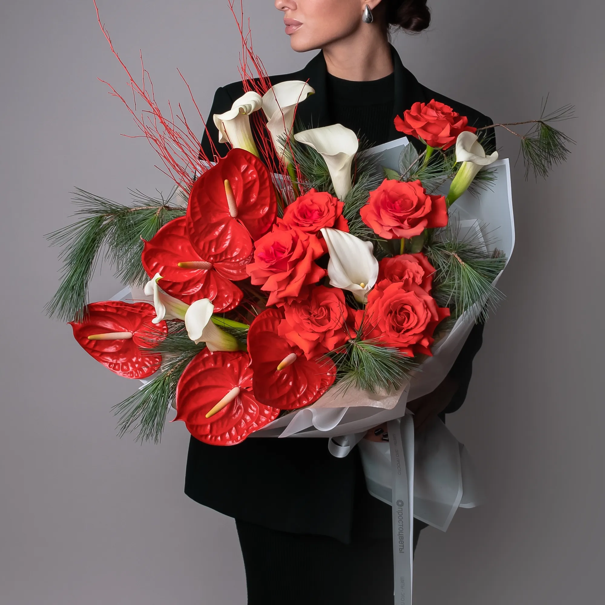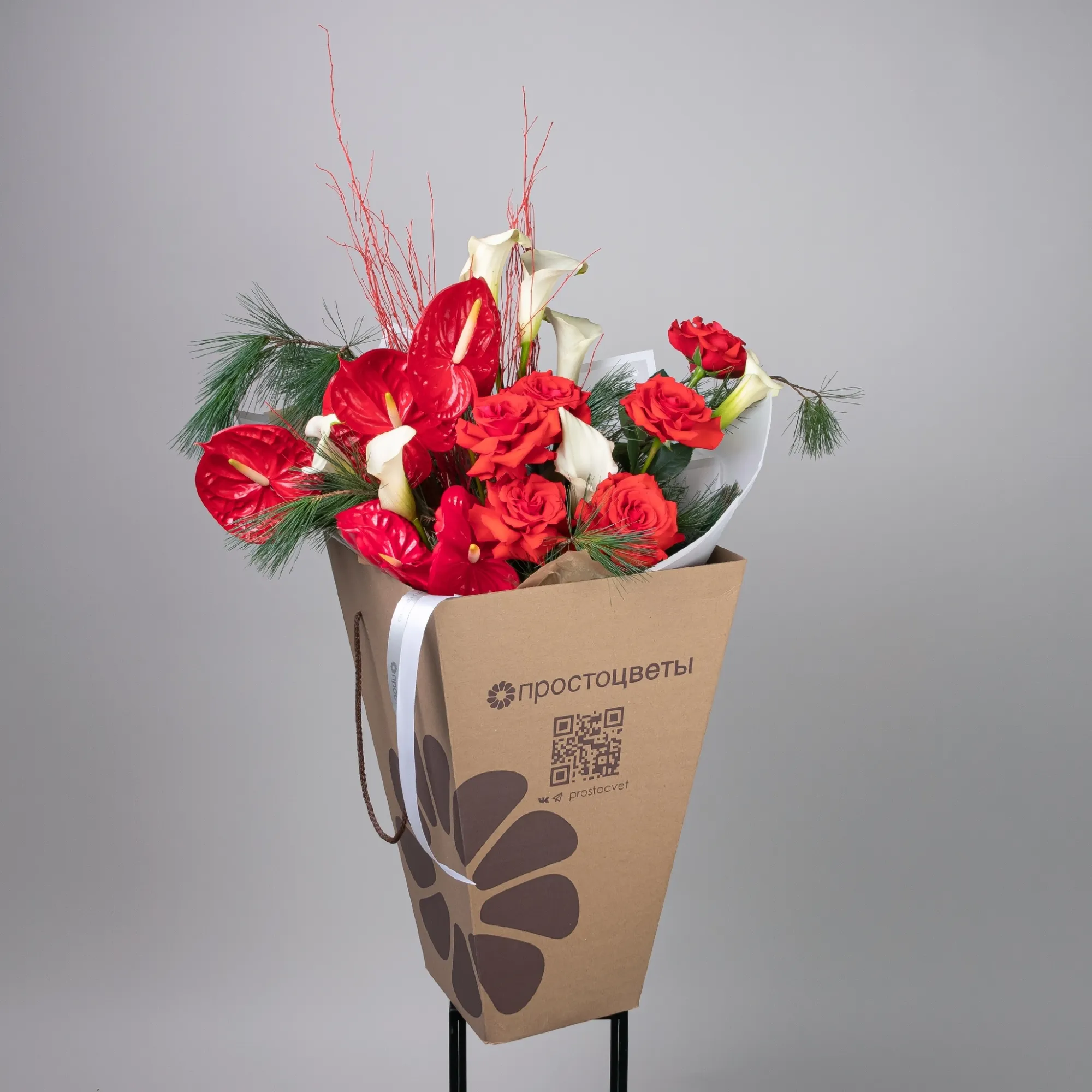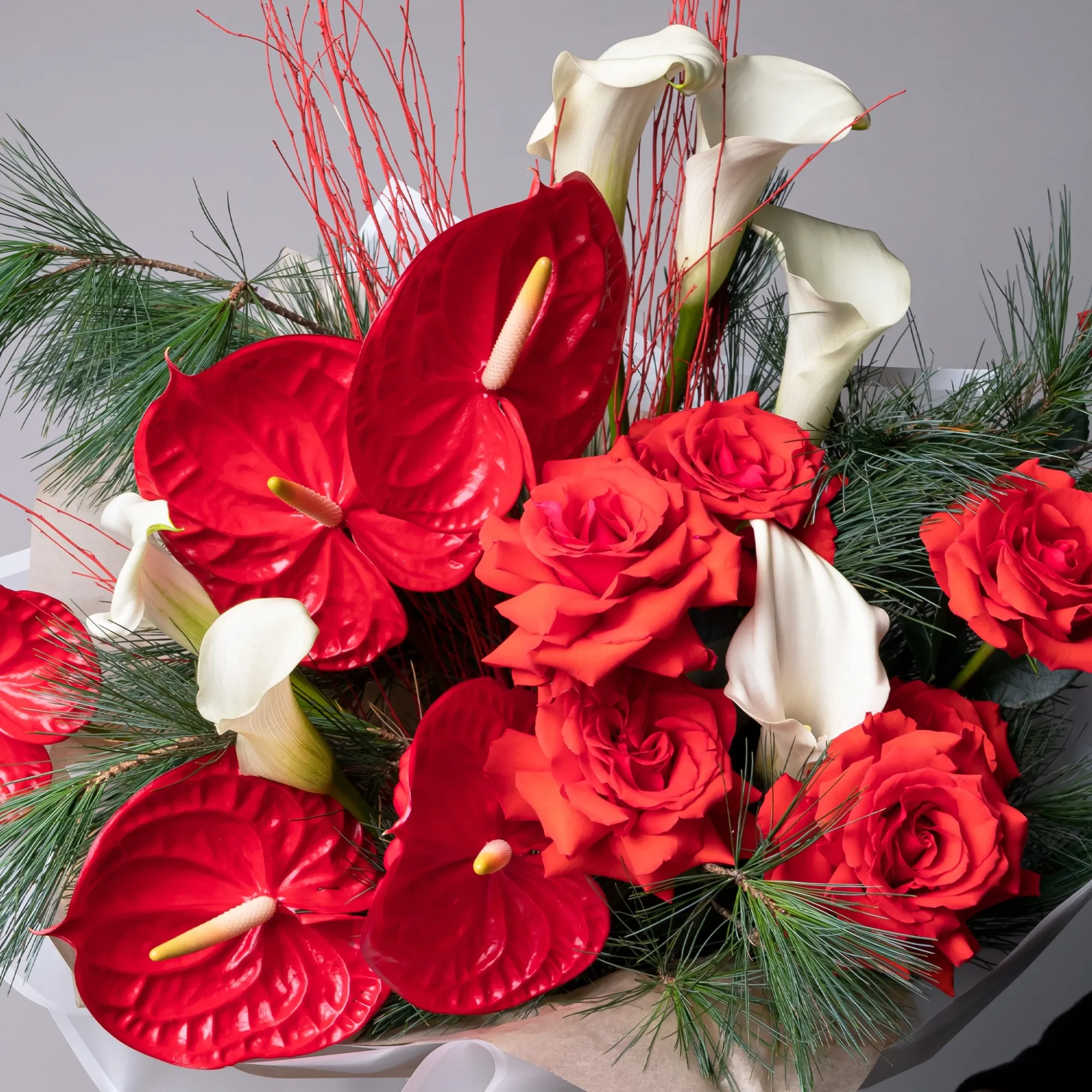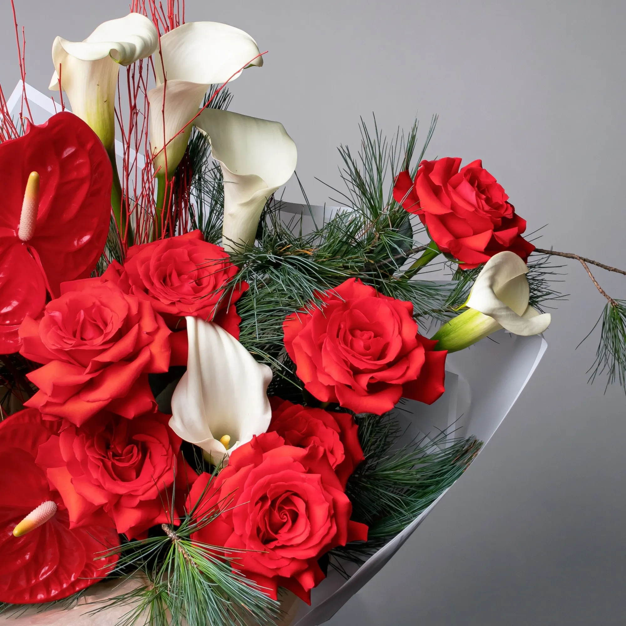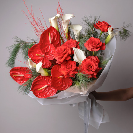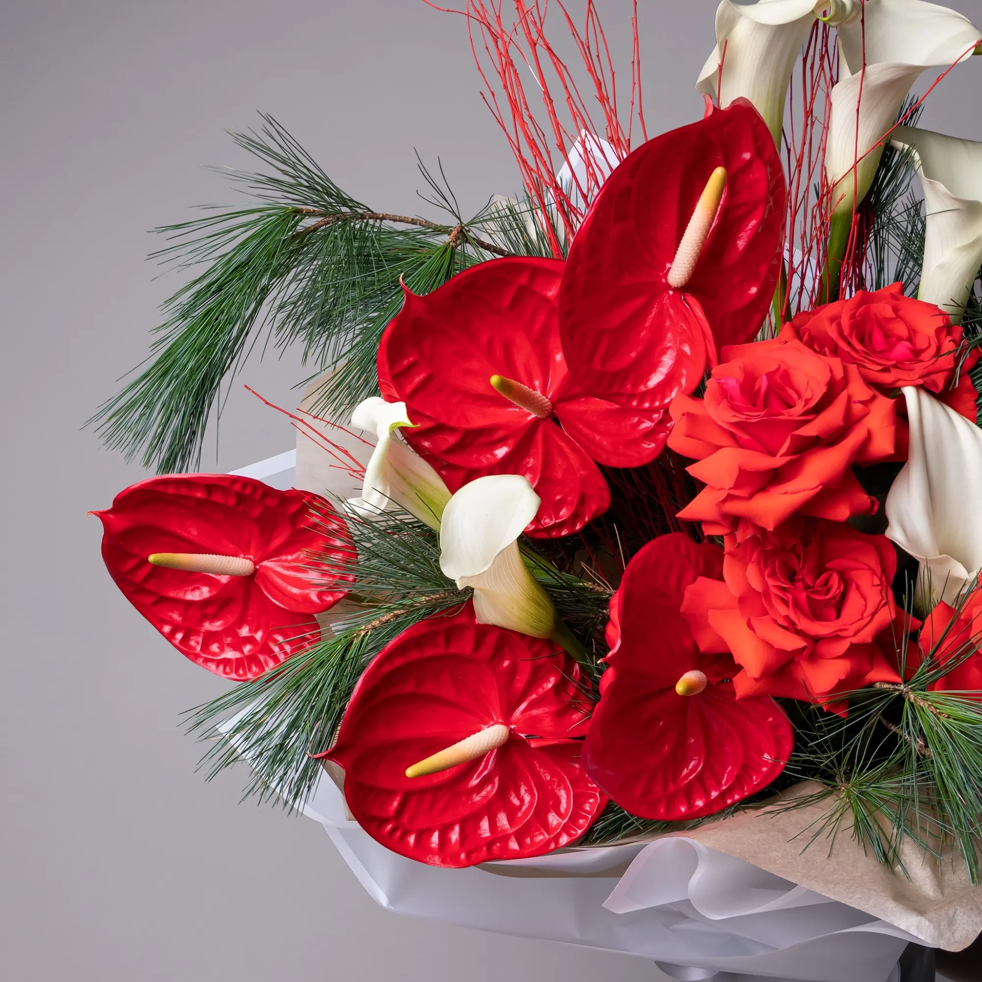 Роза-7, Антуриум-5, Калла-7, Ветки сосны-3, Ветки березы-5