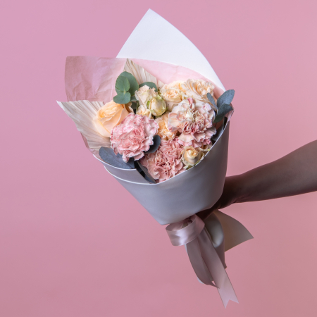 Небольшой милый букетик из светло-розовых и персиковых диантусов, Розы «Аваланш Мэджик», кустовой розы, а также декоративного элемента в виде листьев пальмы в форме копья.