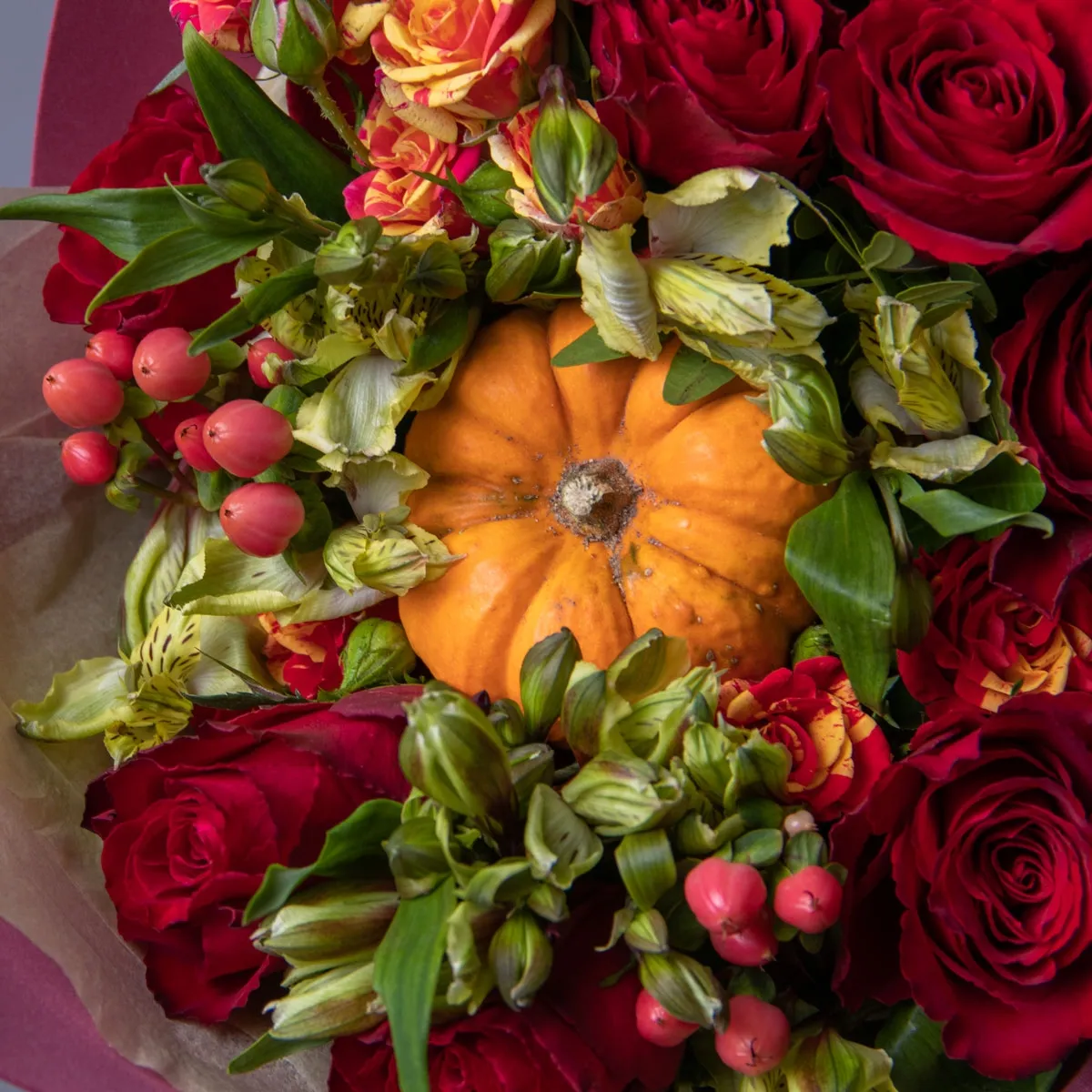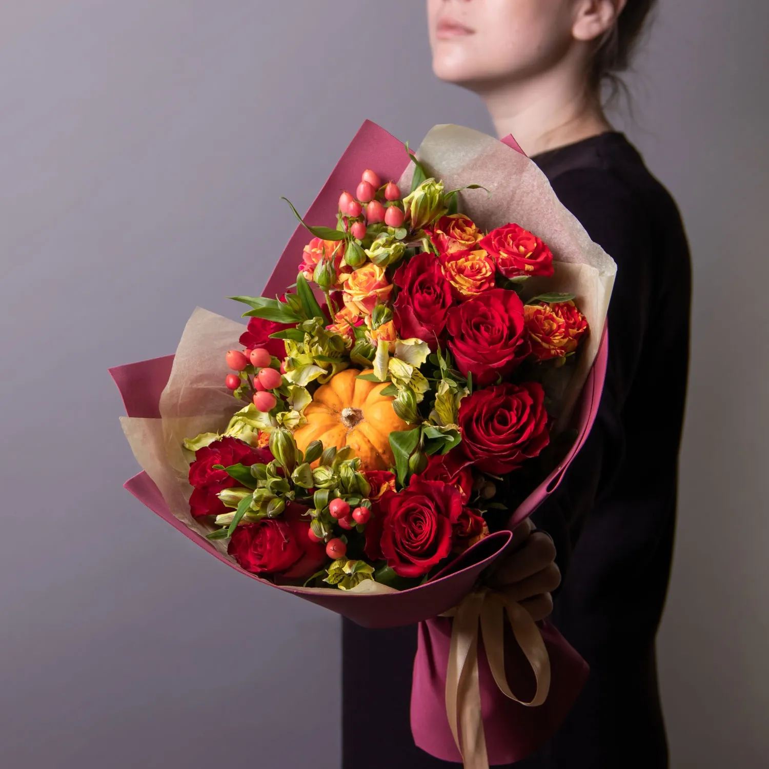 Роза-7, Альстромерия-5, Роза кустовая-3, Тыква-1, Листья фисташки-3
