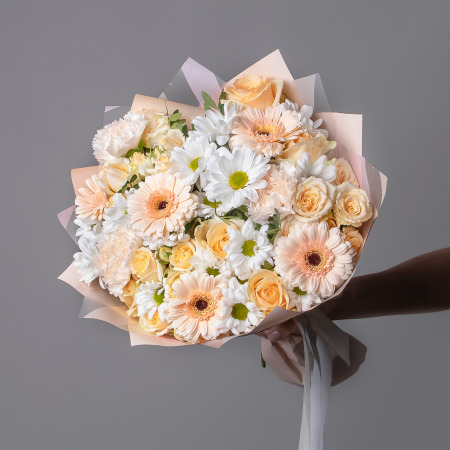 Этот нежный букет в бежево-персиковых оттенках будет прекрасным подарком на день рождения — цветы создадут атмосферу праздника.