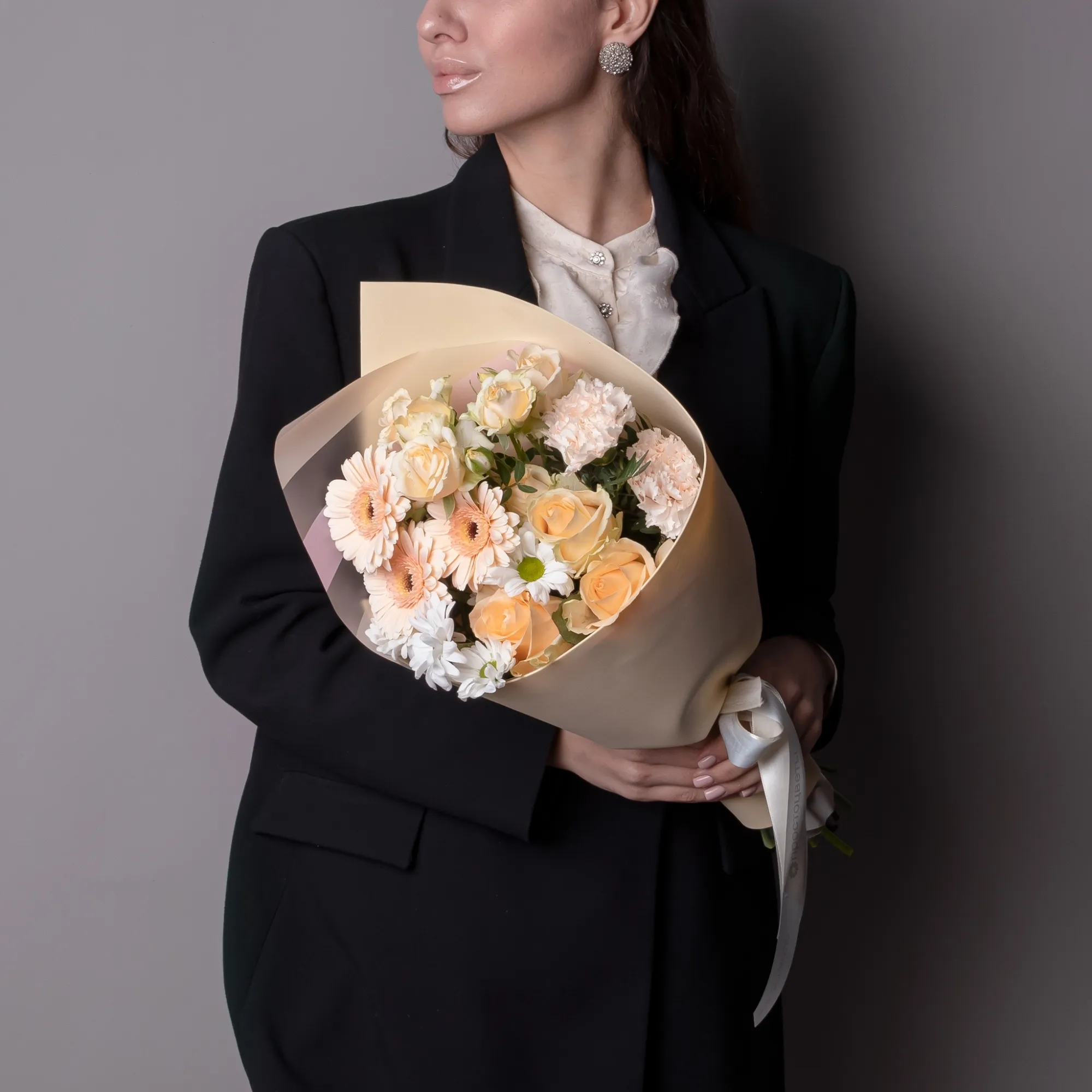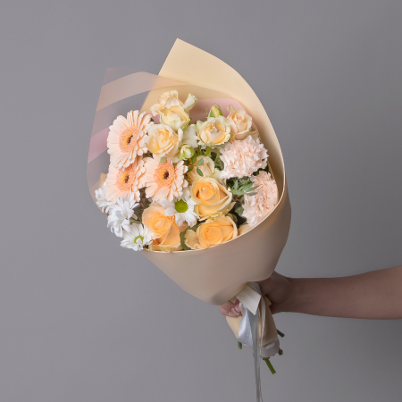В составе букета "Латте" в размере S кремовая гермини, белоснежная хризантема, кремовая роза сорта "Аваланш Мэджик", бежевая кустовая роза "Солинеро" и гвоздика оттенка крем-брюле. Букет дополнен листьями фисташки.