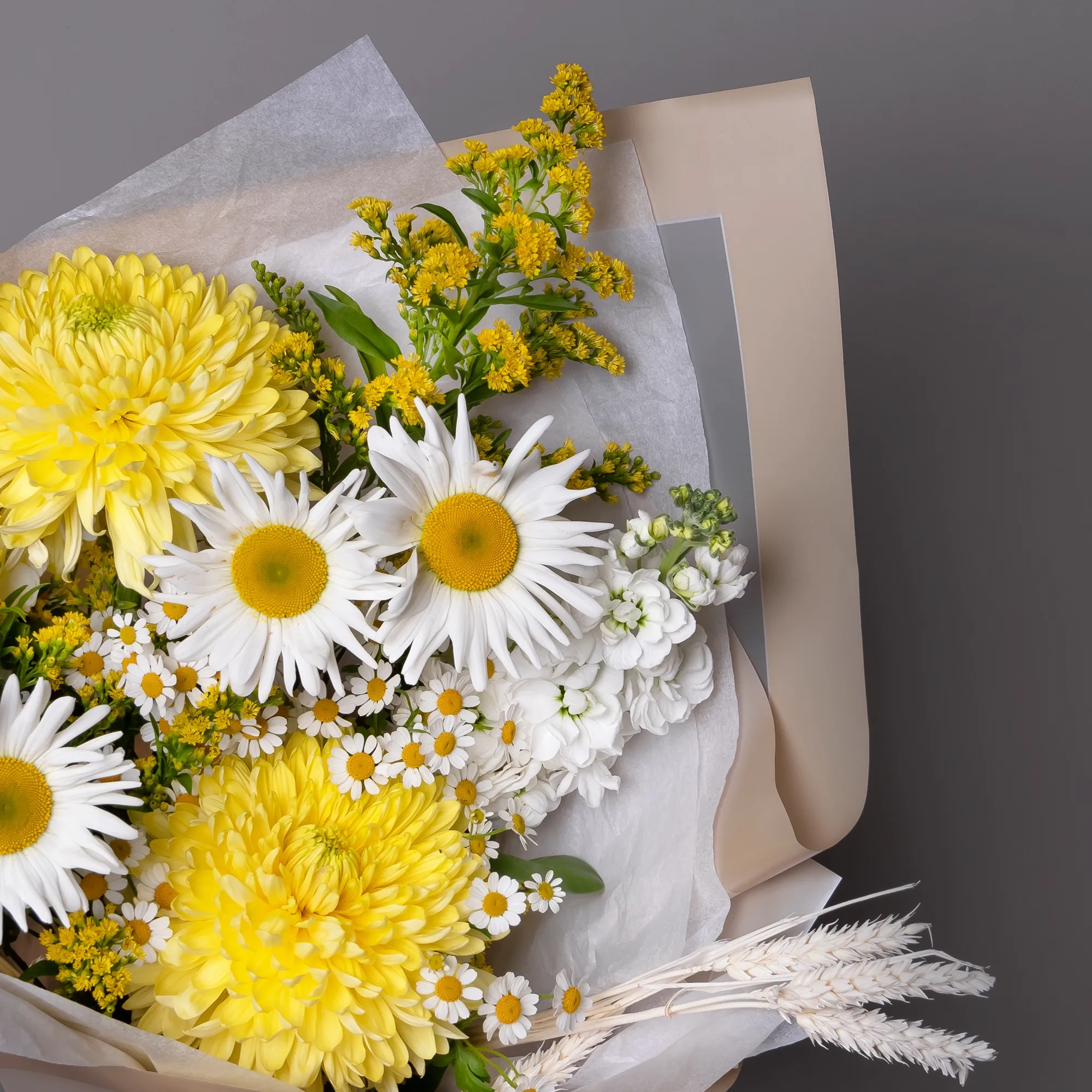 В составе букета "Летний Каприз" кустовая роза "Сноу флейк", жёлтая хризантема, белая маттиола, жёлтый солидаго, белая матрекария, белая ромашка, дополнен сухоцветом пшеница. Этот букет идеально подойдёт для следующих случаев: *Свадебное торжество или оформление выездной церемонии, сочетание белоснежных цветов с золотистыми акцентами создает торжественную, но при этом естественную атмосферу, кустовые розы "Сноу флейк" придают букету элегантность, а сухоцвет пшеница добавляет романтичные деревенские нотки, что особенно актуально для летних свадеб. *Поздравительный букет для юбиляра или именинника, насыщенная композиция с преобладанием светлых оттенков символизирует чистоту и светлые пожелания. Разнообразие цветов в букете создает впечатление щедрости и богатства, что делает его отличным подарком для особых дат, пшеница в составе символизирует долголетие и благополучие. Закажите букет с доставкой или заберите самовывозом. И помните, что цветы - это просто.