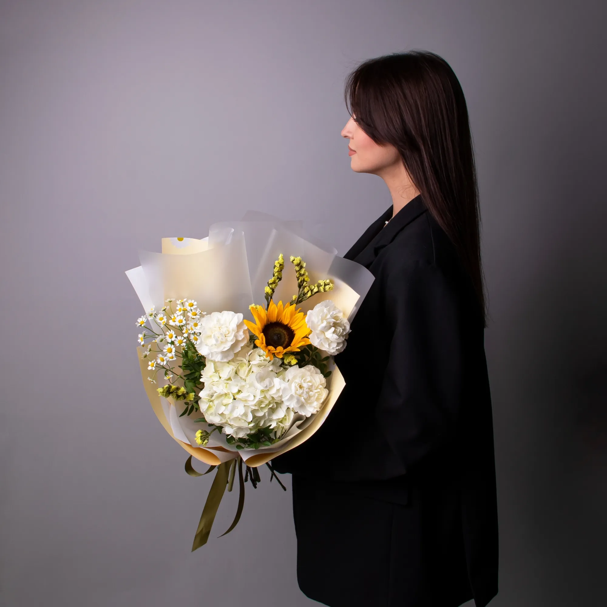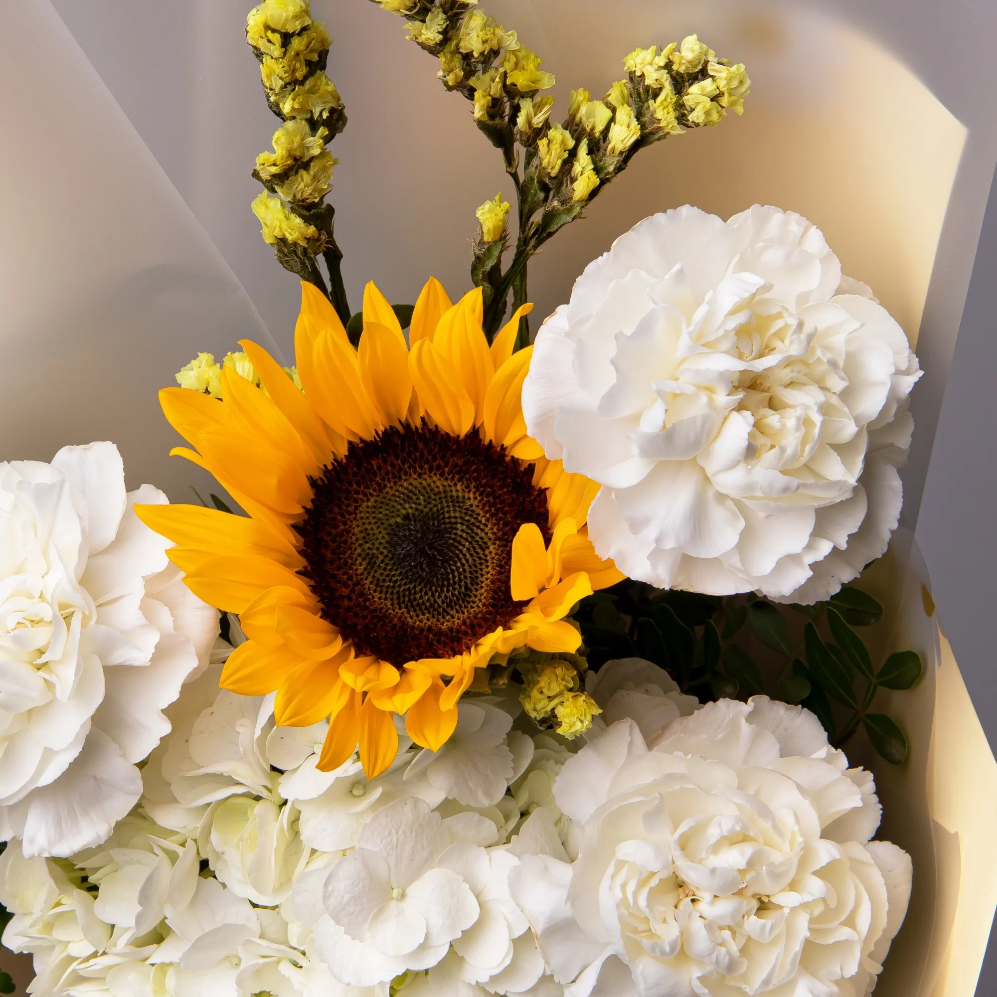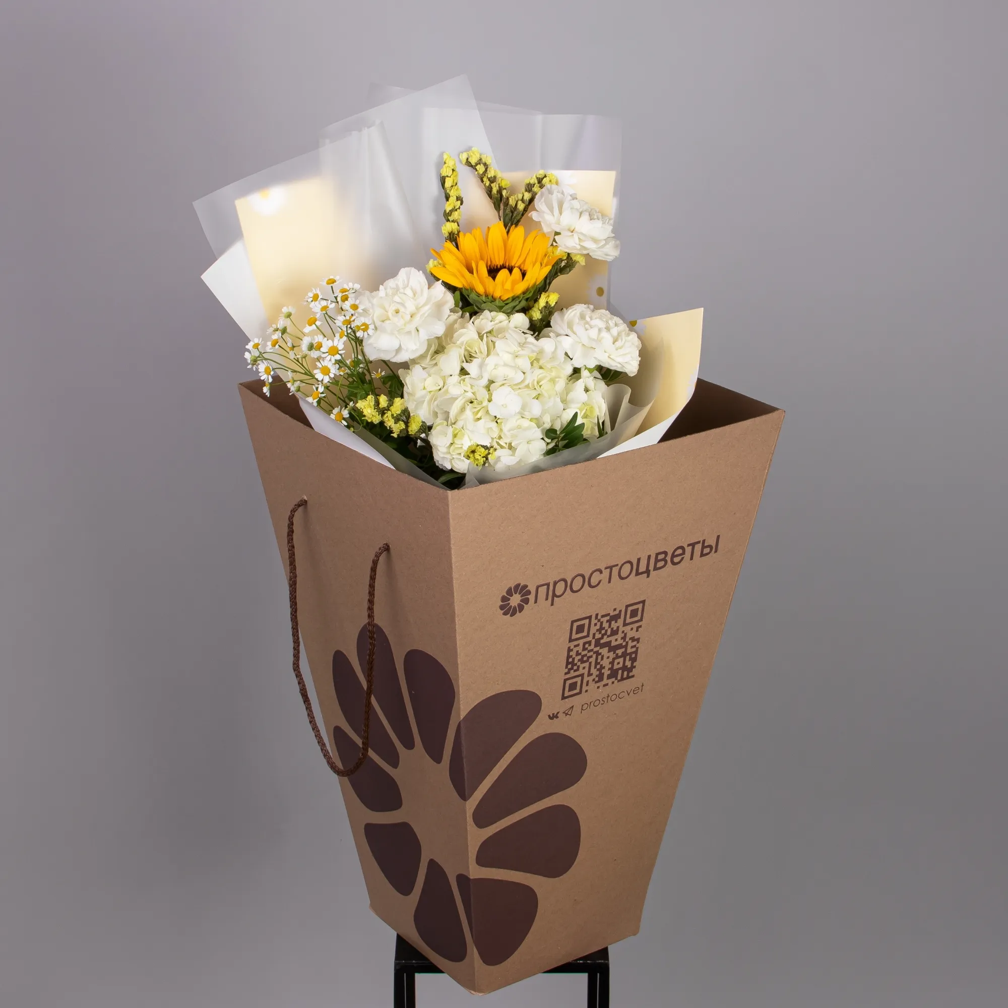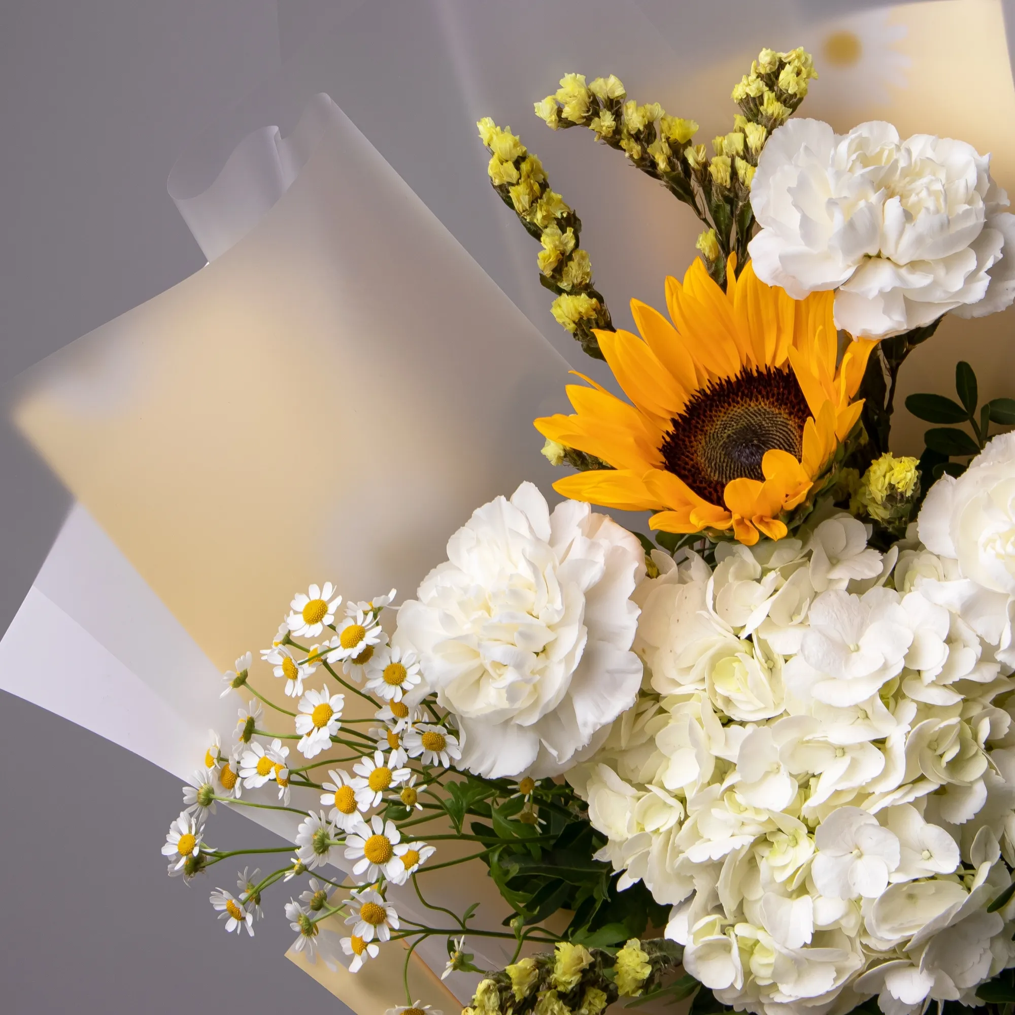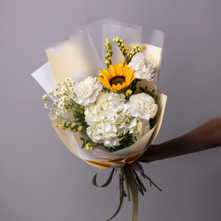 В составе букета "Летний хит 1" белая гвоздика, белая матрекария, оранжевый гелиантус, белая гидрангия, желтая статица, дополнен листьями фисташки. Букет идеально подойдет для поздравления близкого с днем рождения, сочетание белых цветов с теплым оражевым оттенком гелиантуса создает радостную, светлую композицию, которая будет радовать получателя. А также для поздравления с успешным завершением проекта, яркий и позитивный букет отлично подойдет для награждения коллеги или делового партнера. Закажите букет с доставкой или заберите самовывозом. И помните, что цветы - это просто.