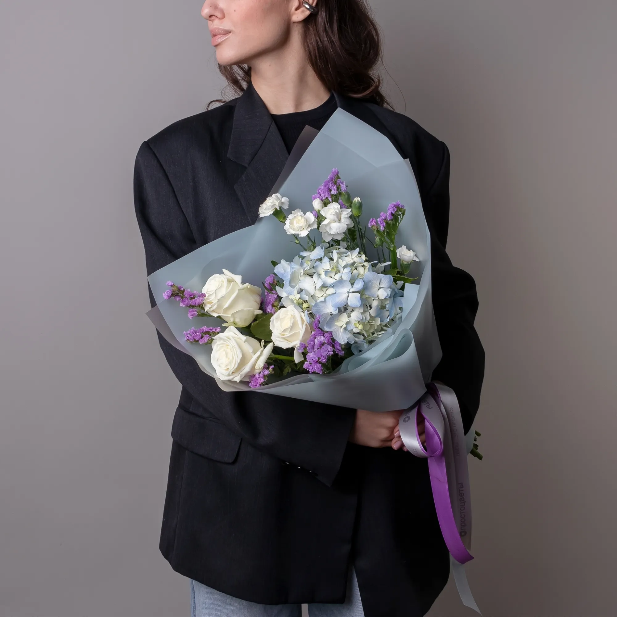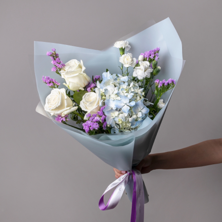 В составе букета "Летний хит 2" сиреневая статица, голубая гидрангия, белая гвоздика, роза "Плайа.бланка", дополнен листьями фисташки. Этот букет подходит для романтического свидания - нежный букет в пастельных тонах идеально подойдет для выражения чувств. Также эта изысканная композиция в благородных тонах прекрасна в качестве подарка на юбилей или годовщину Закажите букет с доставкой или заберите самовывозом. И помните, что цветы - это просто.