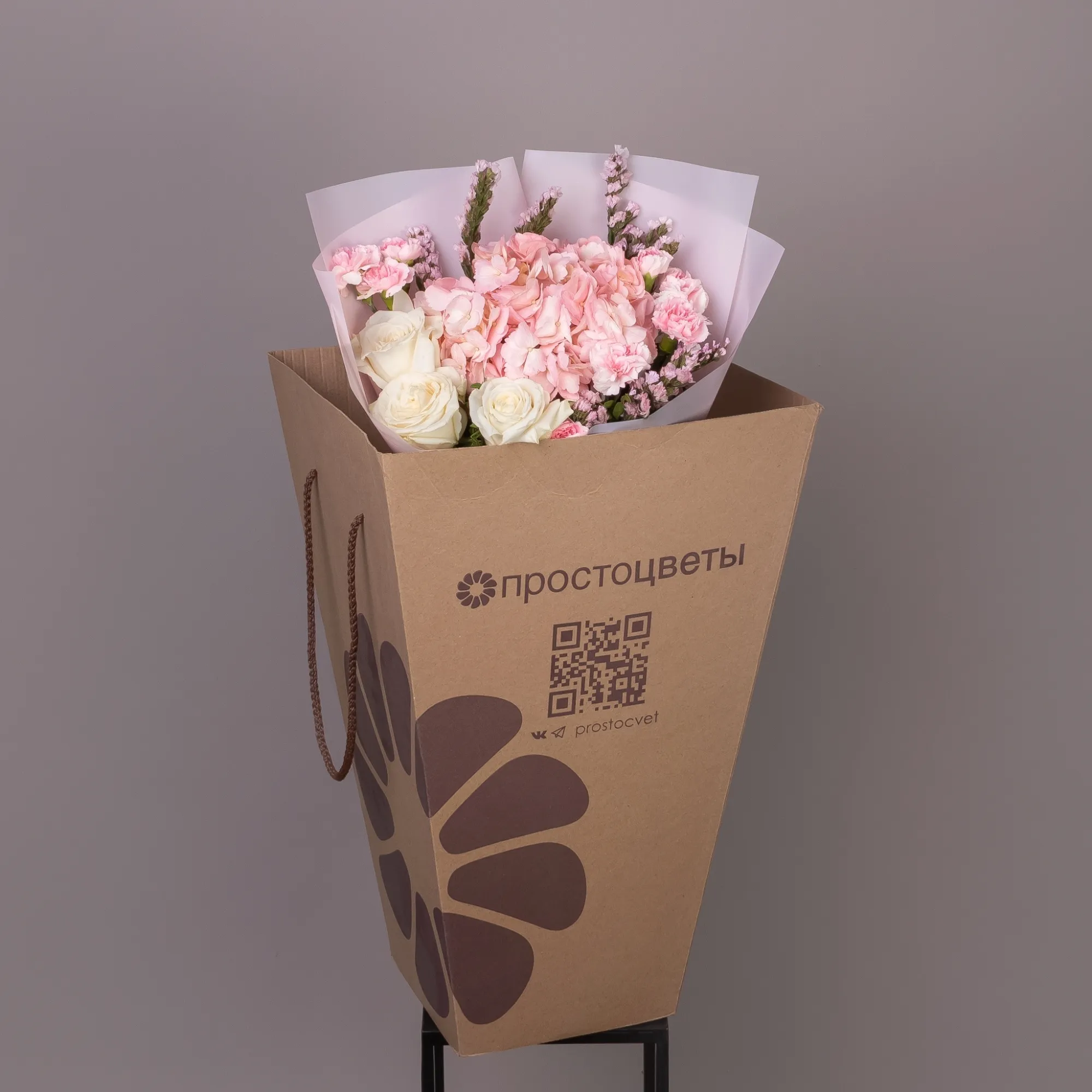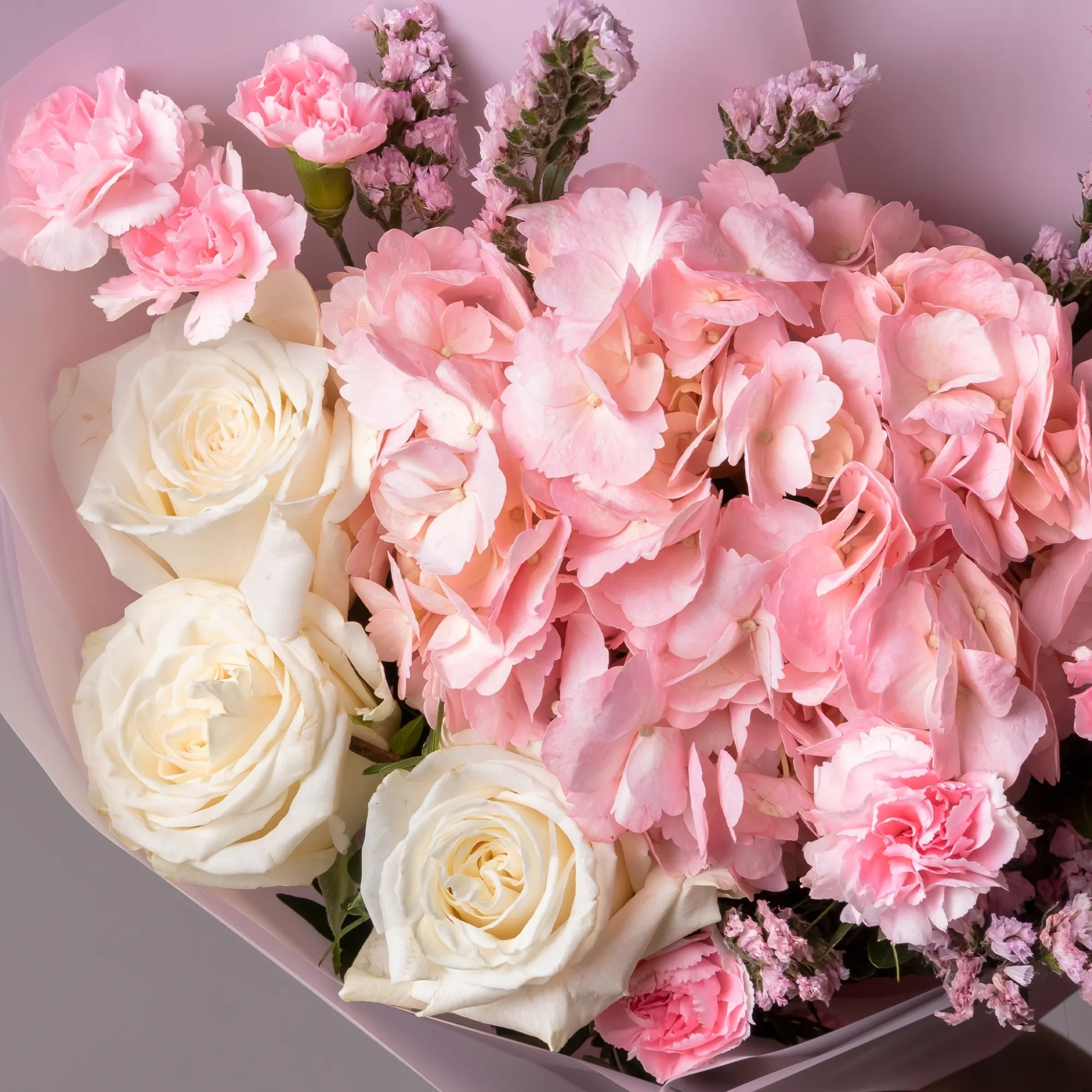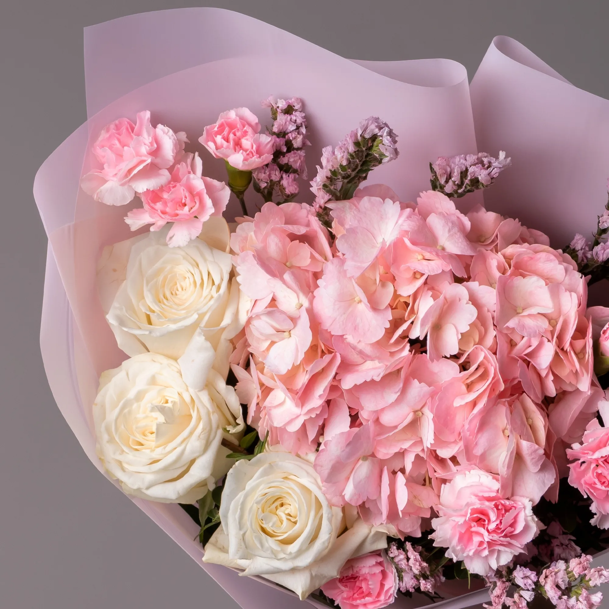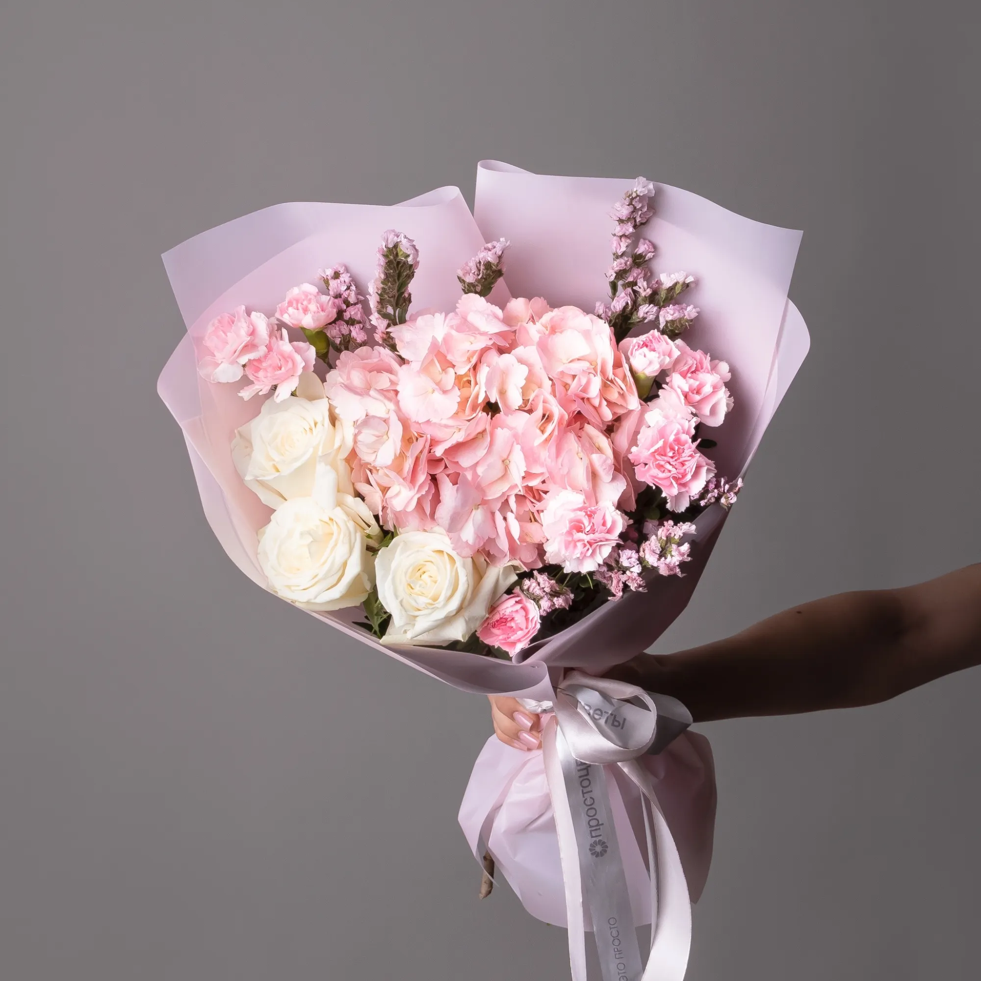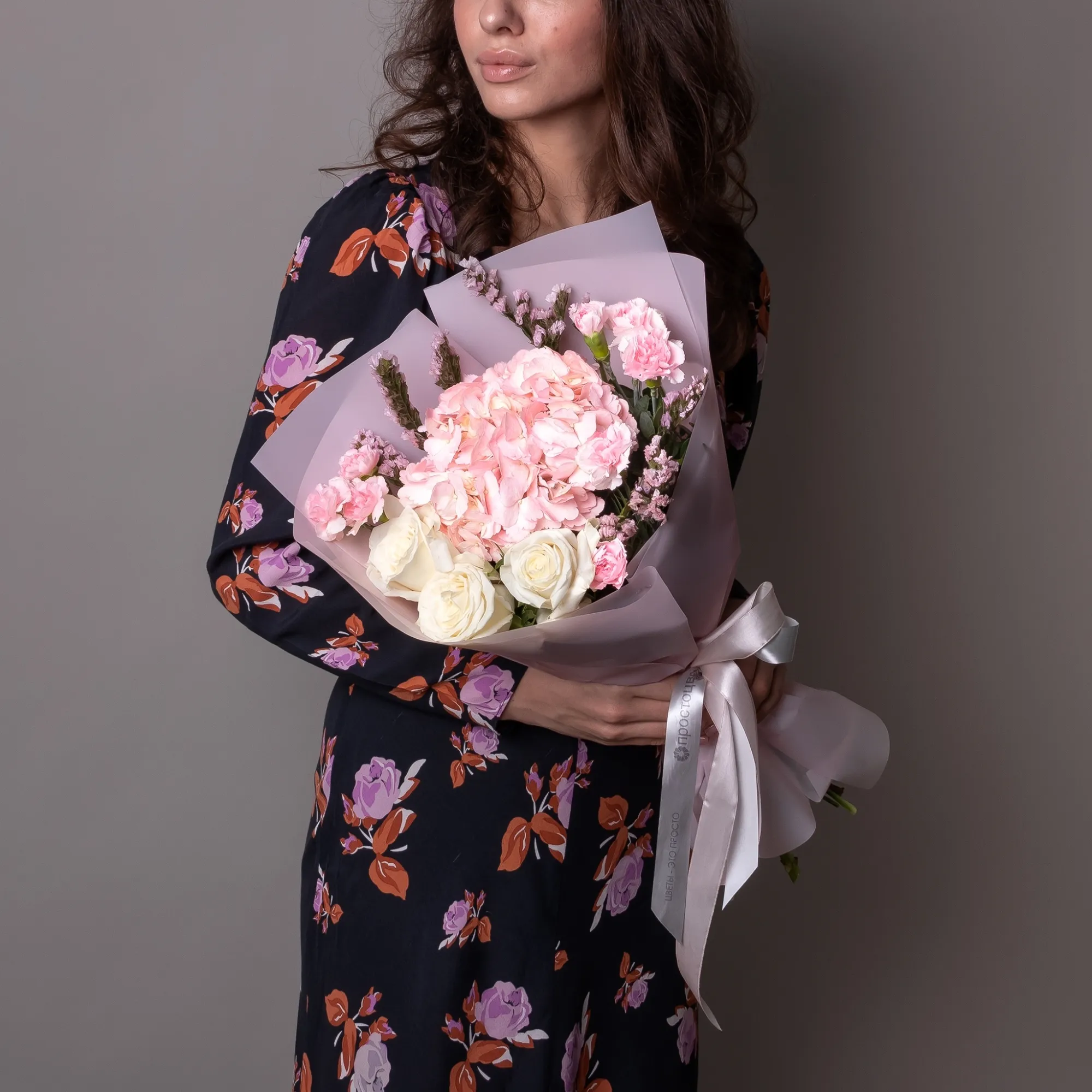В составе букета "Летний хит 3" розовая статица, роза "Плайа бланка", розовая гидрангия, розовая гвоздика, дополнен листьями фисташки. Этот нежный букет в пастельных тонах идеально передаст чувства в самый романтический праздник - день влюбленных. Также этот букет отлично подойдет для предложения руки и сердца - романтическая розовая композиция создаст незабываемую атмосферу для важного момента.Закажите букет с доставкой или заберите самовывозом. И помните, что цветы - это просто.