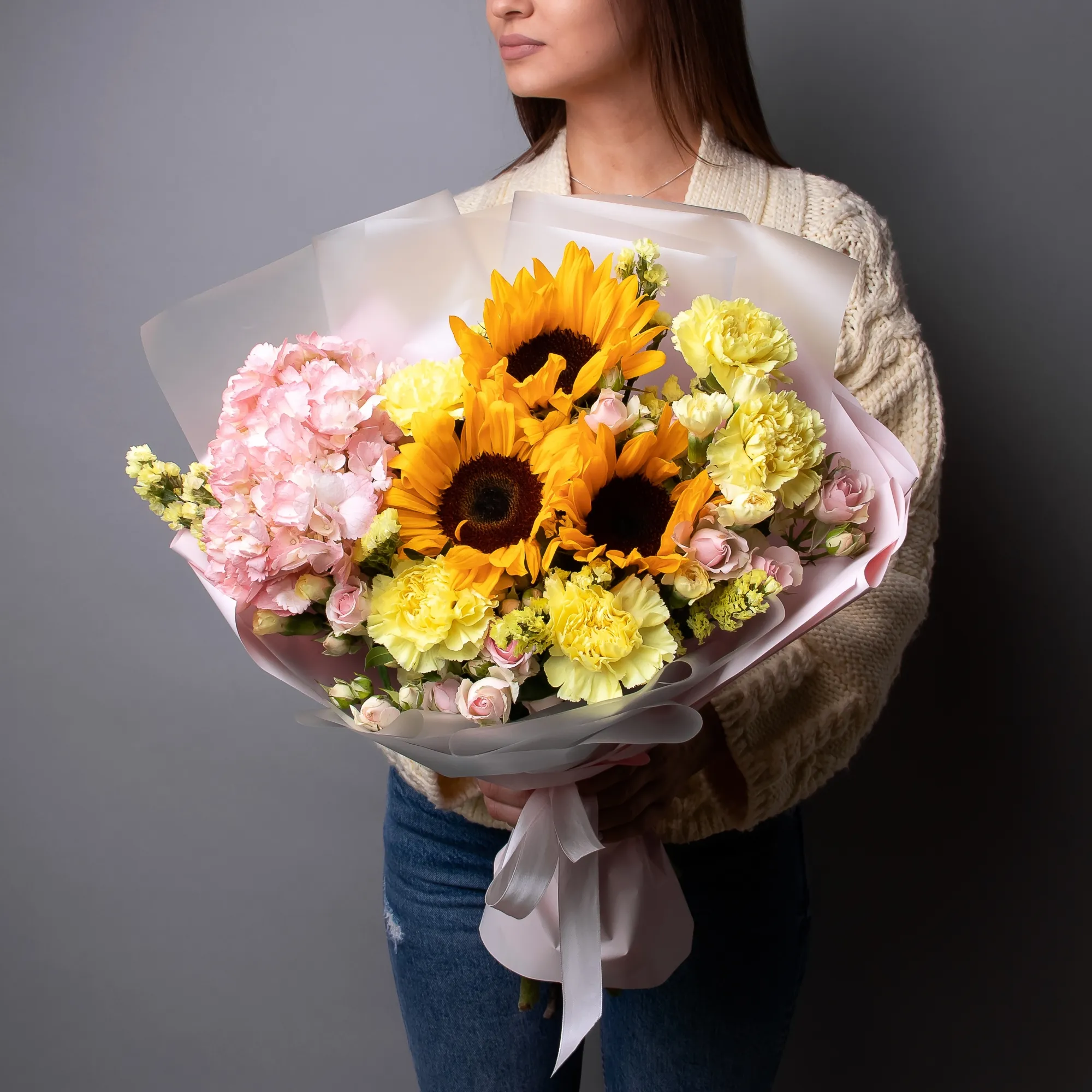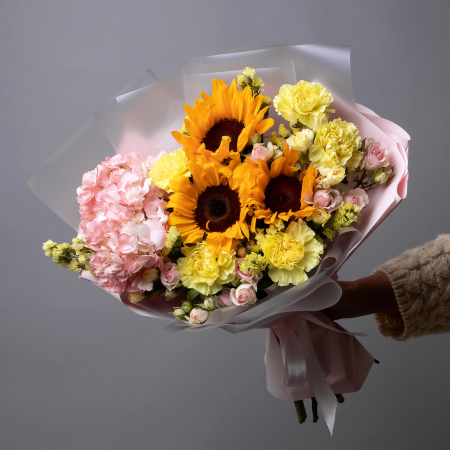 Букет Летний поцелуй М из гвоздики, роз и подсолнухов