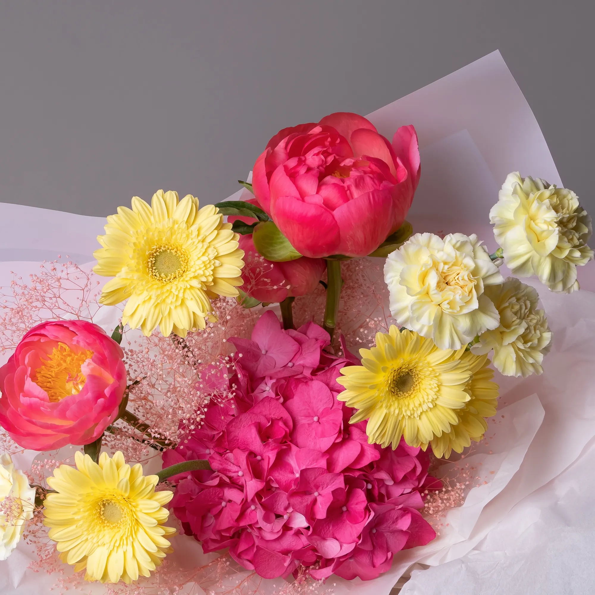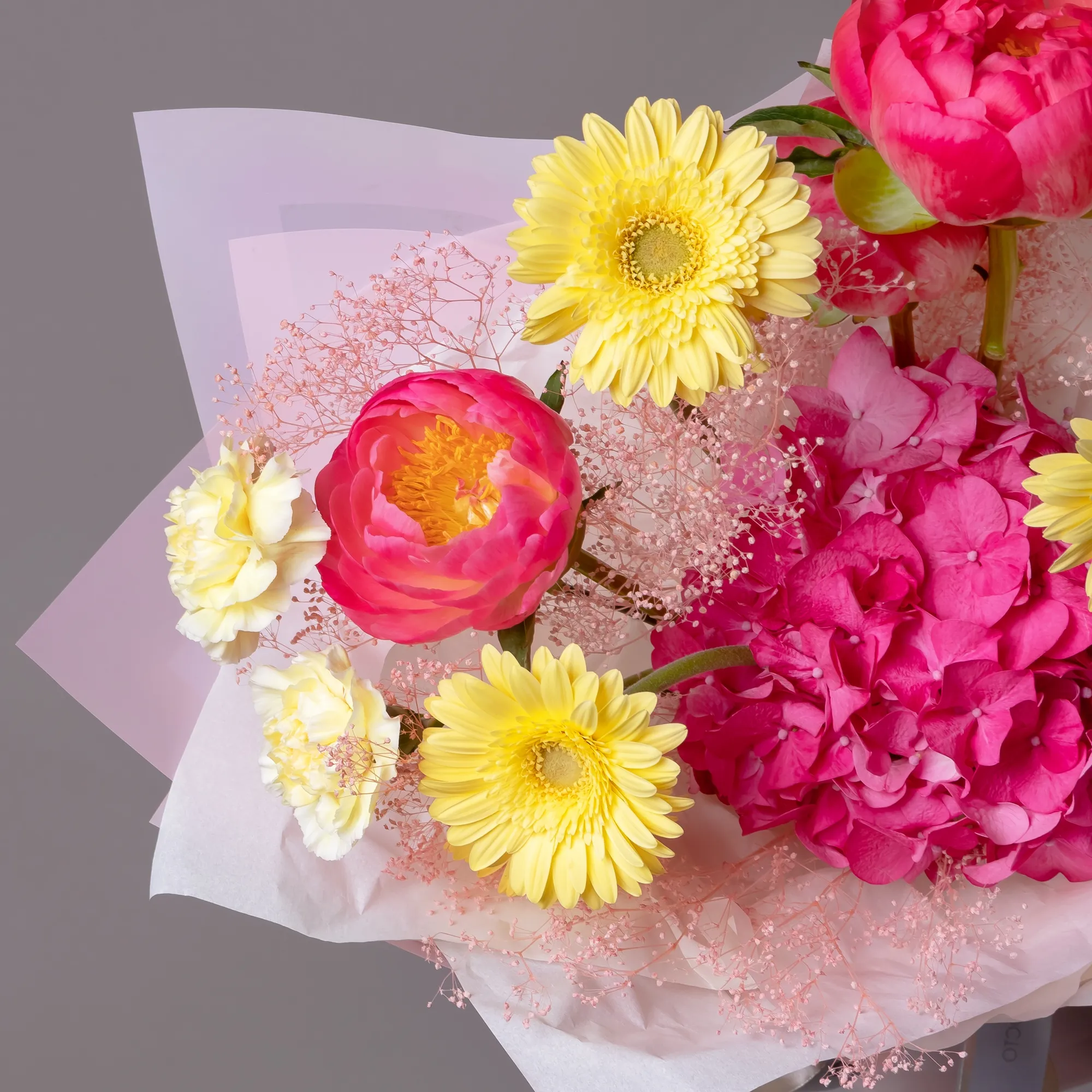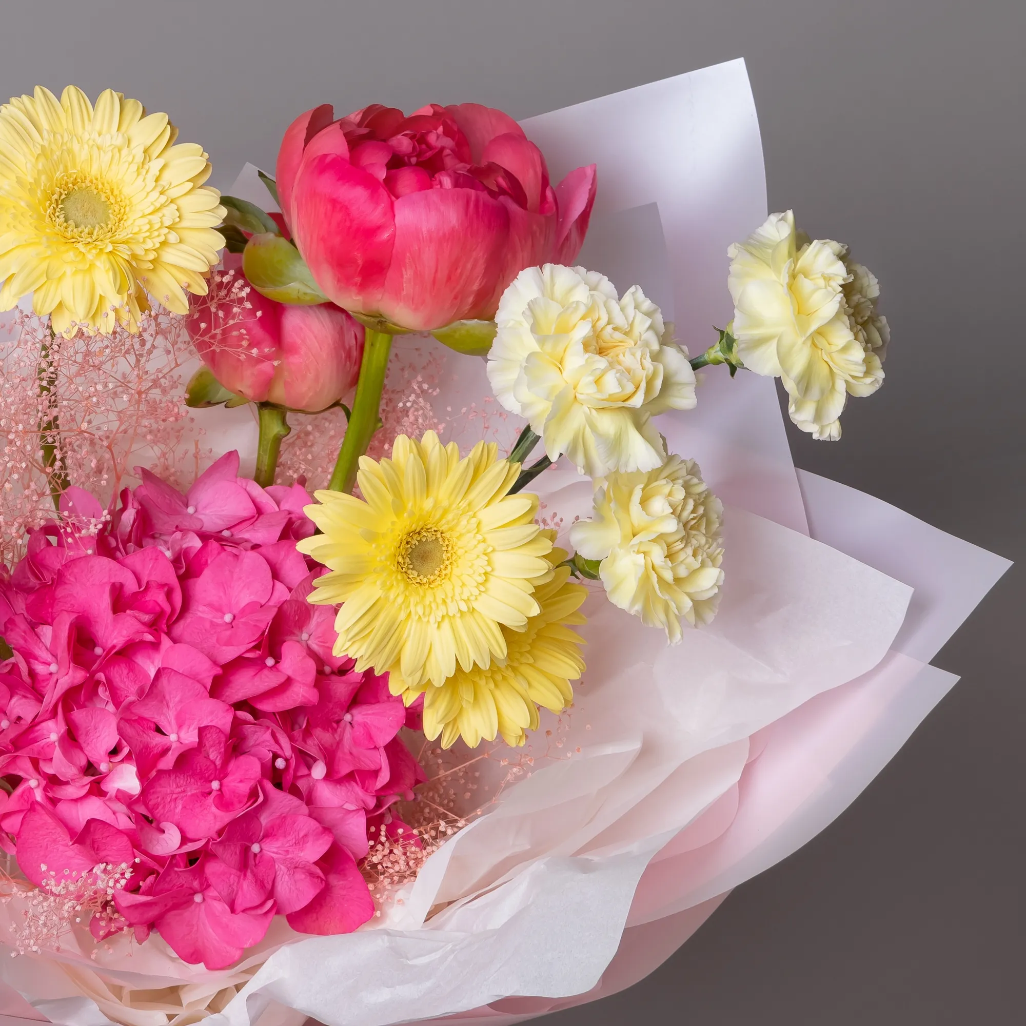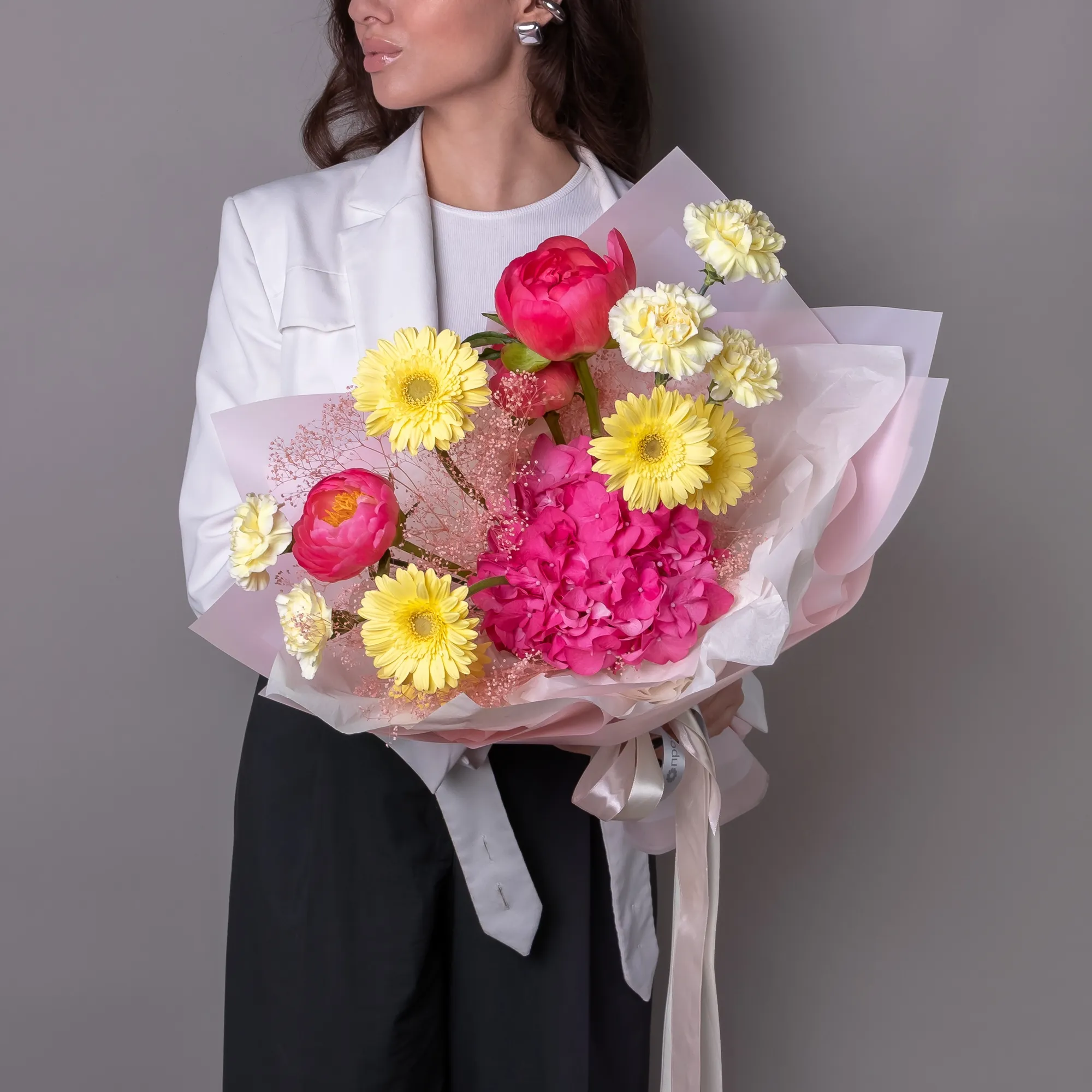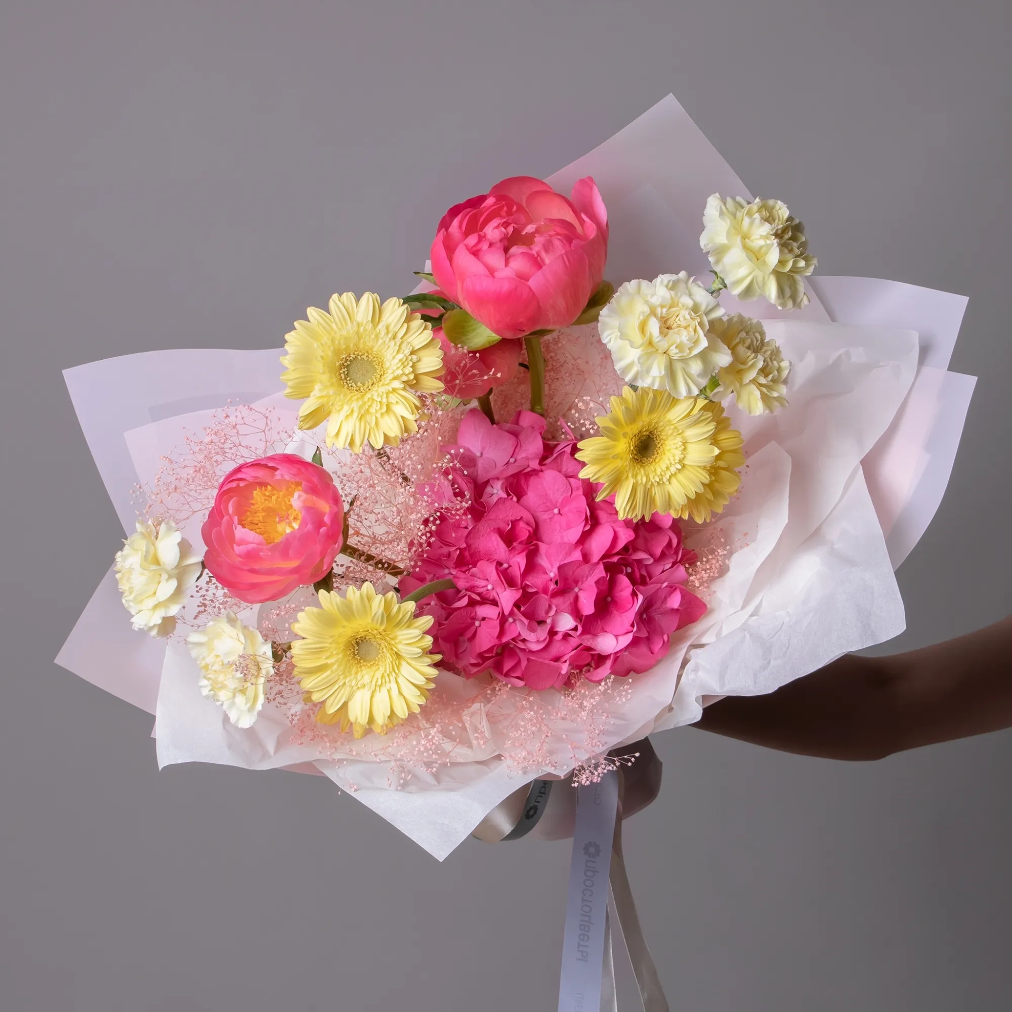 В составе букета "Летняя Фантазия" пион "Коралл шарм", розовая гипсофила, розовая гидрангия, бежевая гвоздика, желтая гермини. Этот букет идеально подойдёт для следующих случаев: *Свадебное торжество или букет невесты - нежная пастельная гамма с акцентом кораллового цвета создает романтичную атмосферу, пышные пионы и гортензии в сочетании с воздушной гипсофилой создают объемную, роскошную композицию, которая идеально подойдет для свадебного торжества или как подарок молодоженам. *Поздравление с повышением или значимым достижением - изысканная композиция с преобладанием благородных оттенков символизирует успех и признание, бежевые и розовые тона создают впечатление элегантности и утонченности, а коралловые акценты добавляют динамичности и современности, что делает букет подходящим для поздравления с профессиональными достижениями. Закажите букет с доставкой или заберите самовывозом. И помните, что цветы - это просто.