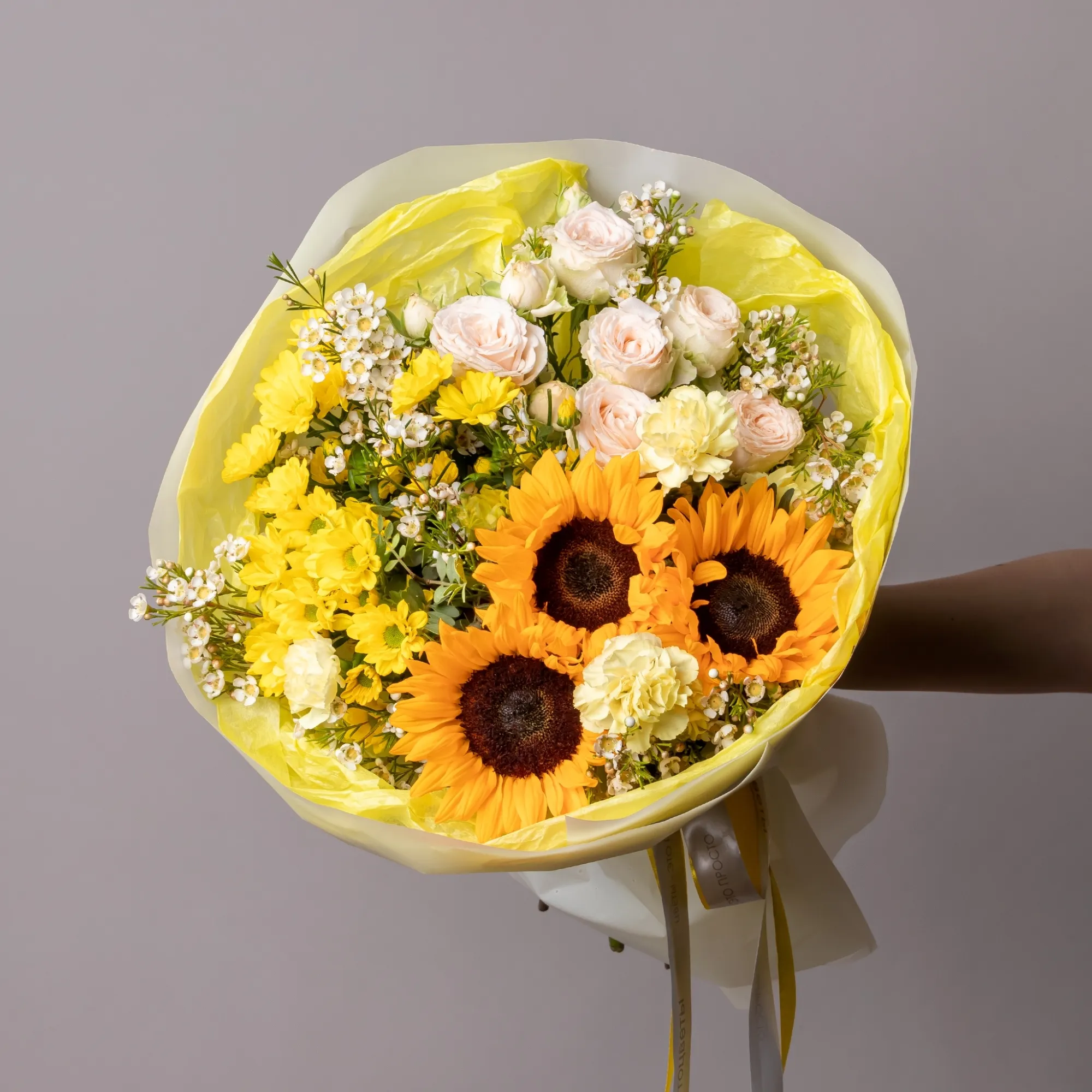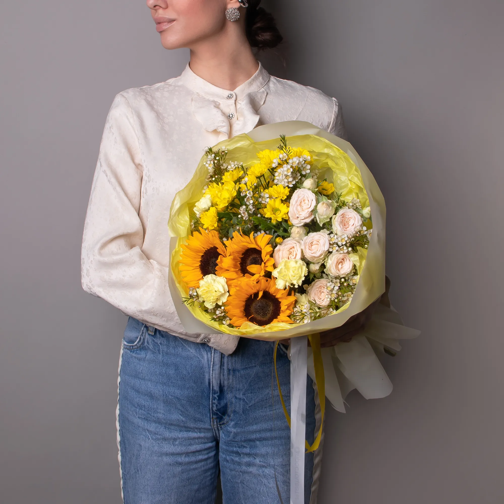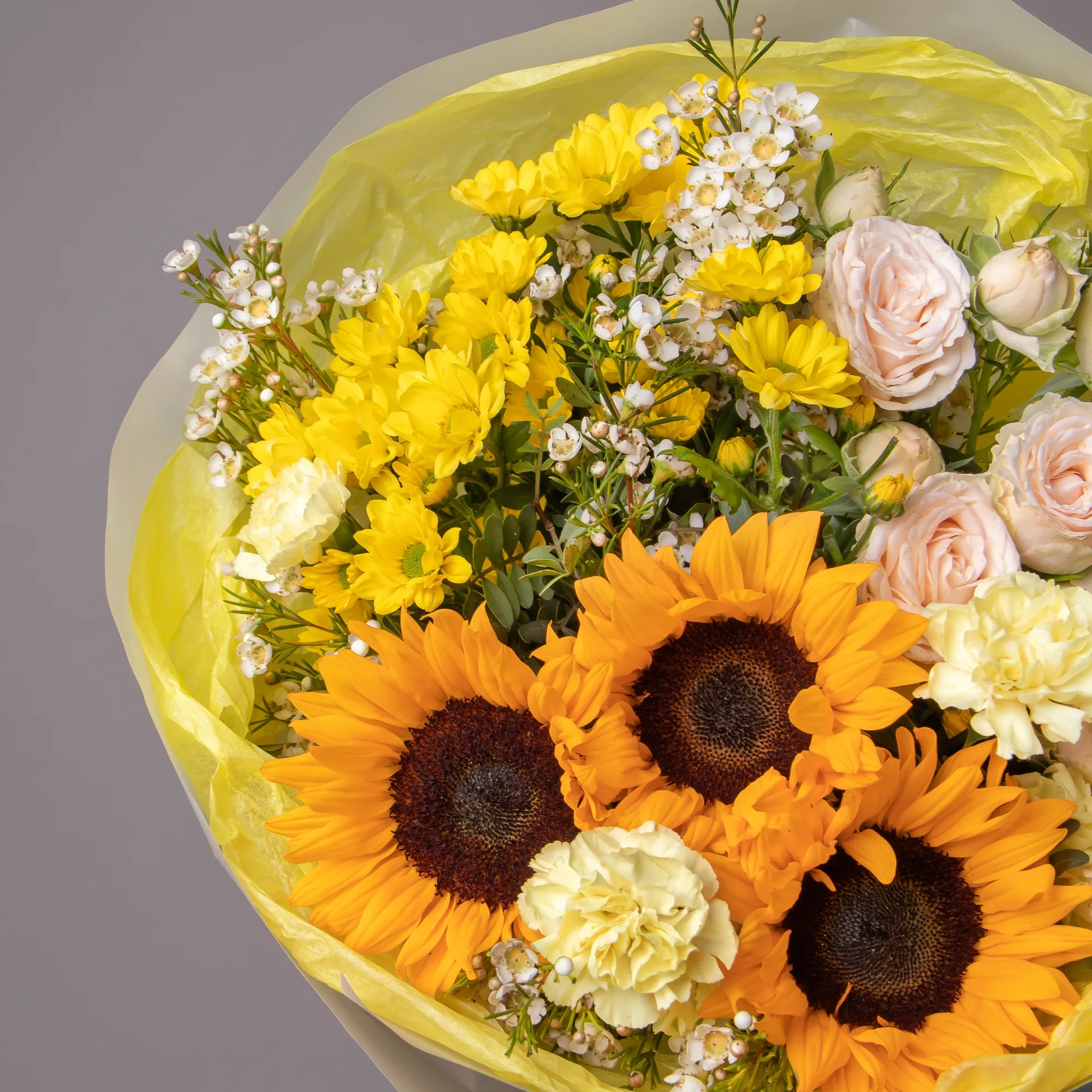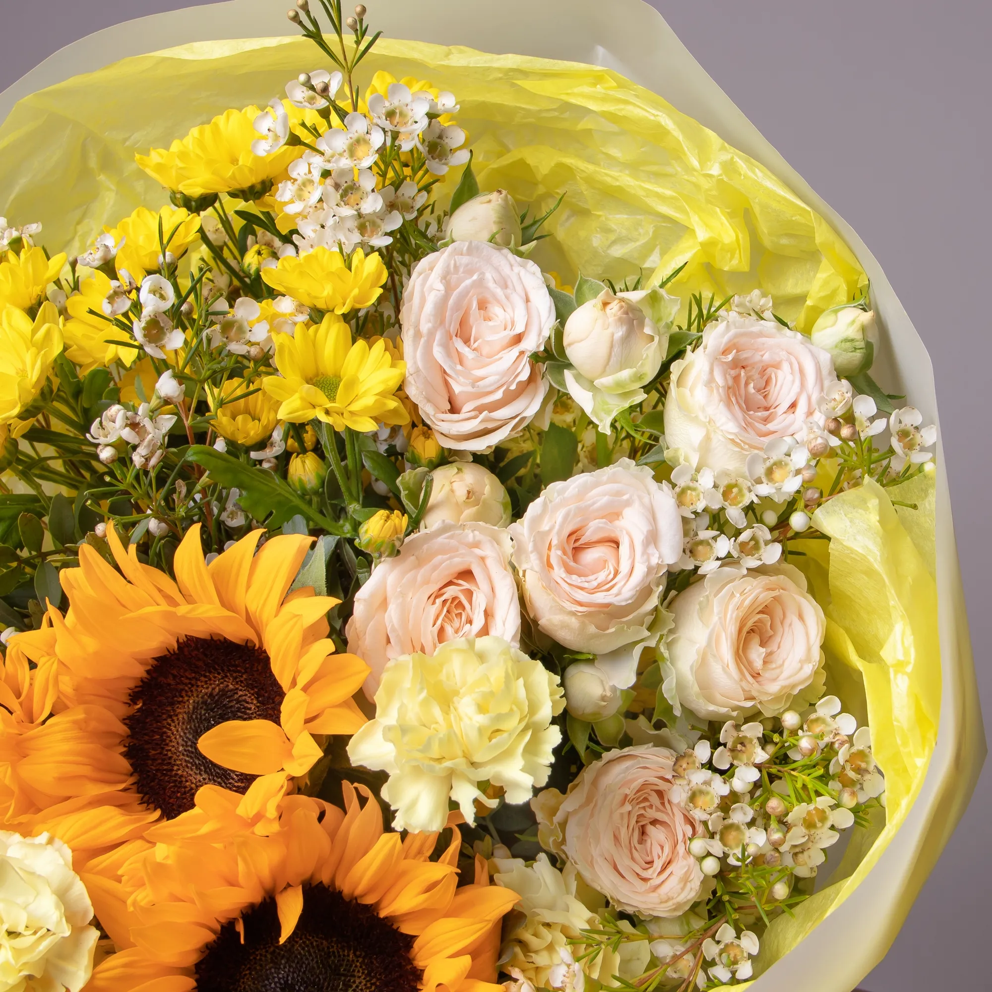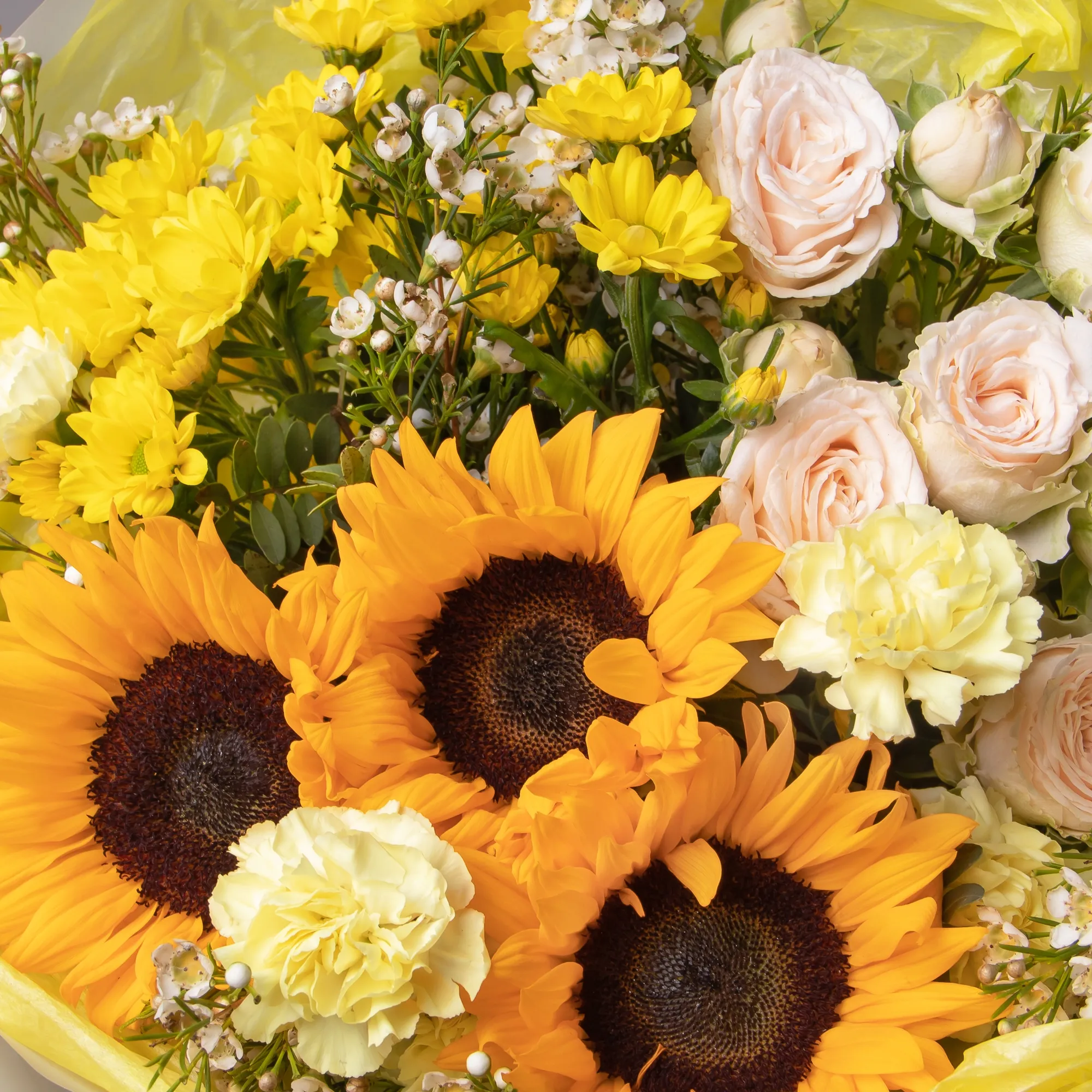 В составе букета "Лето" оранжевый гелиантус, желтая хризантема, кустовая роза "Софи", желтая кустовая гвоздика, белый хамелациум, дополнен листьями фисташки. Этот букет подходит для *День рождения - яркий, солнечный букет поднимет настроение и создаст летнее настроение, а также для поздравления с успехом - энергичная композиция в теплых тонах идеально подойдет для награждения или признания достижений Закажите букет с доставкой или заберите самовывозом. И помните, что цветы - это просто.