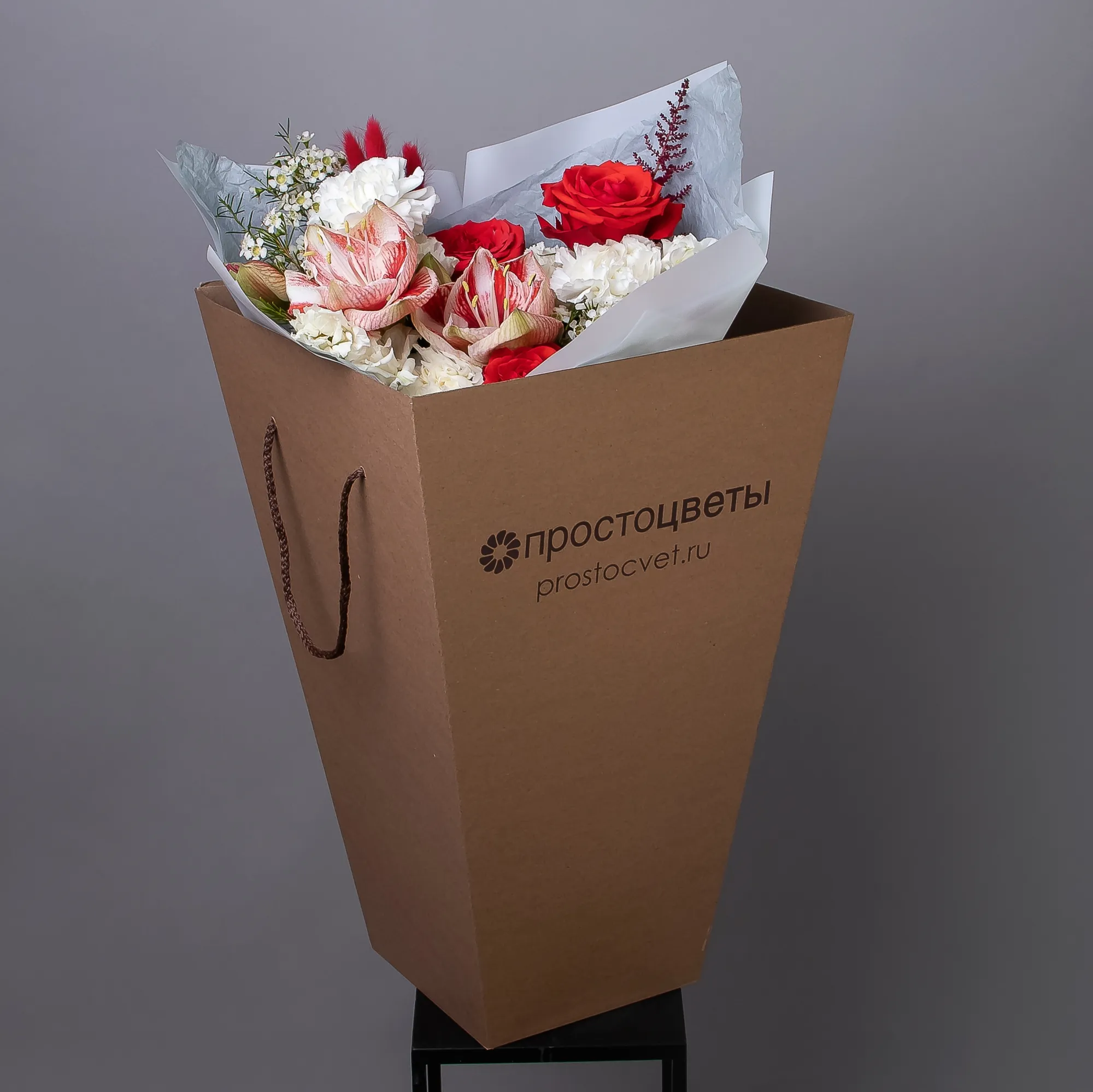 Гвоздика-3, Роза-3, Амариллис-1, Эустома-2, Листья фисташки-3