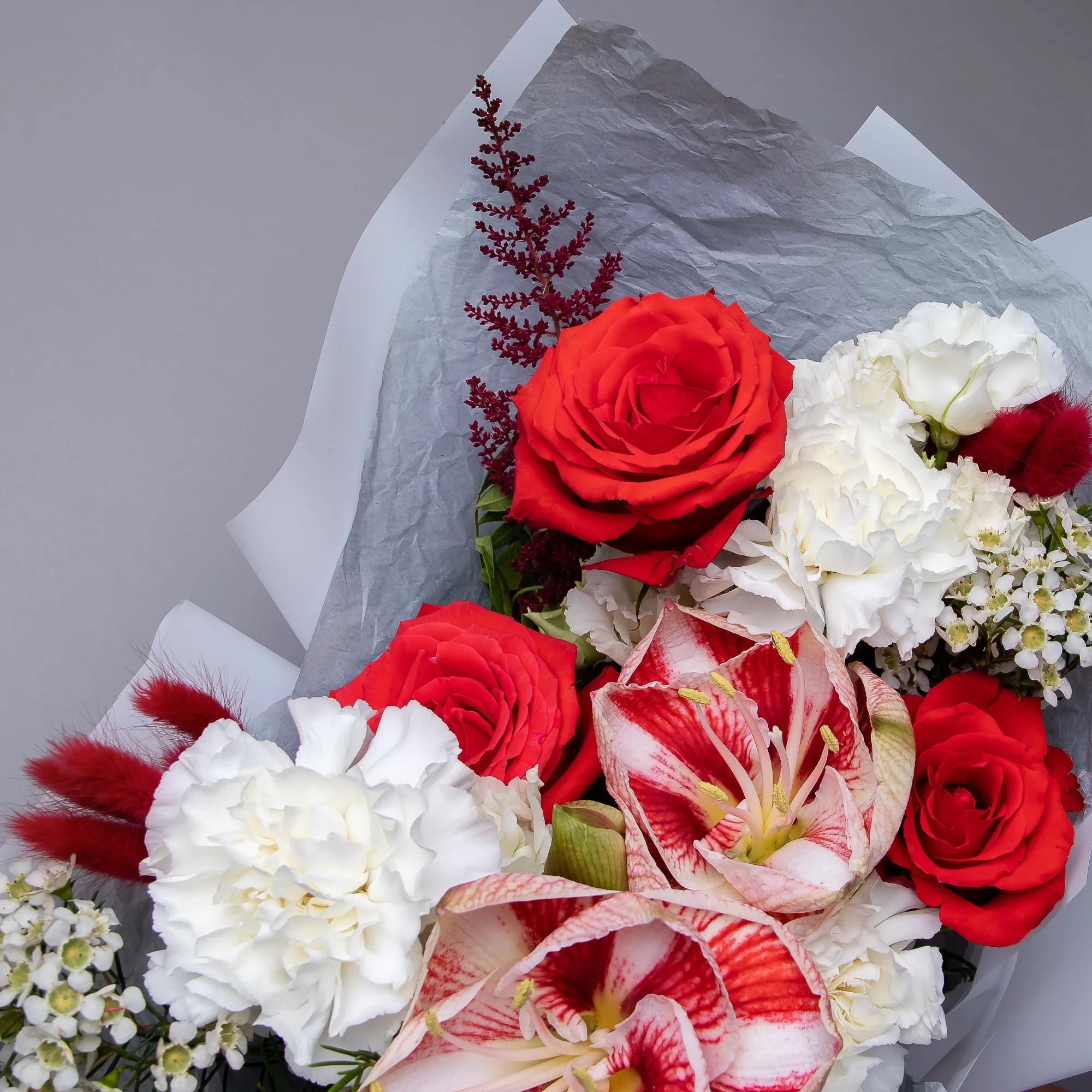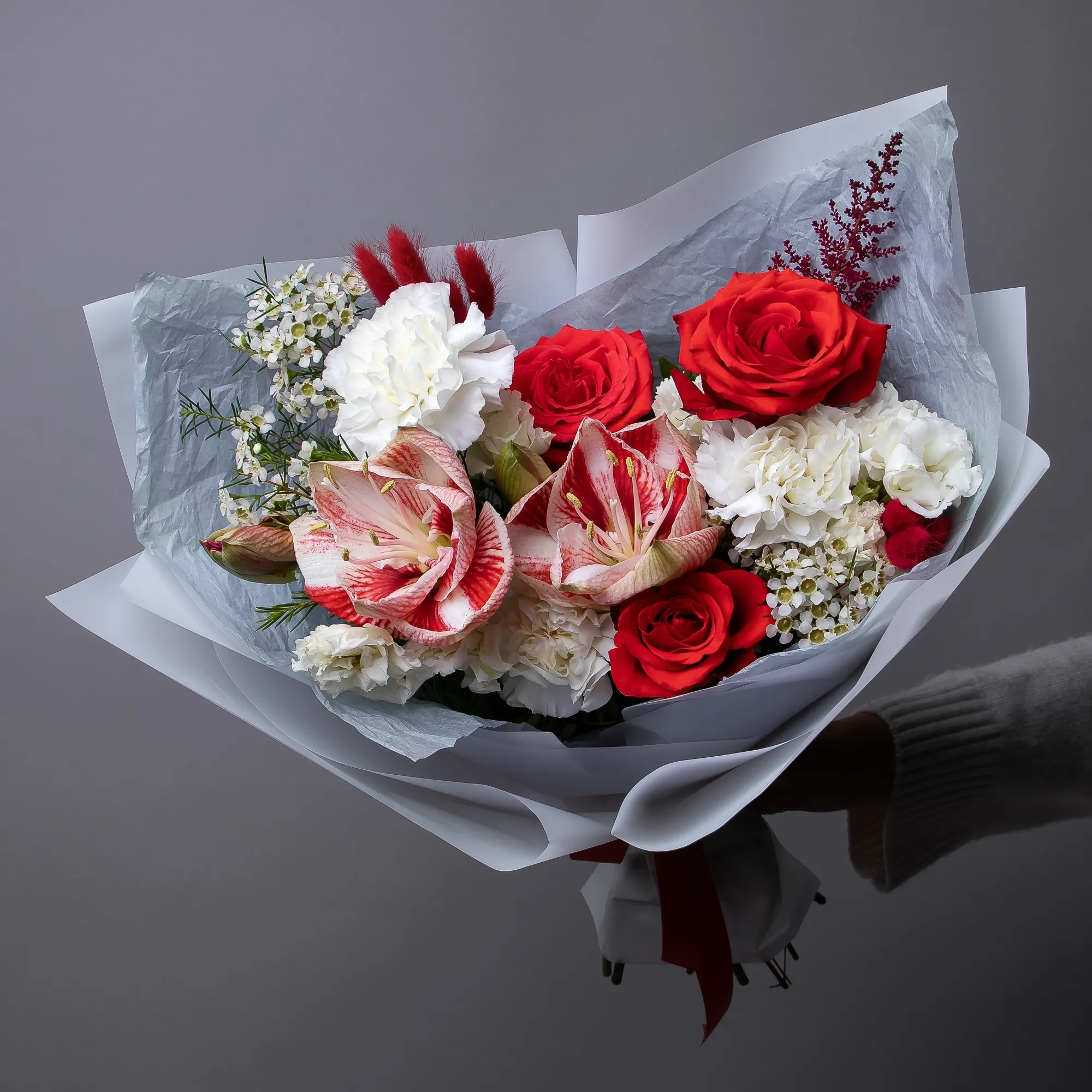 В составе эксцентричного букета "Лёд и Пламя S" амариллис, яркая красная роза сорта "Нина", белая гвоздика, белый лизиантус, хамелациум, астильба и красный лагурус.