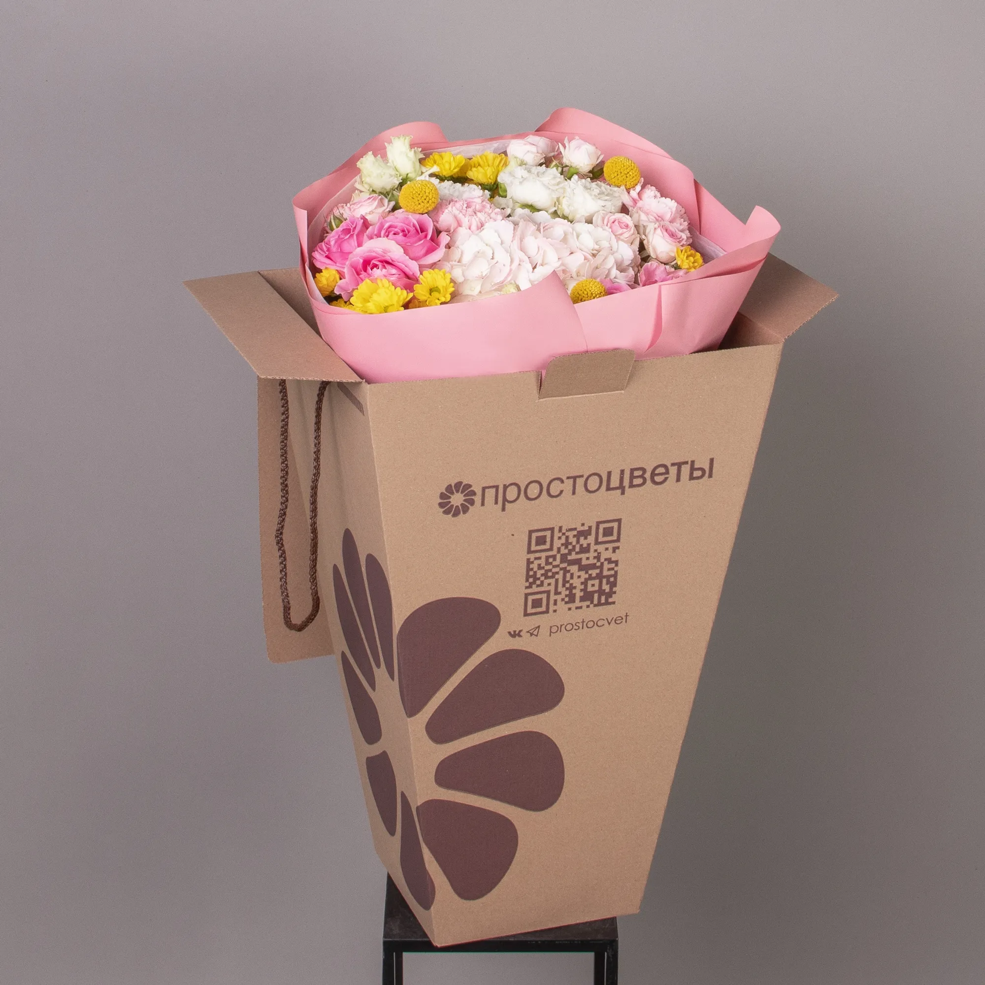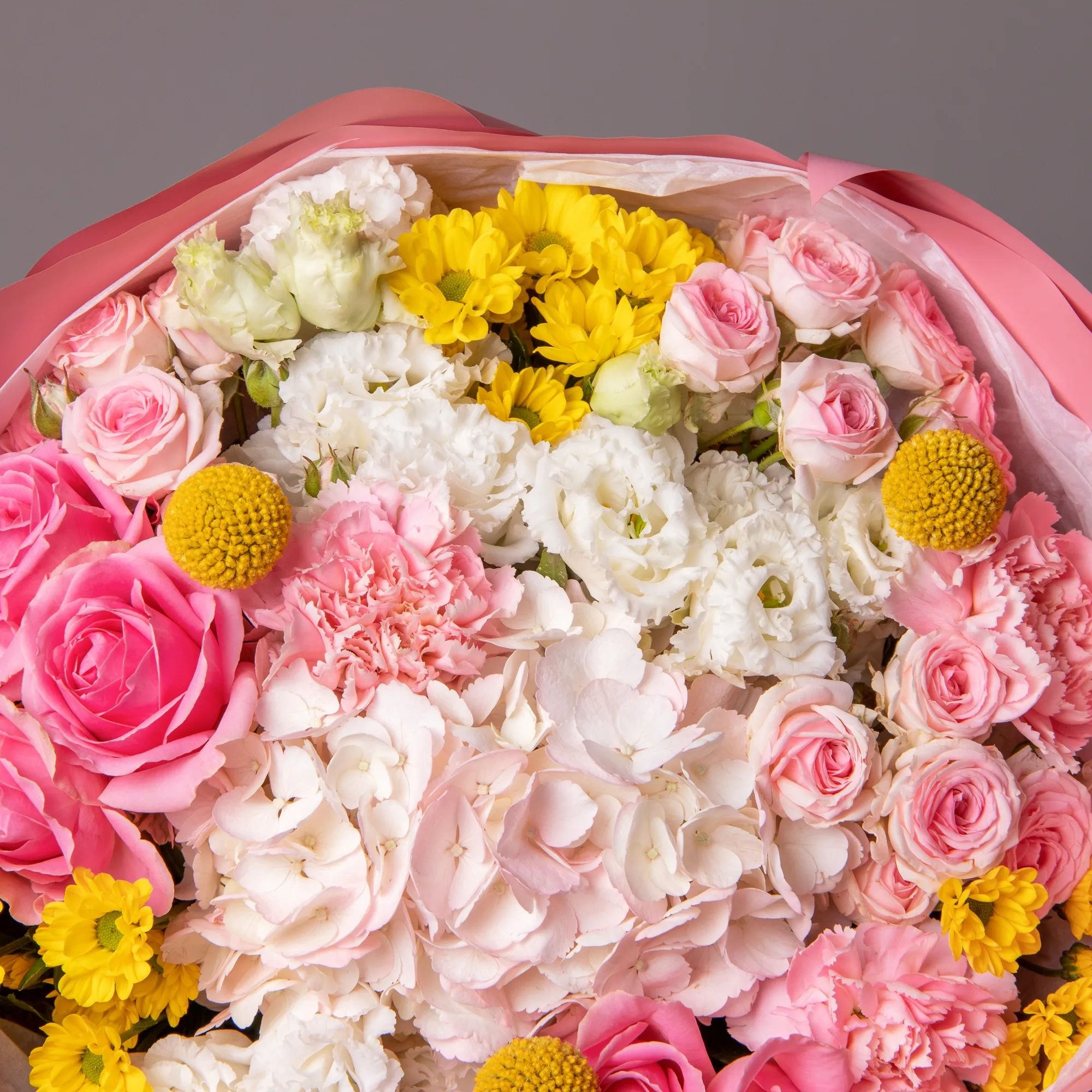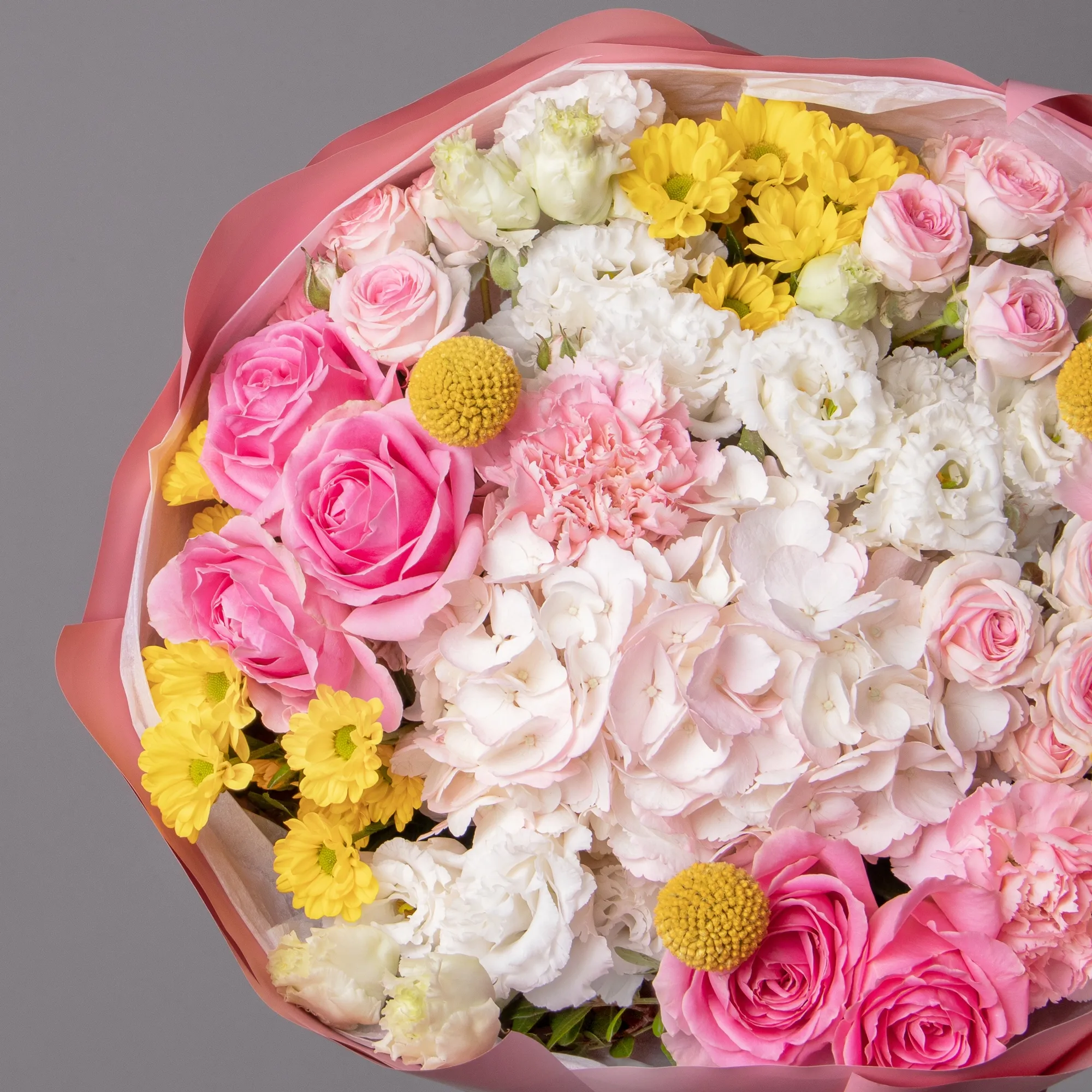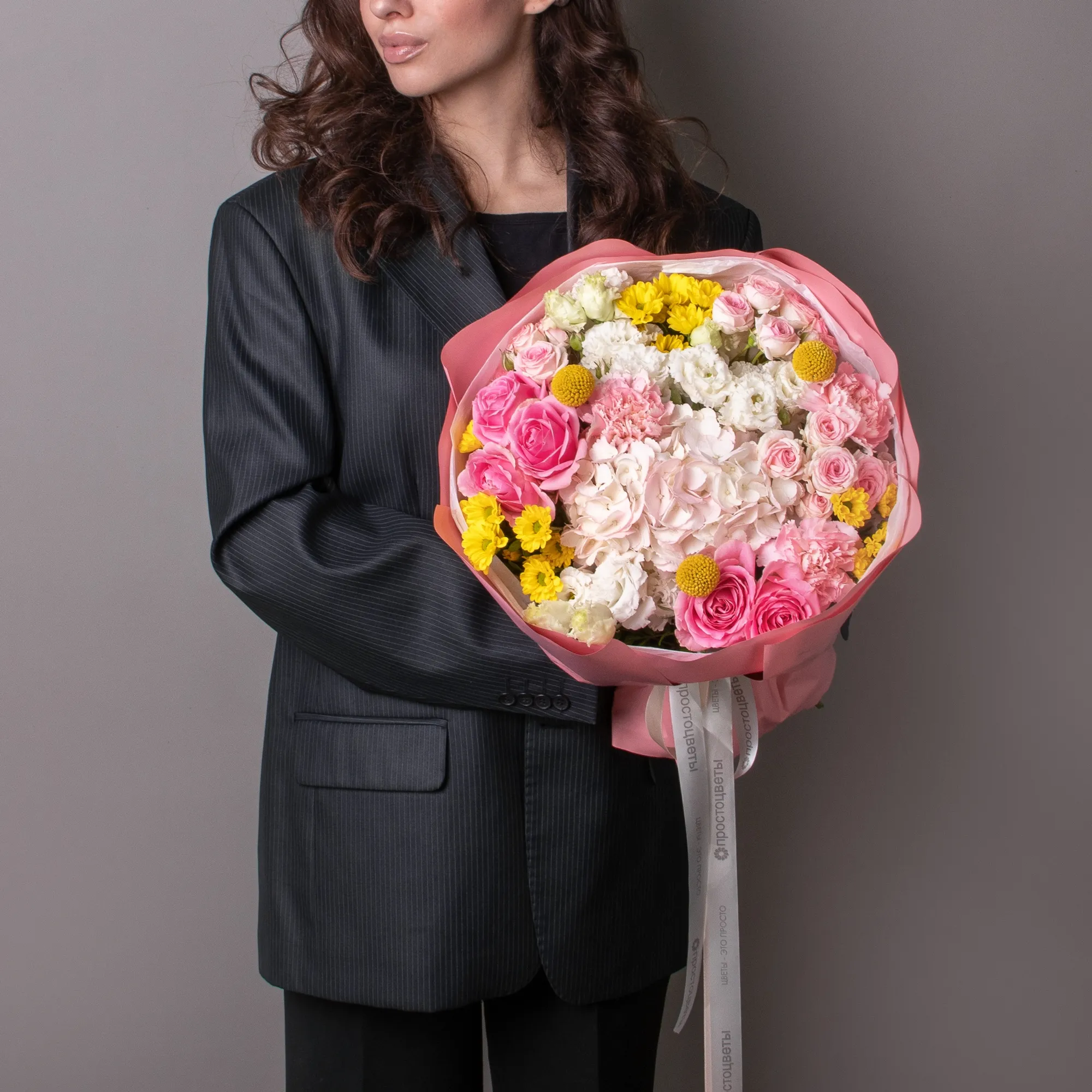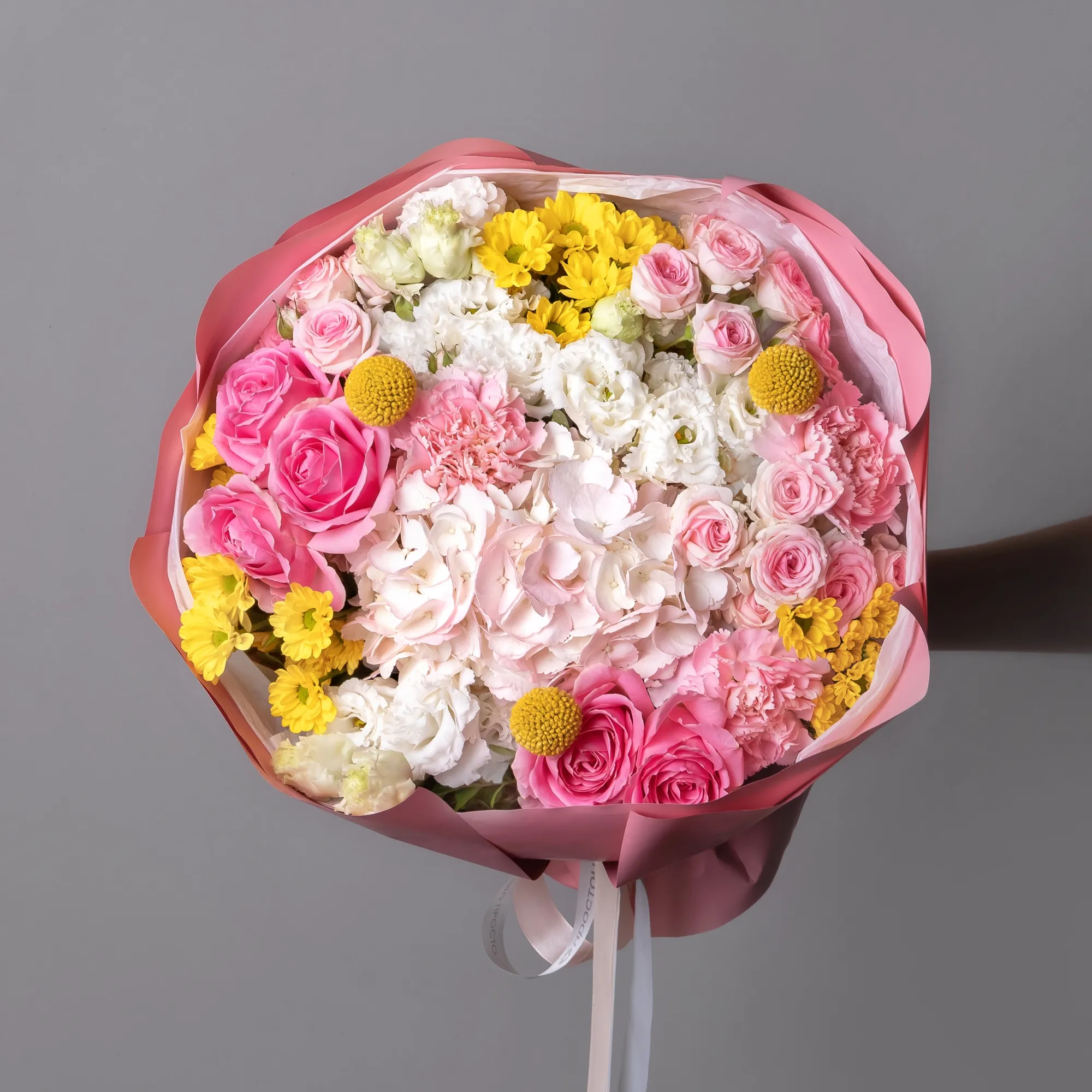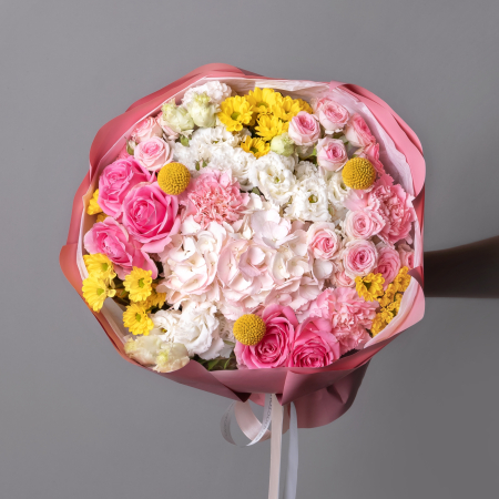 В составе букета "Магия" кустовая роза "Динара", жёлтая краспедия, роза "Вэм", жёлтая хризантема, белый лизиантус, светло-розовая гидрангия, розовая гвоздика, дополнен листьями фисташки. Этот букет идеально подойдёт для следующих случаев. *Деловая встреча или презентация - изысканная композиция с гармоничным сочетанием розовых и желтых оттенков создает профессиональную атмосферу, кустовые розы и гвоздики символизируют уважение и признание, а желтые акценты добавляют энергии и позитива, что делает букет отличным подарком для бизнес-партнеров или важных переговоров.*Поздравление с повышением или карьерным успехом - насыщенная палитра цветов символизирует достижения и успех, сочетание роз, хризантем и гортензий создает впечатление торжественности момента, а разнообразие оттенков и форм подчеркивает многогранность личности получателя, делая букет особенно значимым подарком для профессиональных достижений. Закажите букет с доставкой или заберите самовывозом. И помните, что цветы - это просто.