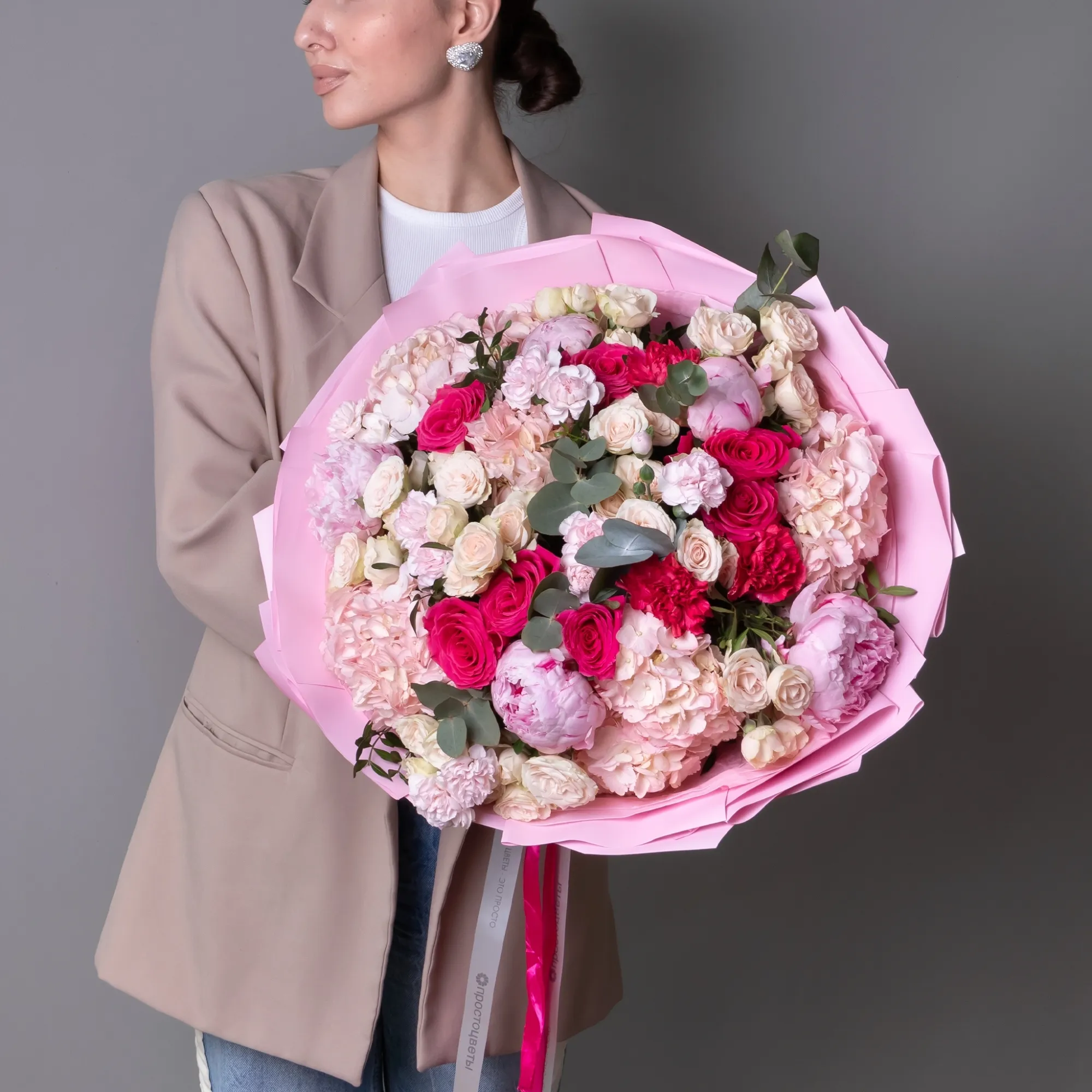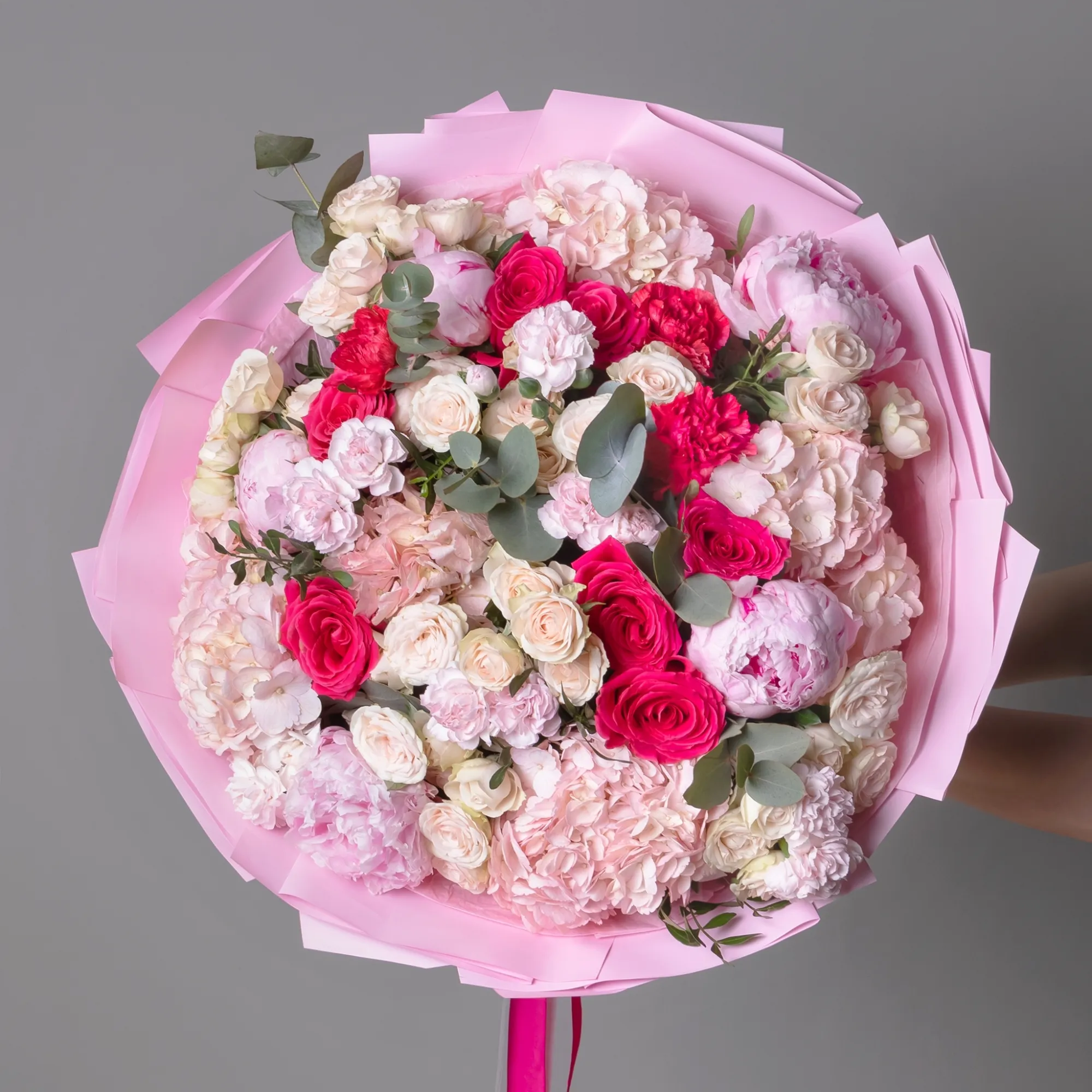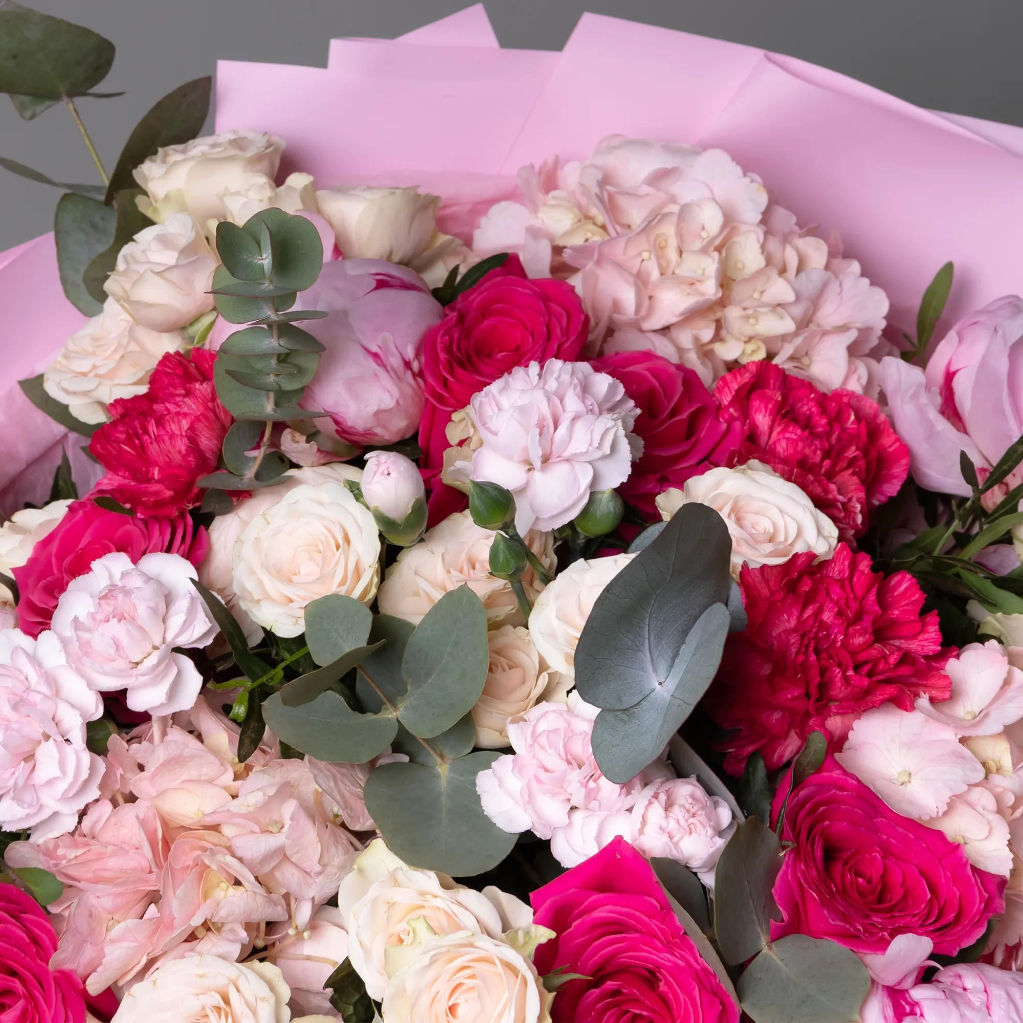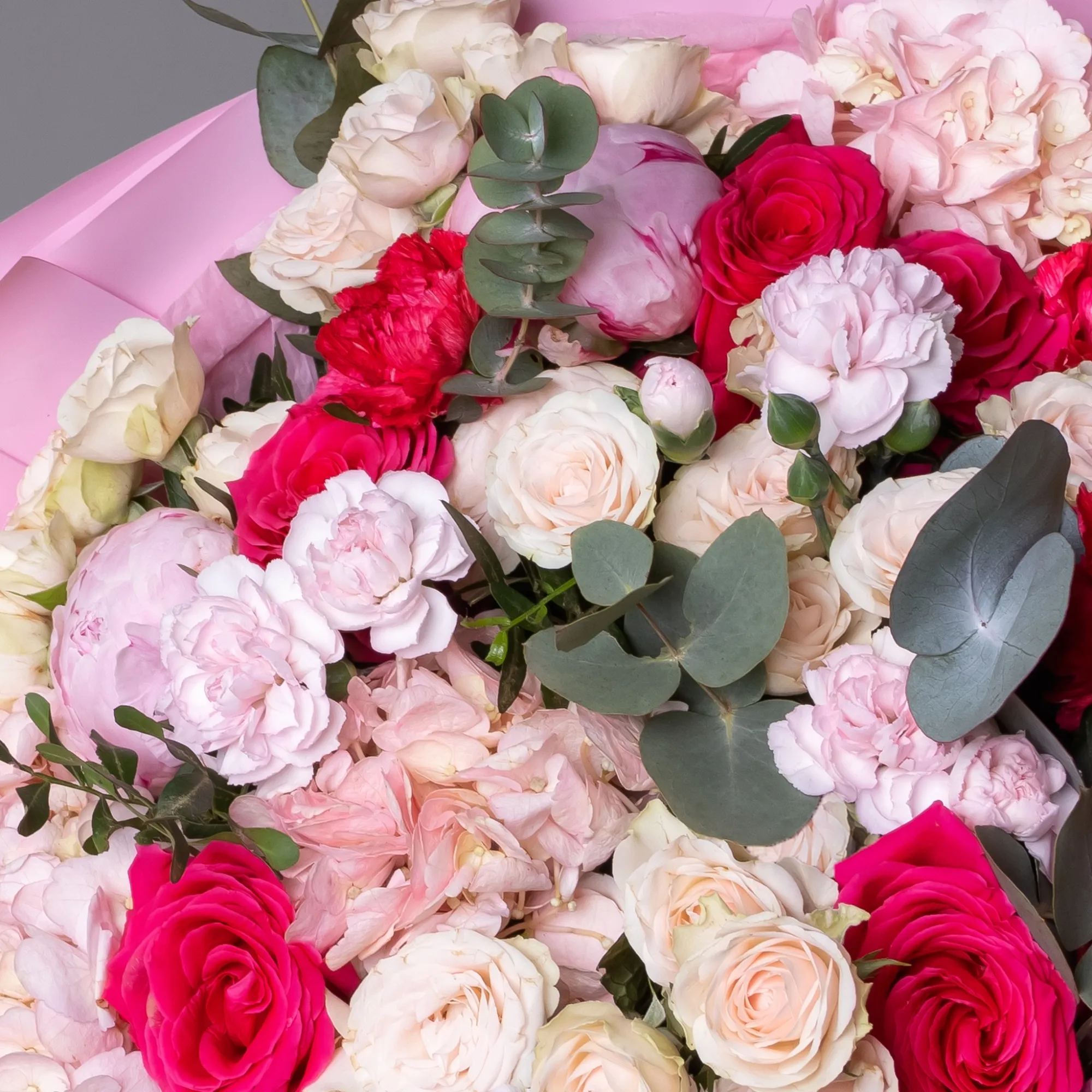 Пион, Гвоздика, Гортензия, Роза, Листья фисташки, Листья эвкалипта