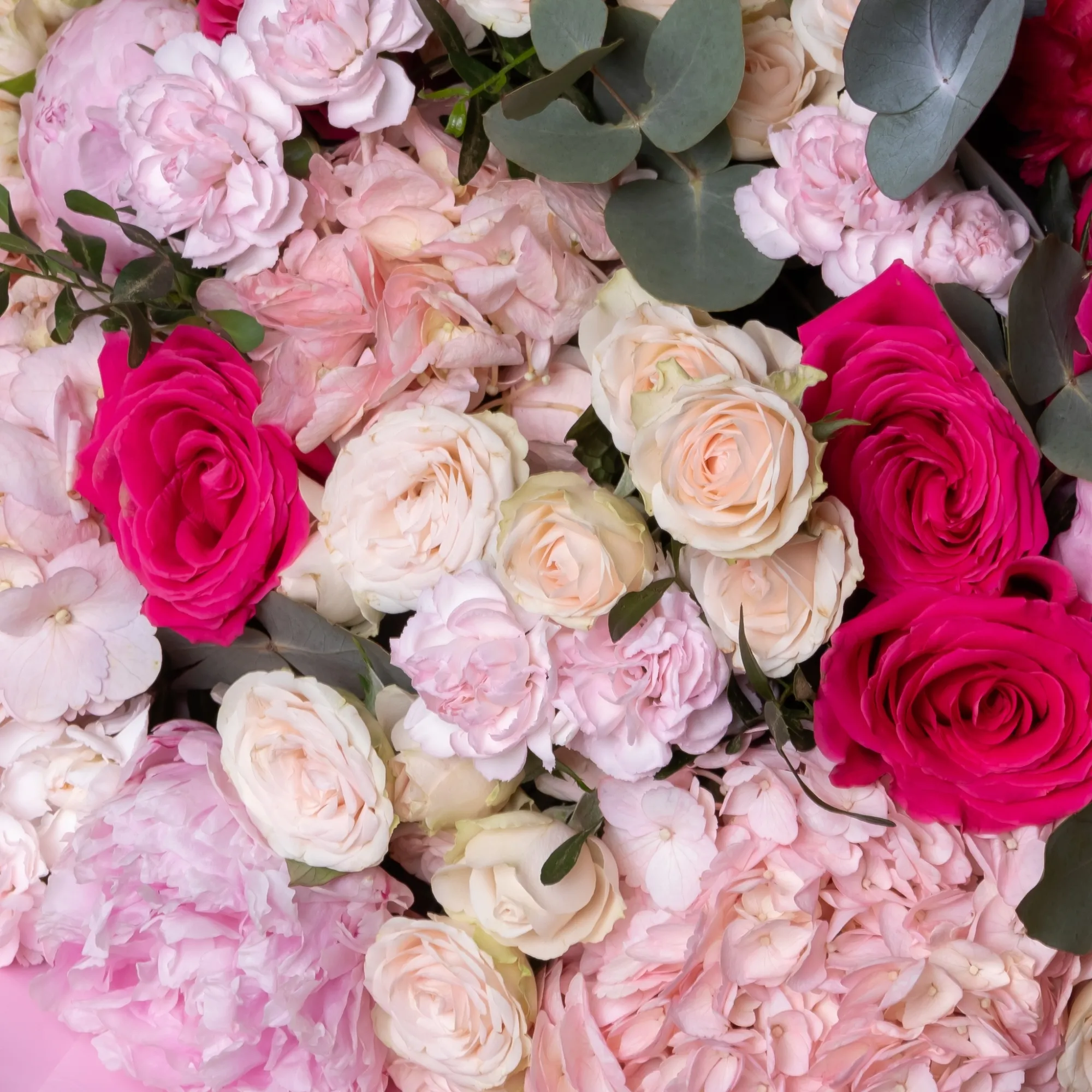 Пион-5, Гвоздика-5, Гортензия-5, Роза-7, Роза кустовая-10, Гвоздика кустовая-7, Листья фисташки-7, Листья эвкалипта-3