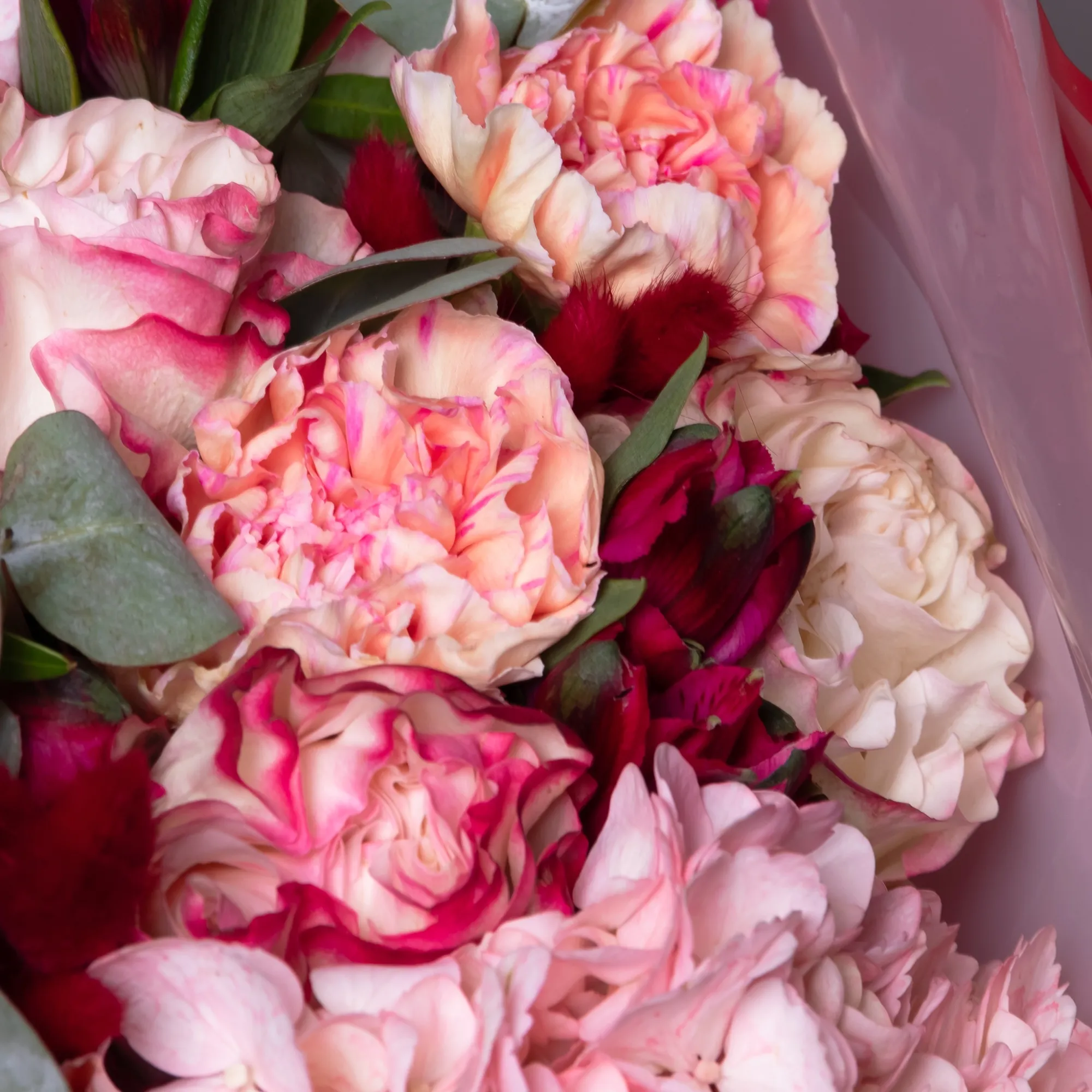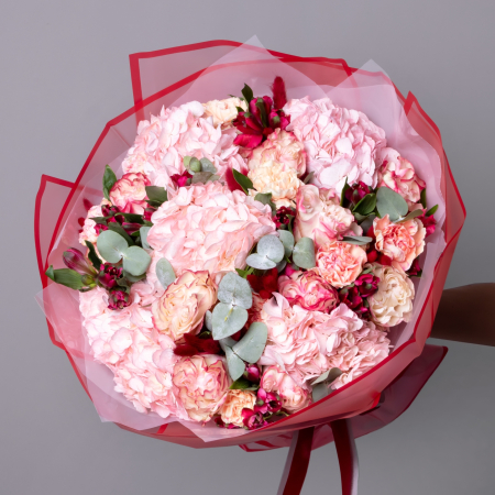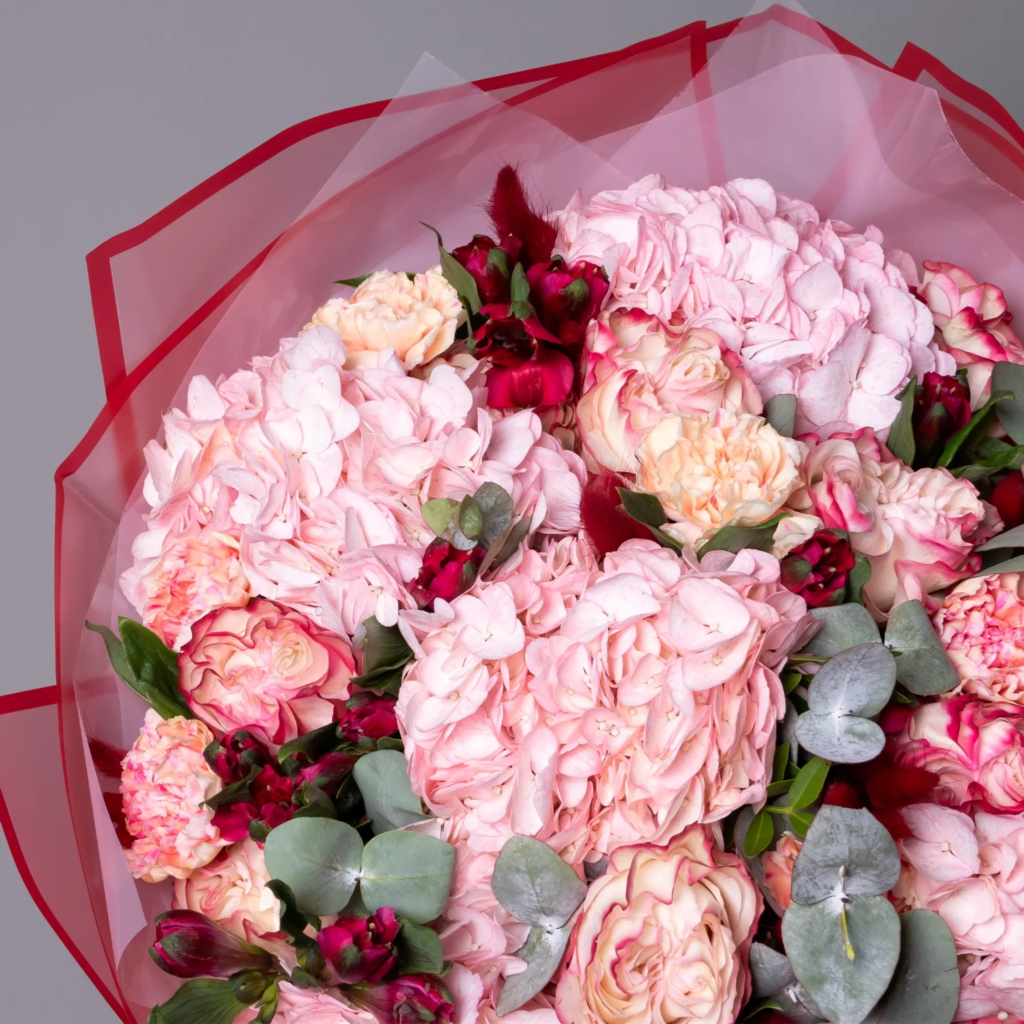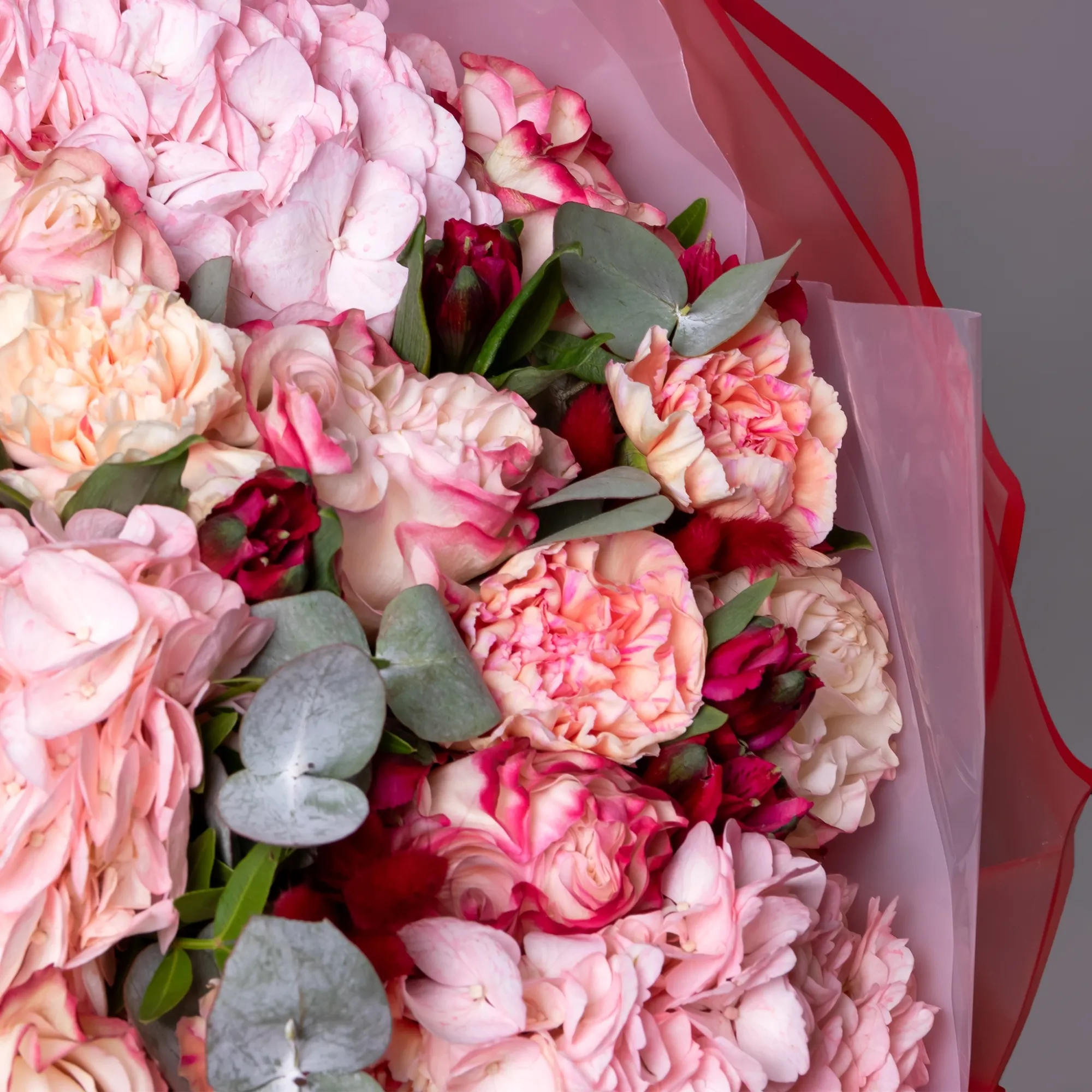Гвоздика, Гортензия, Роза, Альстромерия, Листья фисташки, Листья эвкалипта