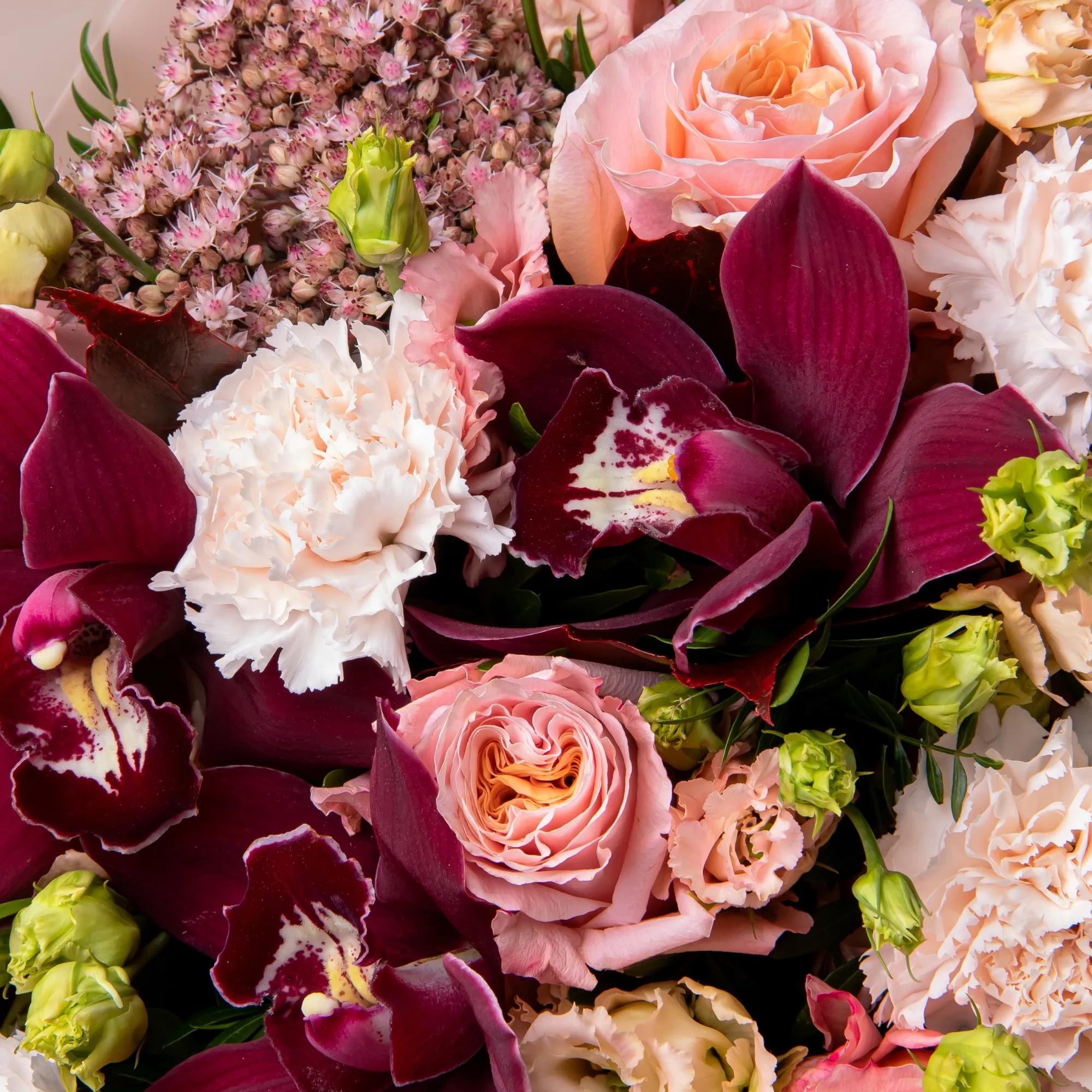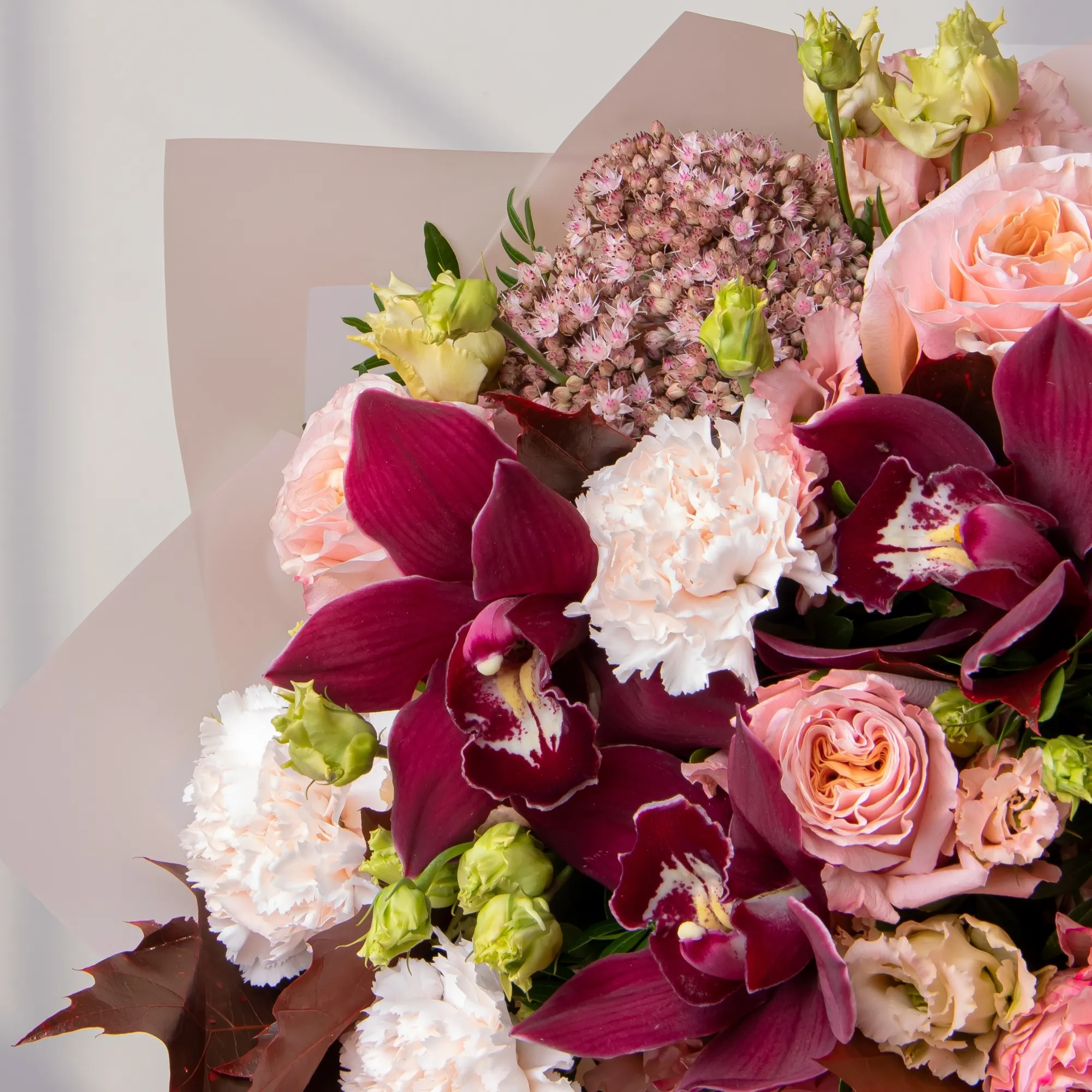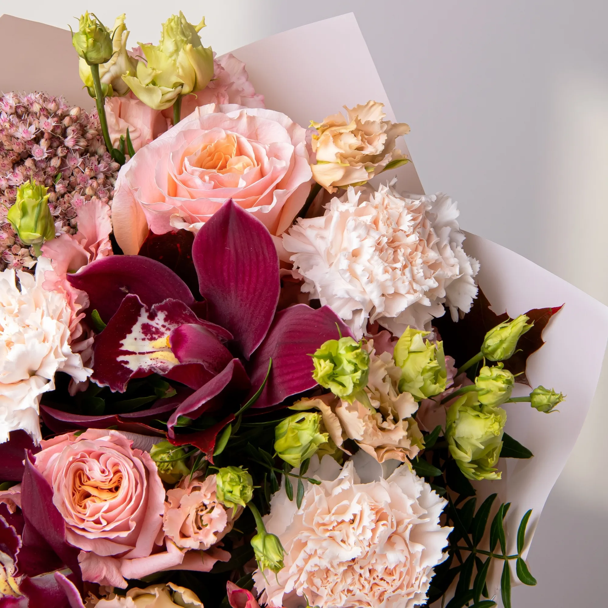 К сожалению, мы не можем гарантировать точную копию букета. Наши цветы могут отличаться от указанных на фотографии, ведь они приезжают к нам из разных уголков мира.