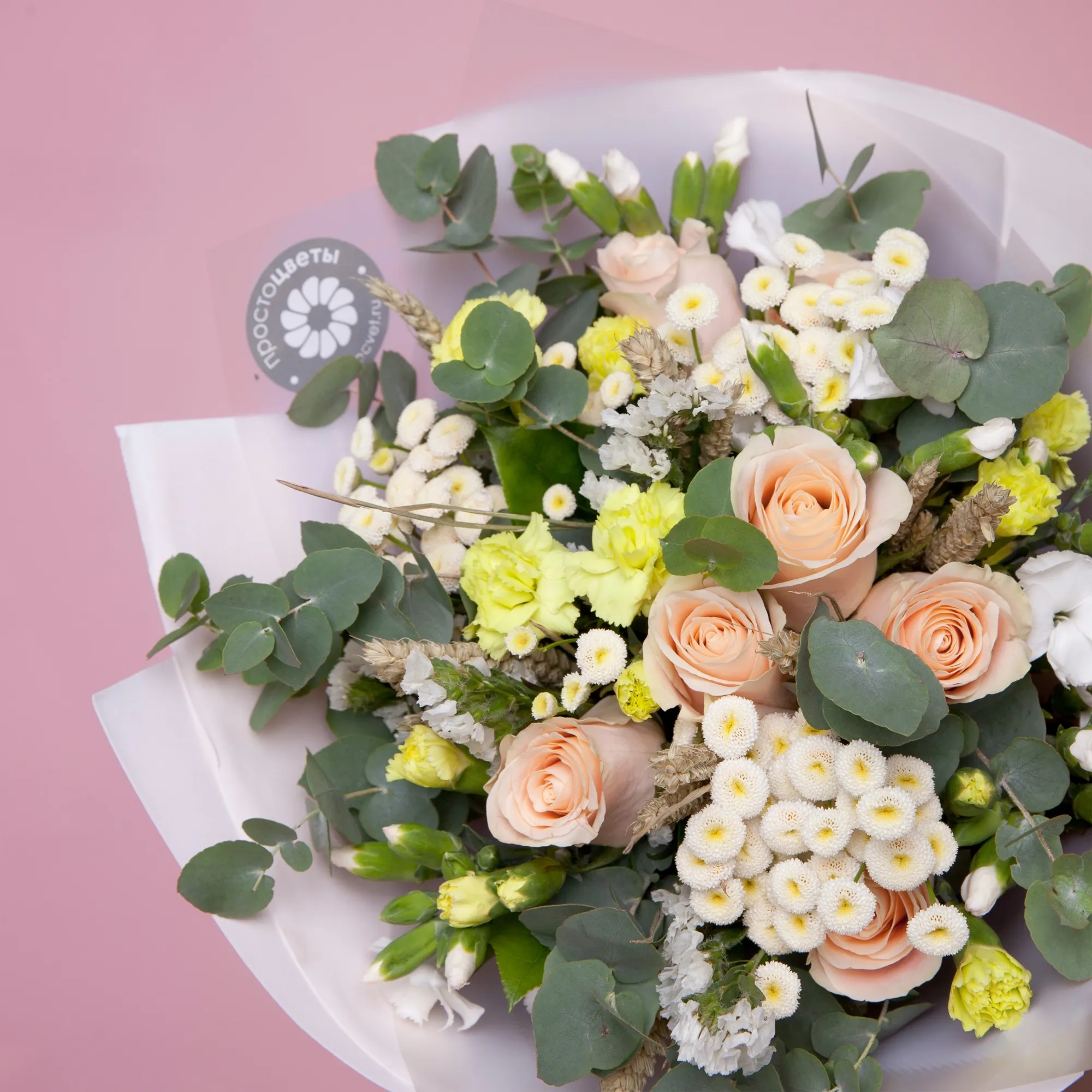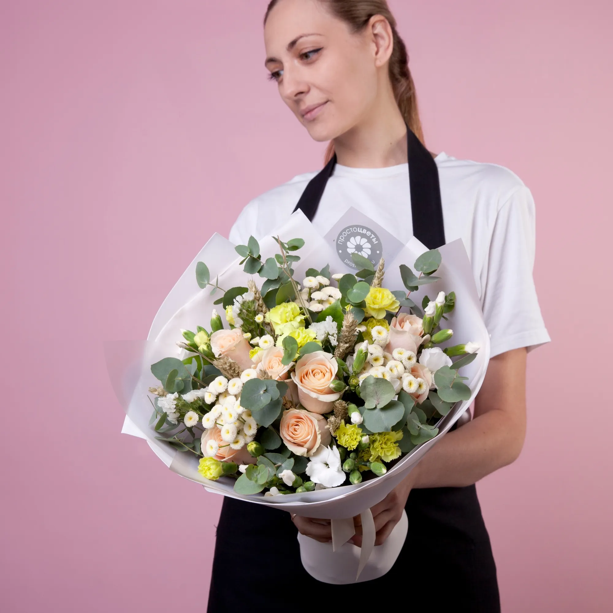 Удивительное сочетание ромашек, персиковых роз и акцентных желтых гвоздик. Оно придает букету нотку загадочности, но в то же время невероятной легкости. «Миф» очарует любую женщину своими нежными оттенками.