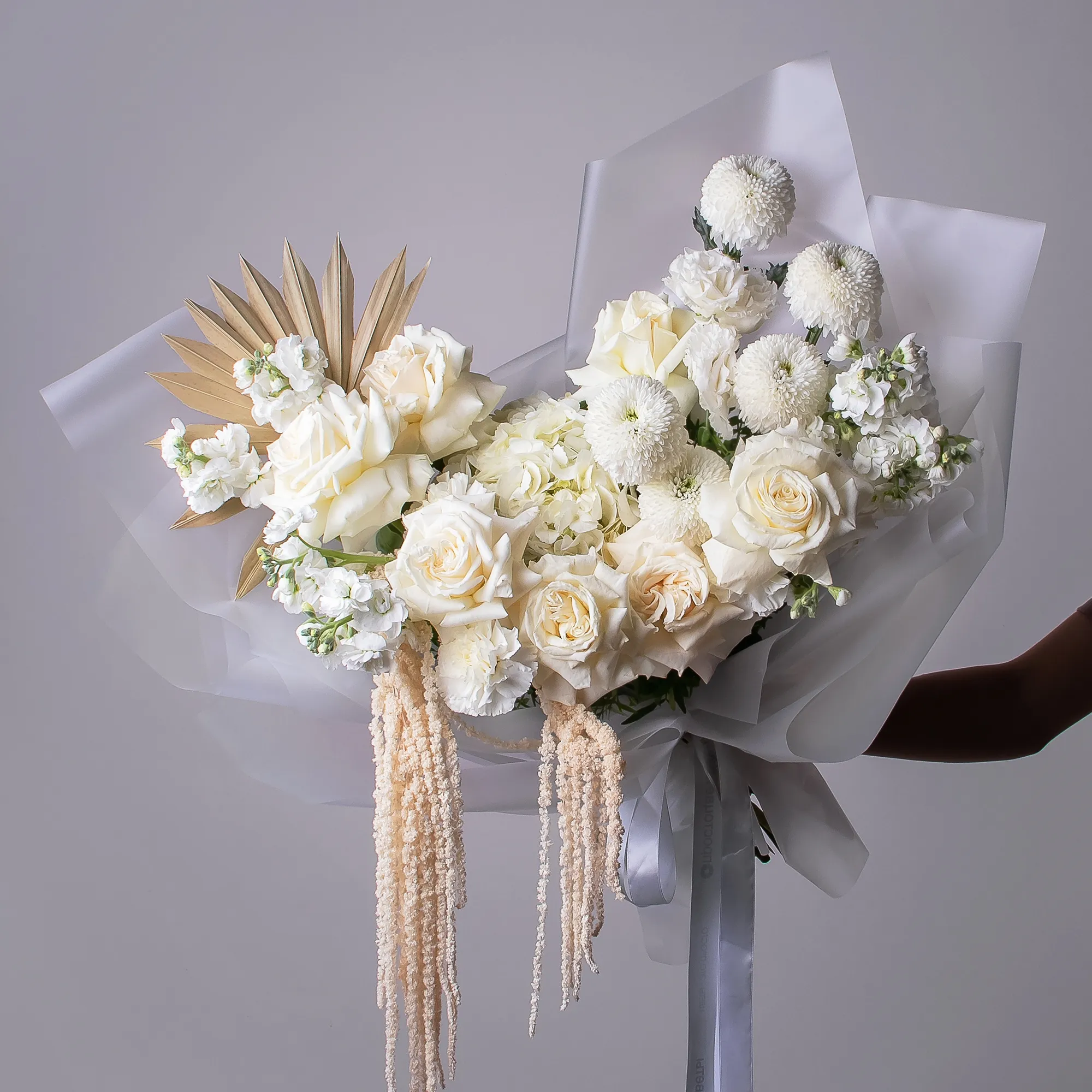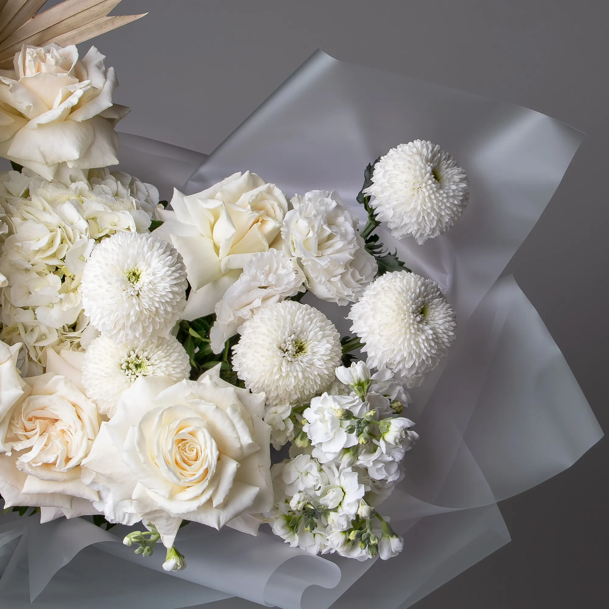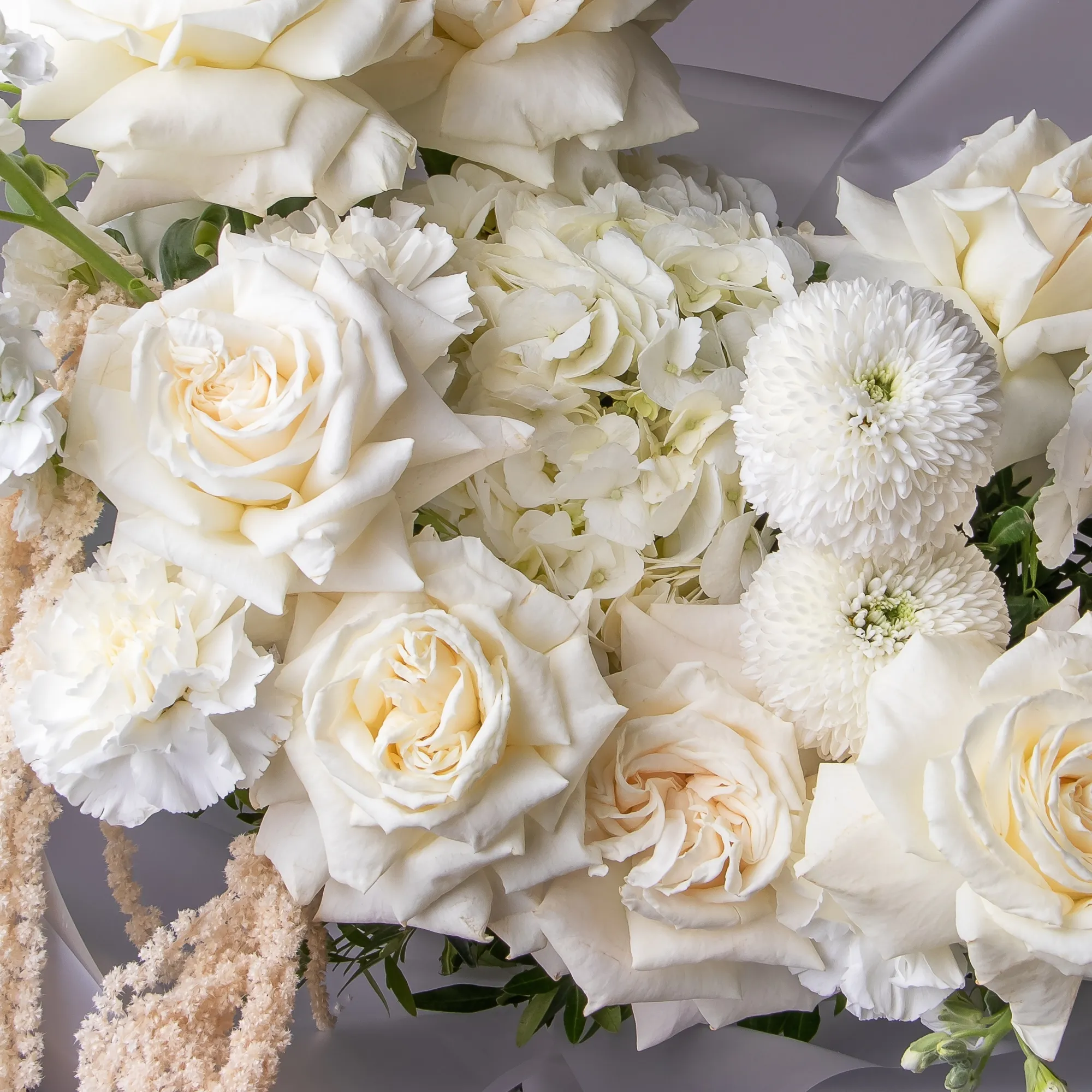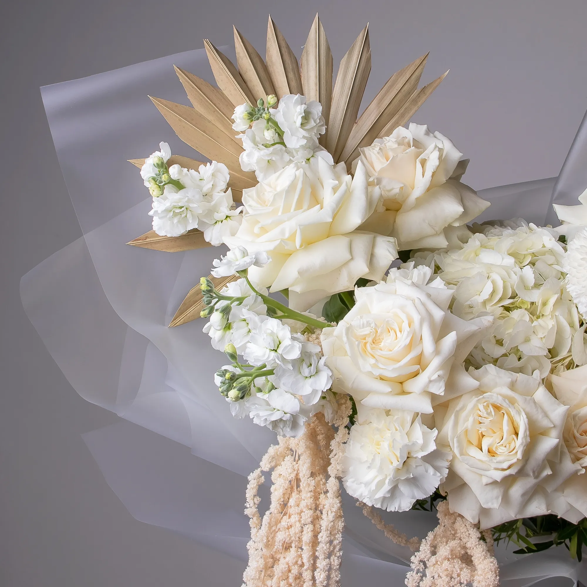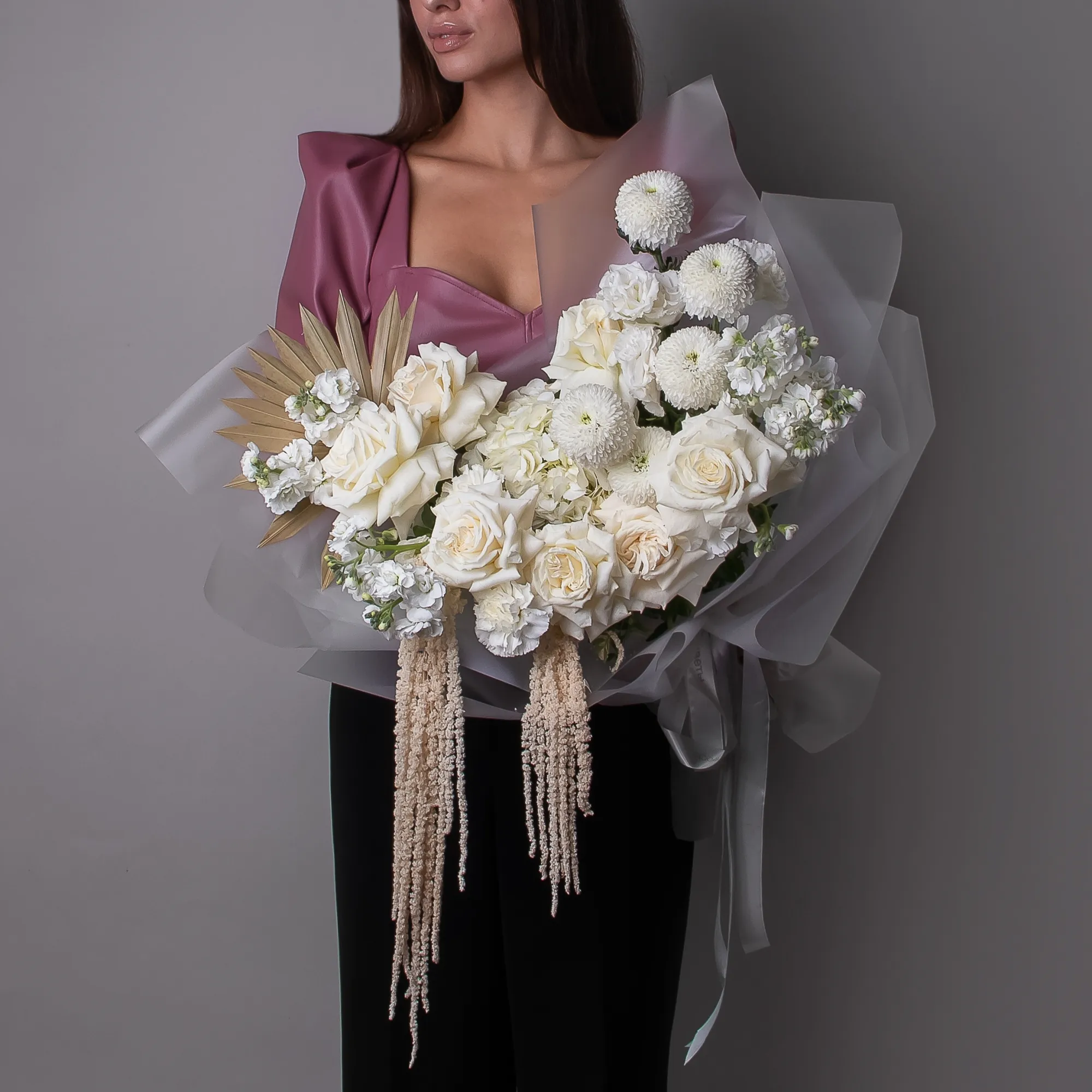Гвоздика-4, Гортензия-1, Роза-7, Хризантема-5, Маттиола-4, Эустома-3, Листья пальм-1, Листья фисташки-10