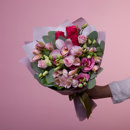 Монохромное сочетание лилово-розовой орхидеи, роз, лизиантуса и альстромерии. Небольшой букетик-комплимент, который можно преподнести на свидании, как напоминание о нежных чувствах.