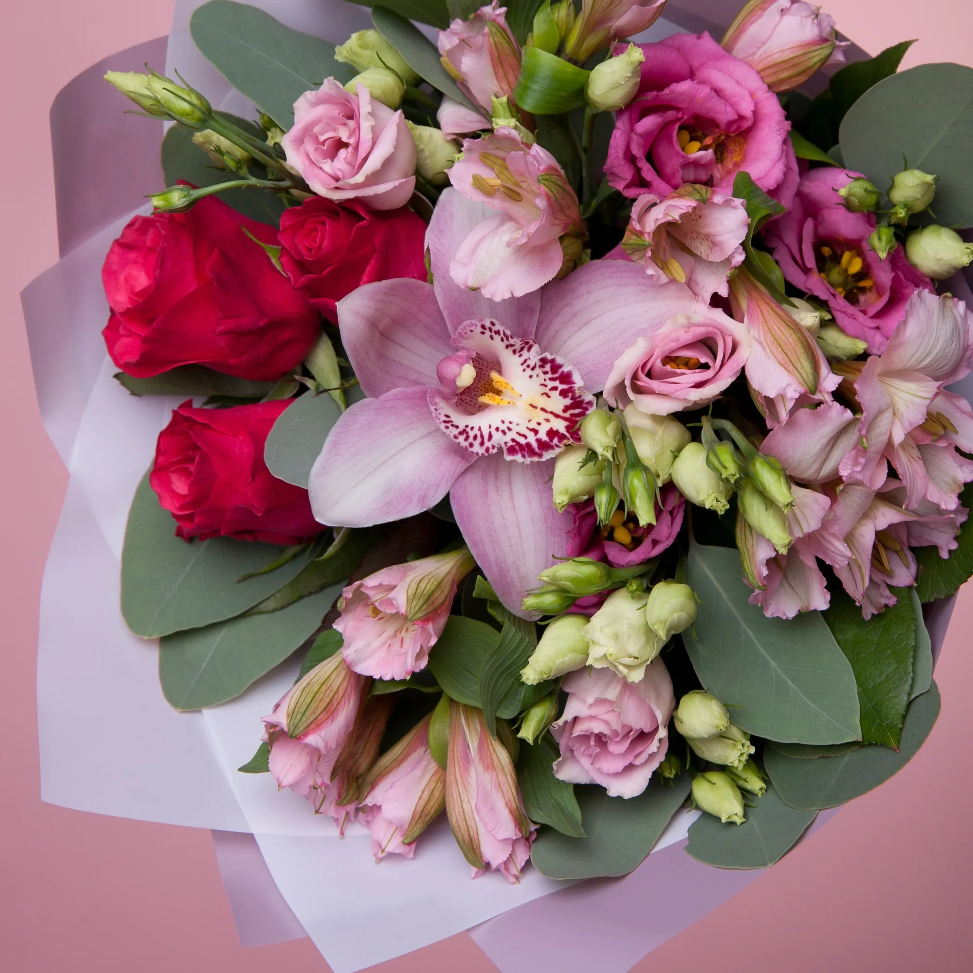 Орхидея, Роза, Альстромерия, Листья салал, Листья эвкалипта