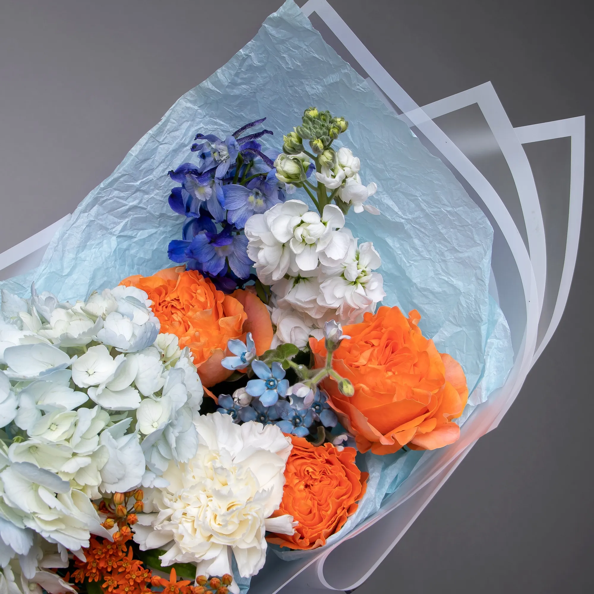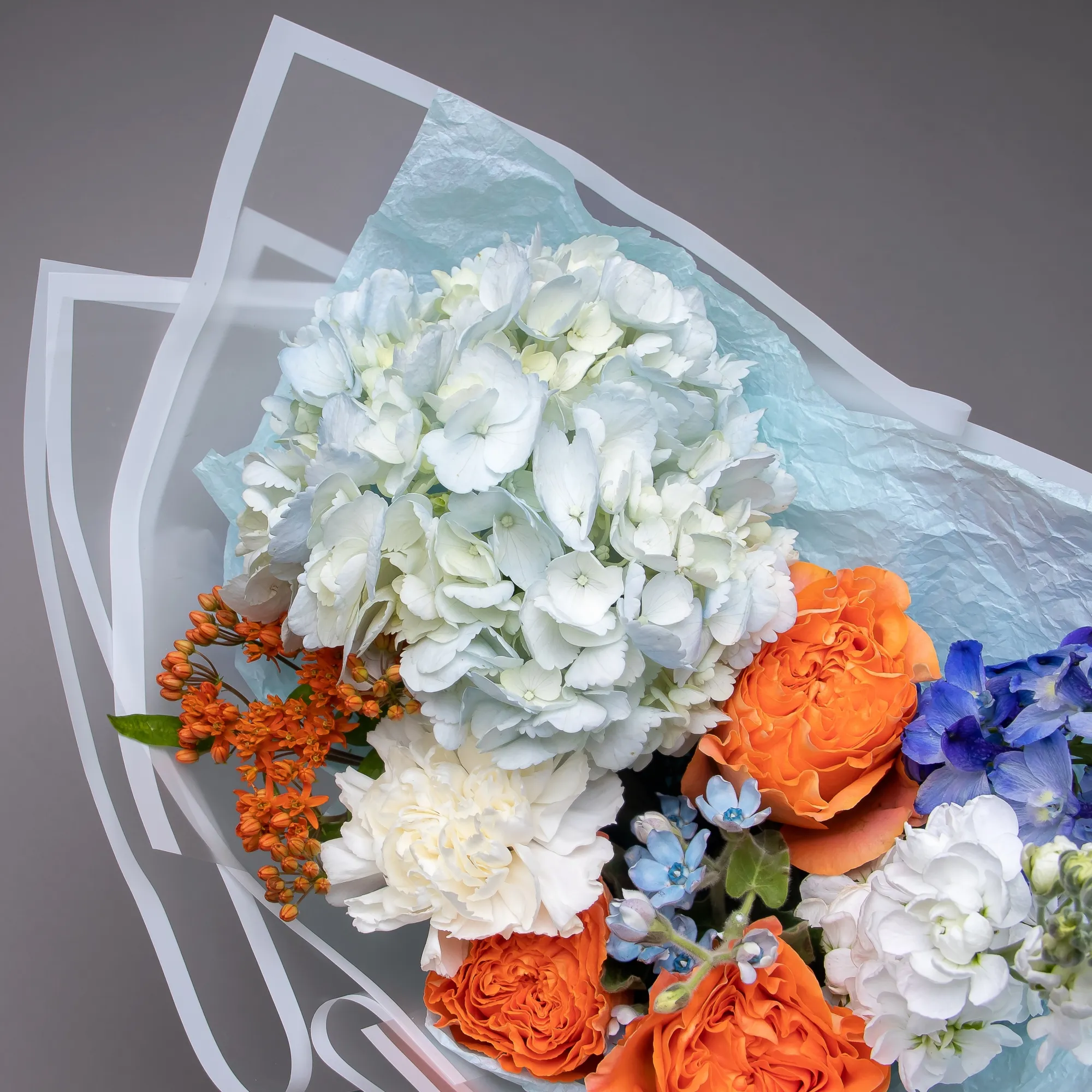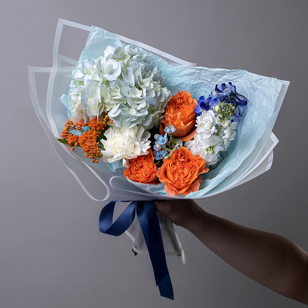 Гвоздика-1, Гортензия-1, Роза-3, Маттиола-1, Дельфиниум-1, Оксипеталум-1, Листья фисташки-3