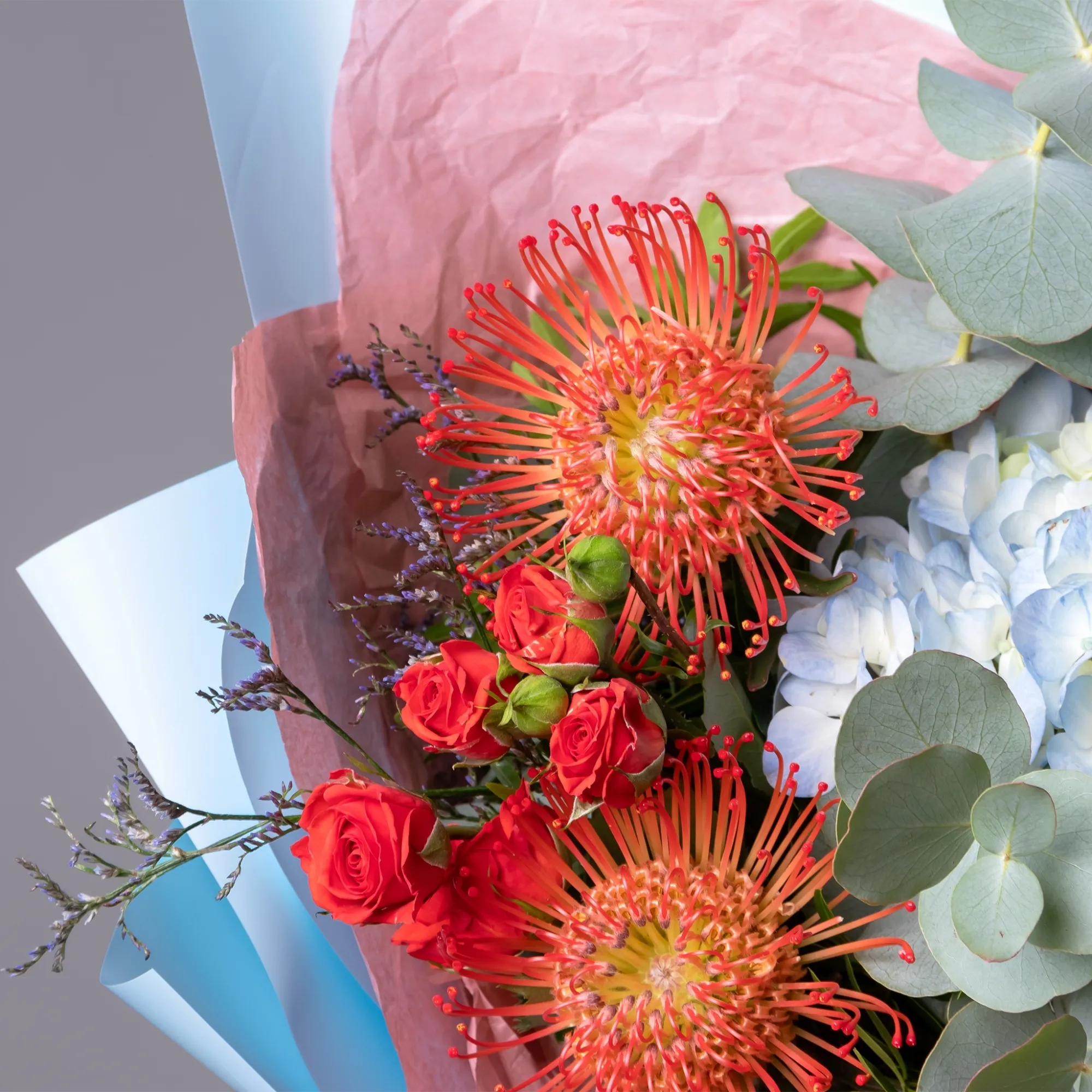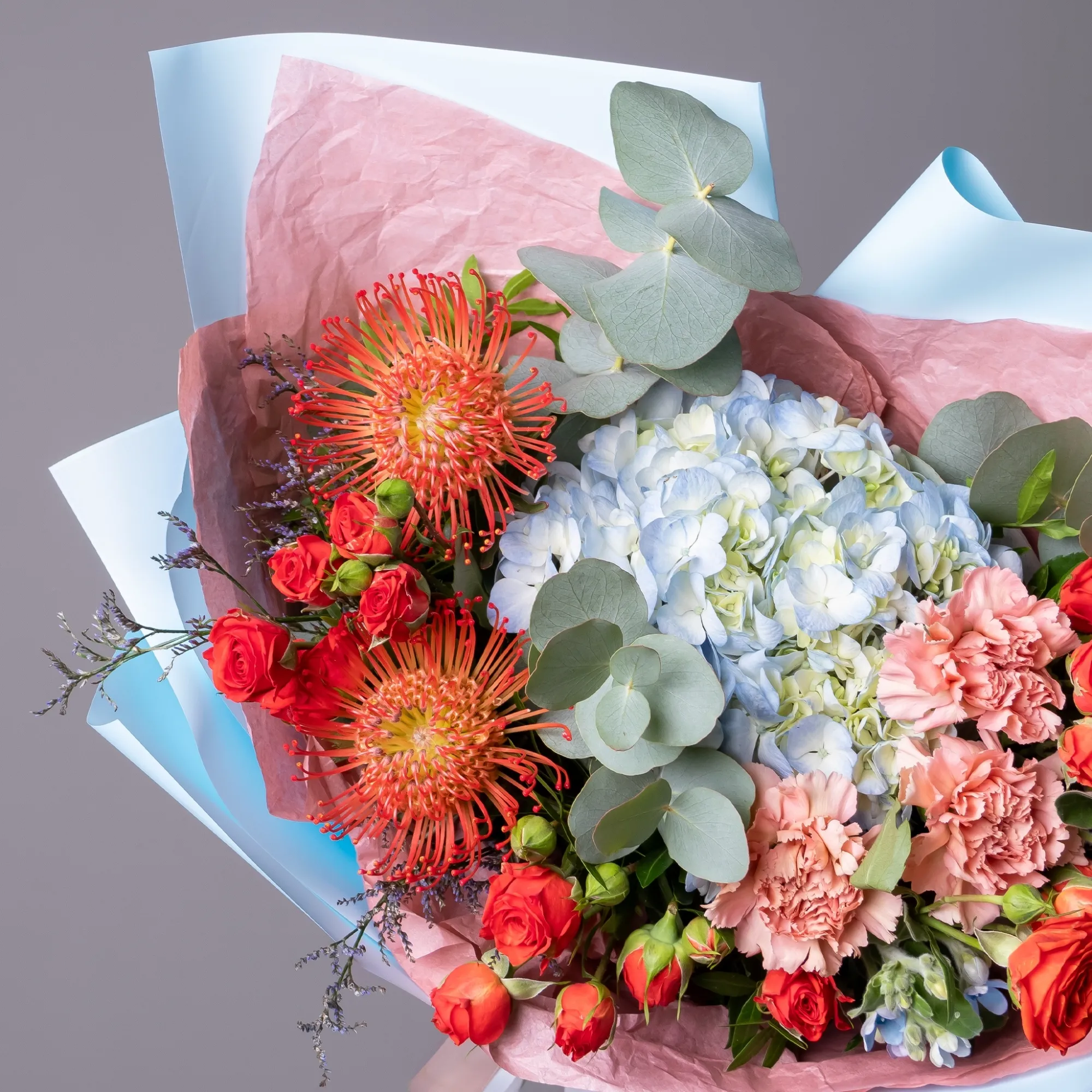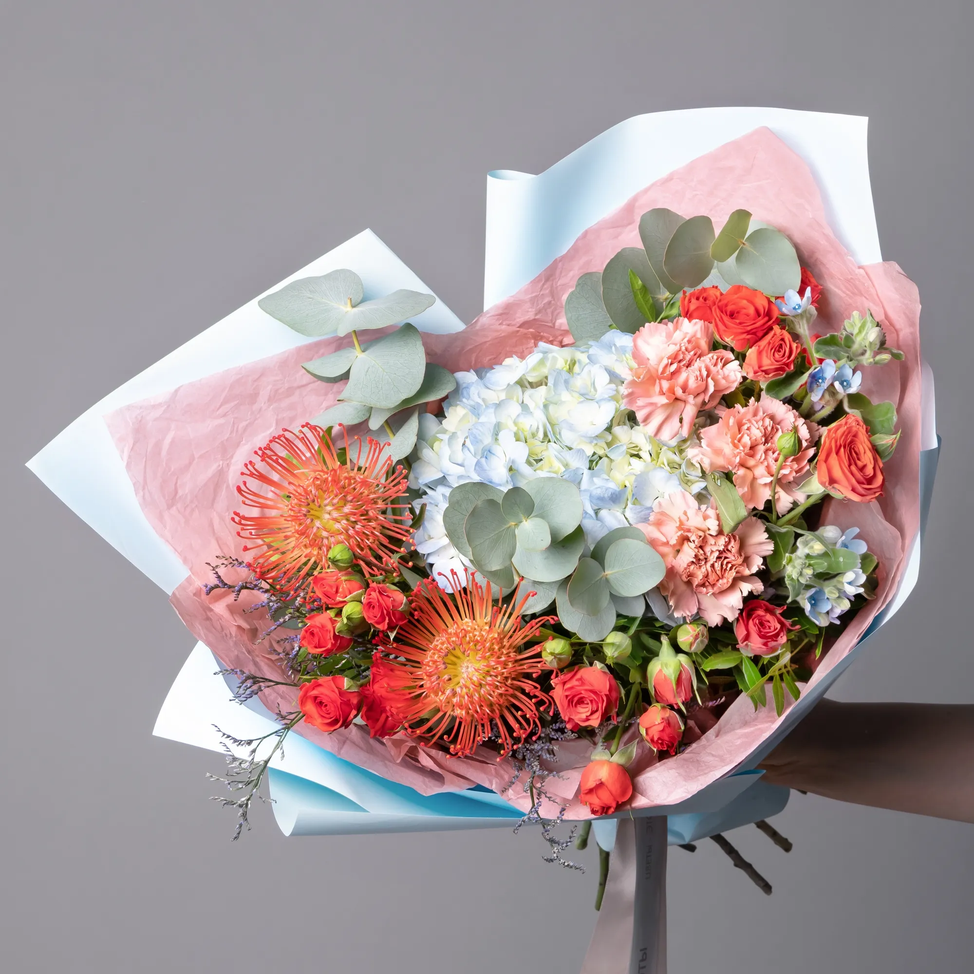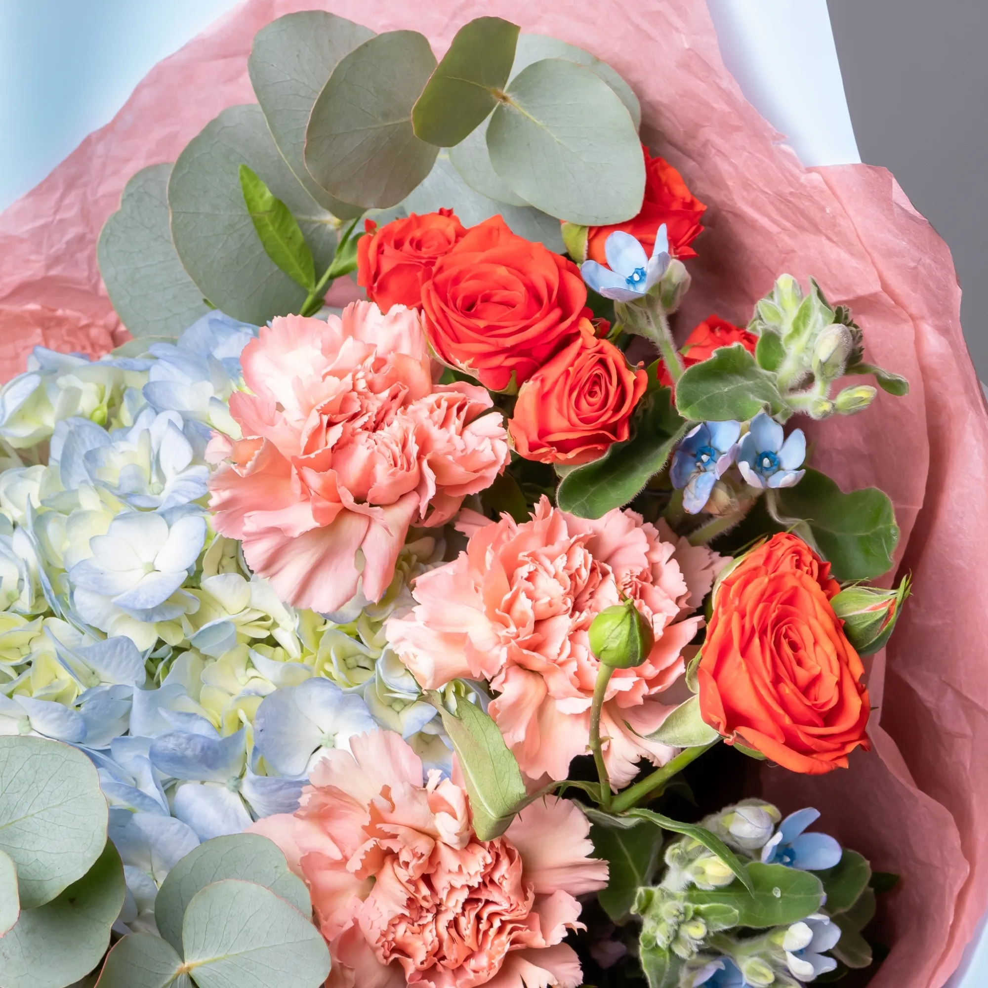 Гвоздика-3, Гортензия-1, Роза кустовая-3, Нутан-2, Оксипеталум-2, Листья фисташки-3, Листья эвкалипта-1