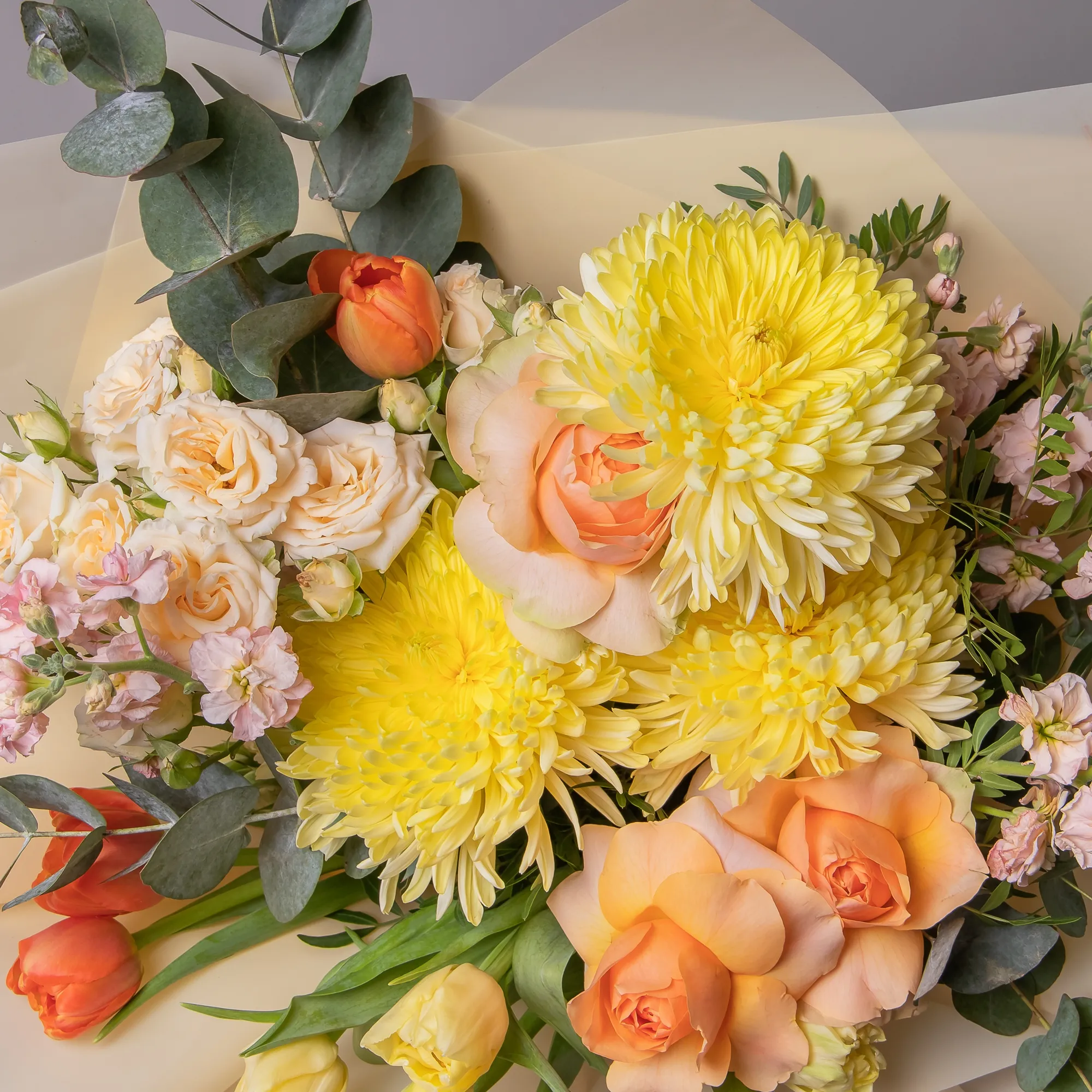 Роза-3, Тюльпан-8, Хризантема-3, Маттиола-3, Роза кустовая-1, Листья фисташки-3, Листья эвкалипта-3