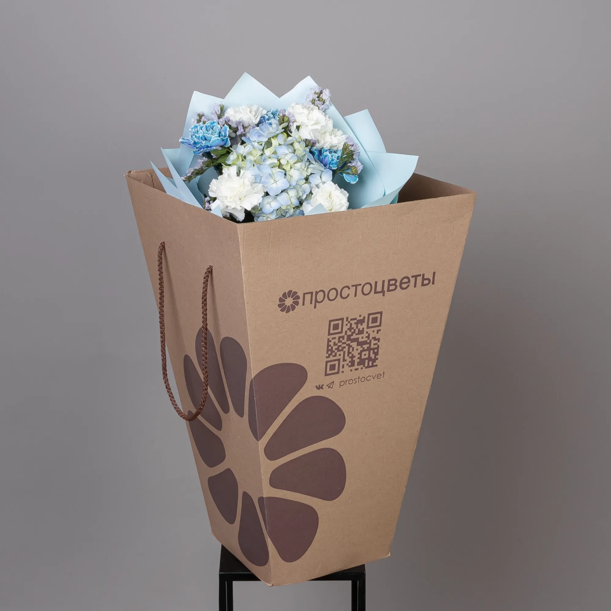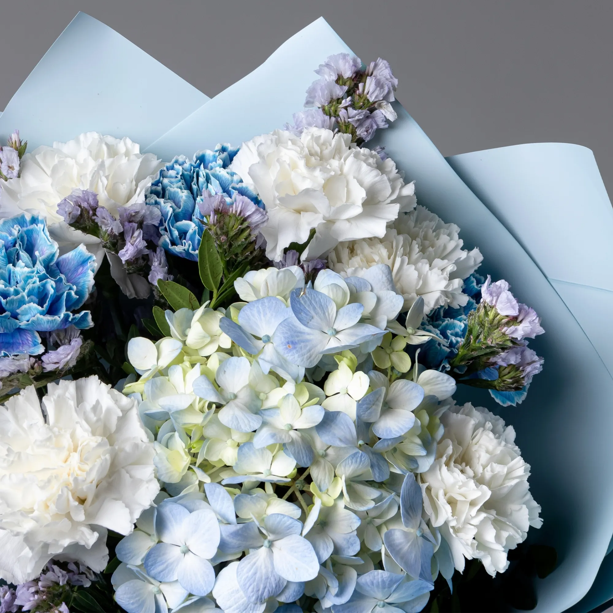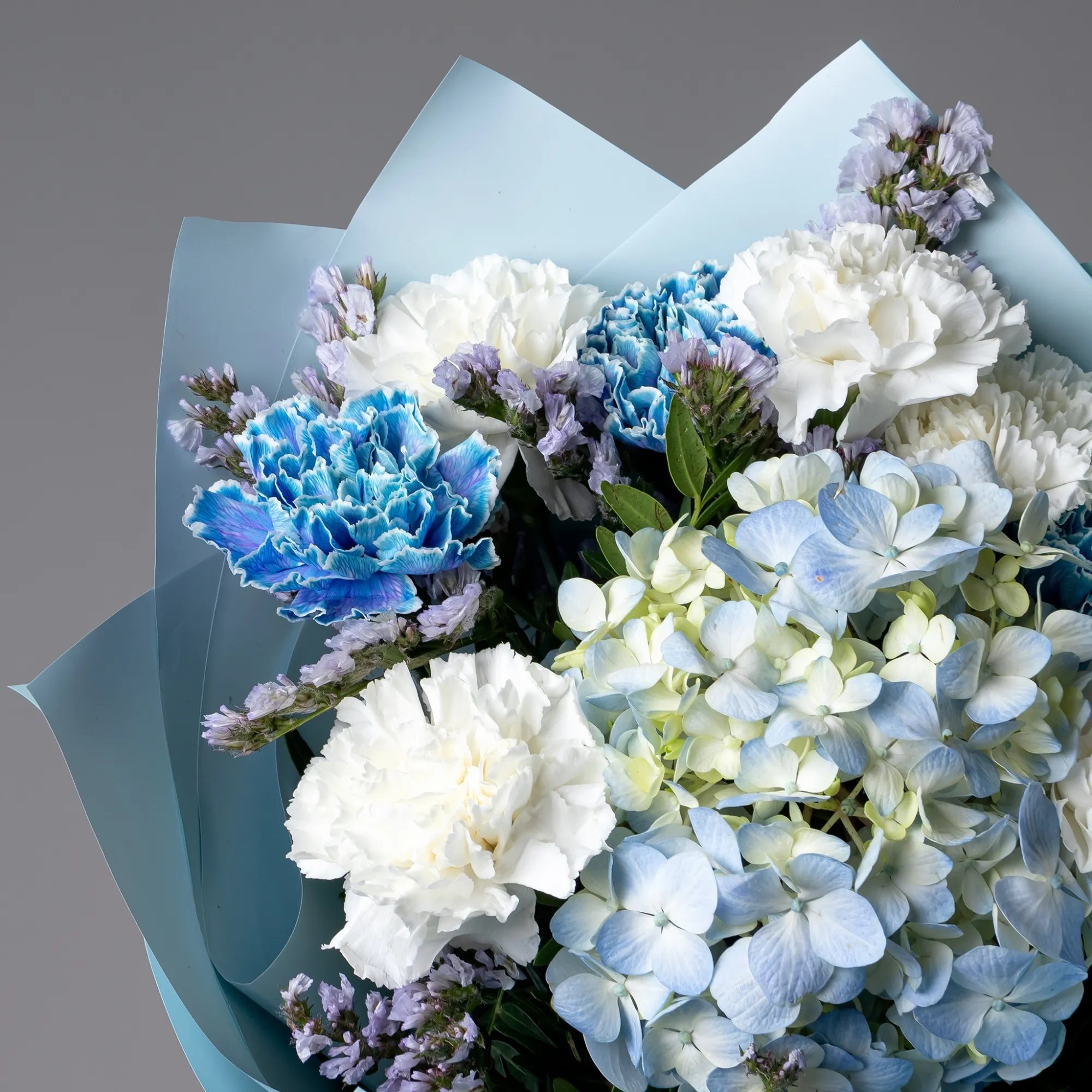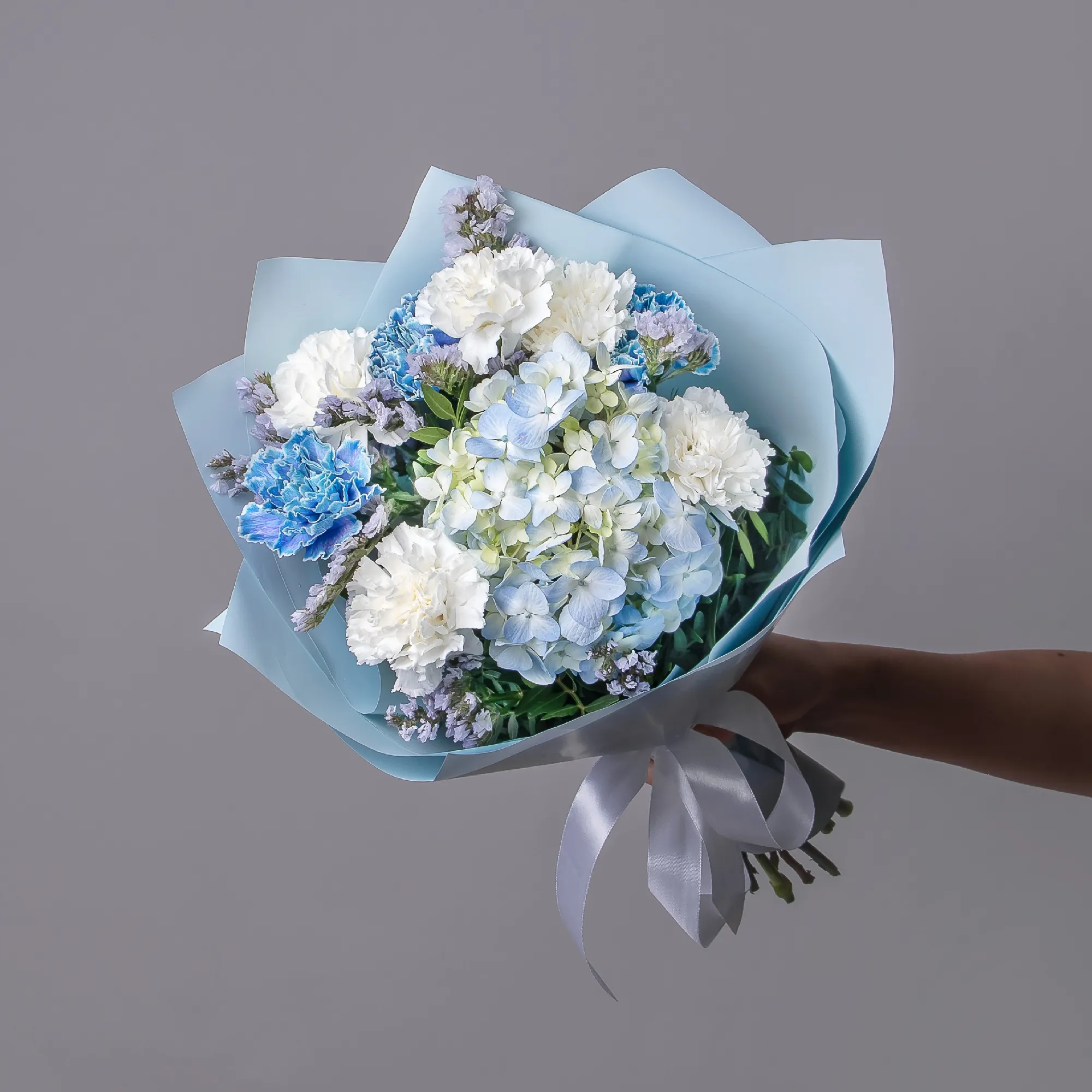 “Небесная гармония” – это воплощение утонченности и нежности в каждом лепестке. В центре композиции величественно располагается крупнолистовая гортензия нежно-синего оттенка, придающая букету пышность и легкость. Вокруг гортензии сгруппированы три гвоздики градиентно нежно-синего цвета, которые плавно переходят от светлого к более насыщенному оттенку, создавая цветовые акценты и продолжая основной мотив.