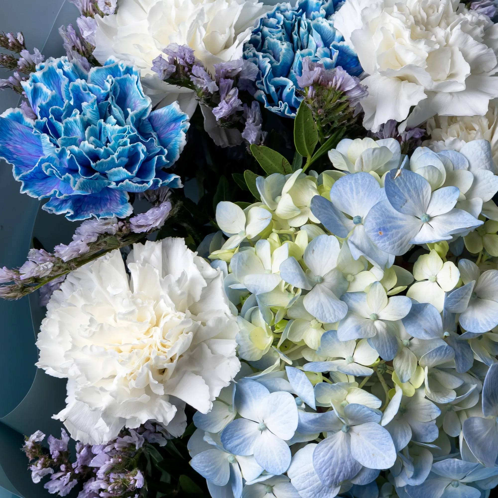 Три белые гвоздики размещены вокруг центральной части, добавляя свежести и элегантности. Завершают композицию две ветки статицы с синими цветками, придающие дополнительную текстуру и визуальную глубину. Нежные маленькие листья фисташки гармонично вписываются в общую картину, добавляя природную нотку.