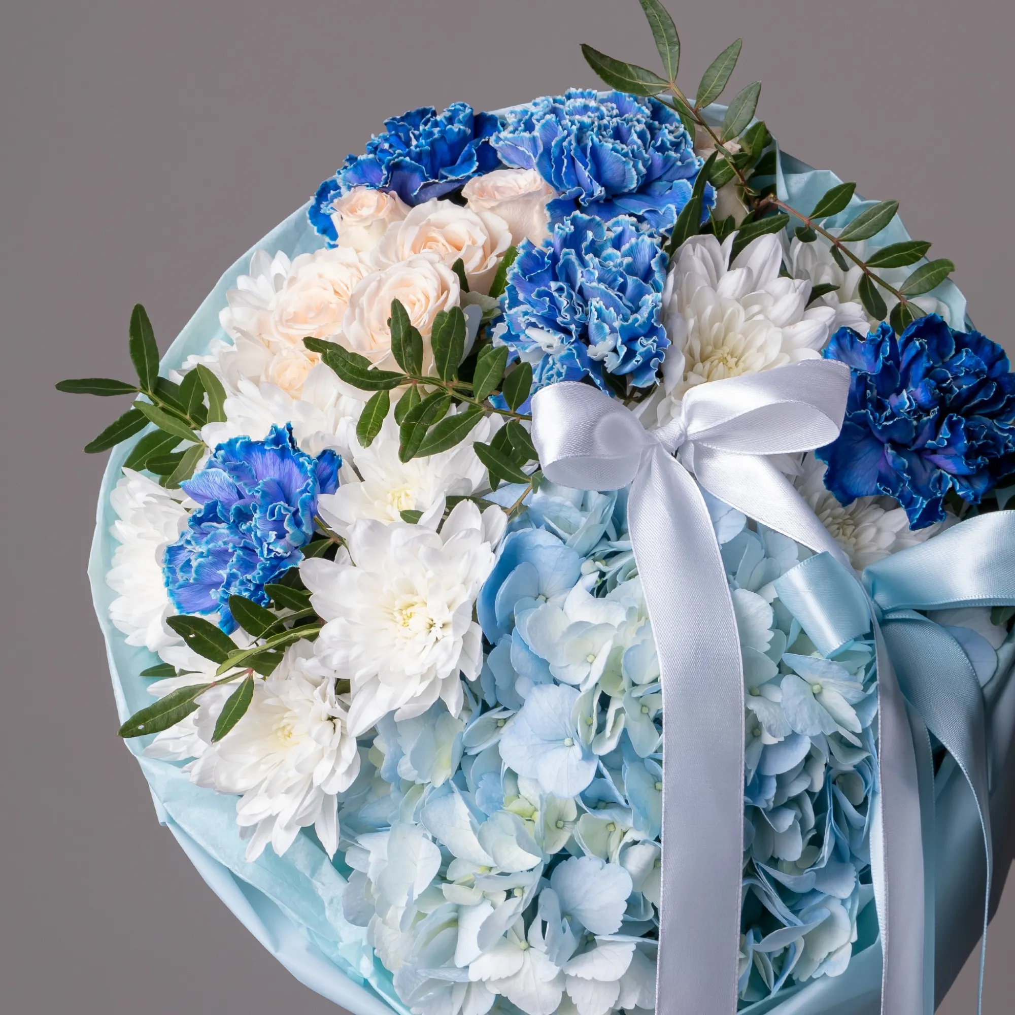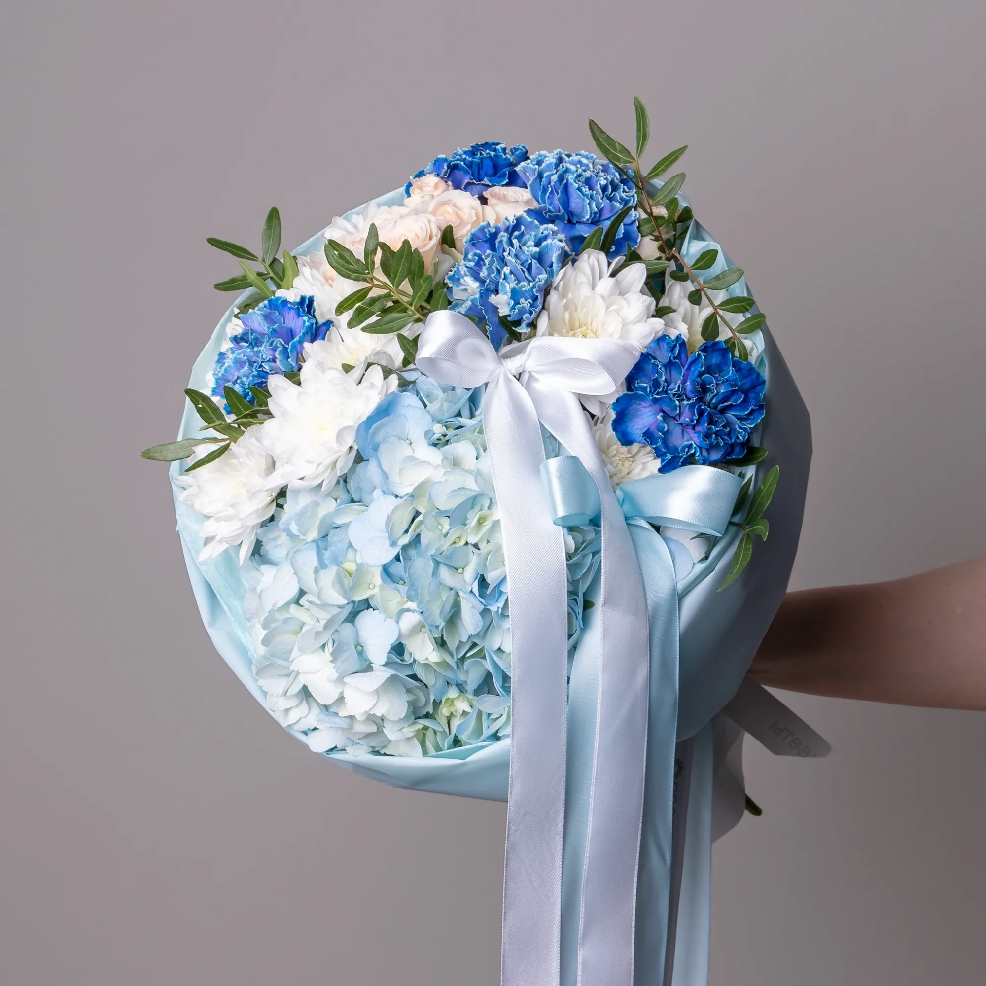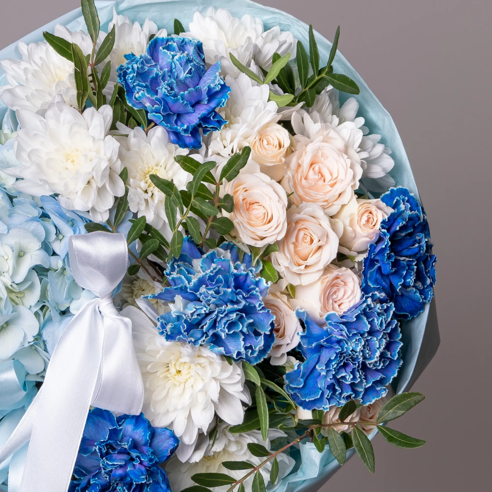 В составе букета "Небесное счастье M" кустовая роза "Софи", белая хризантема, голубая гидрангия, голубая гвоздика, дополнен листьями фисташки. Идеально подойдет для *Предложение руки и сердца* - нежная композиция в пастельных тонах создаст романтичную атмосферу для важного момента, также подходит для *Годовщины свадьбы* - изысканный букет в голубых оттенках символизирует верность и постоянство, идеально подойдет для празднования годовщины. Закажите букет с доставкой или заберите самовывозом. И помните, что цветы - это просто.